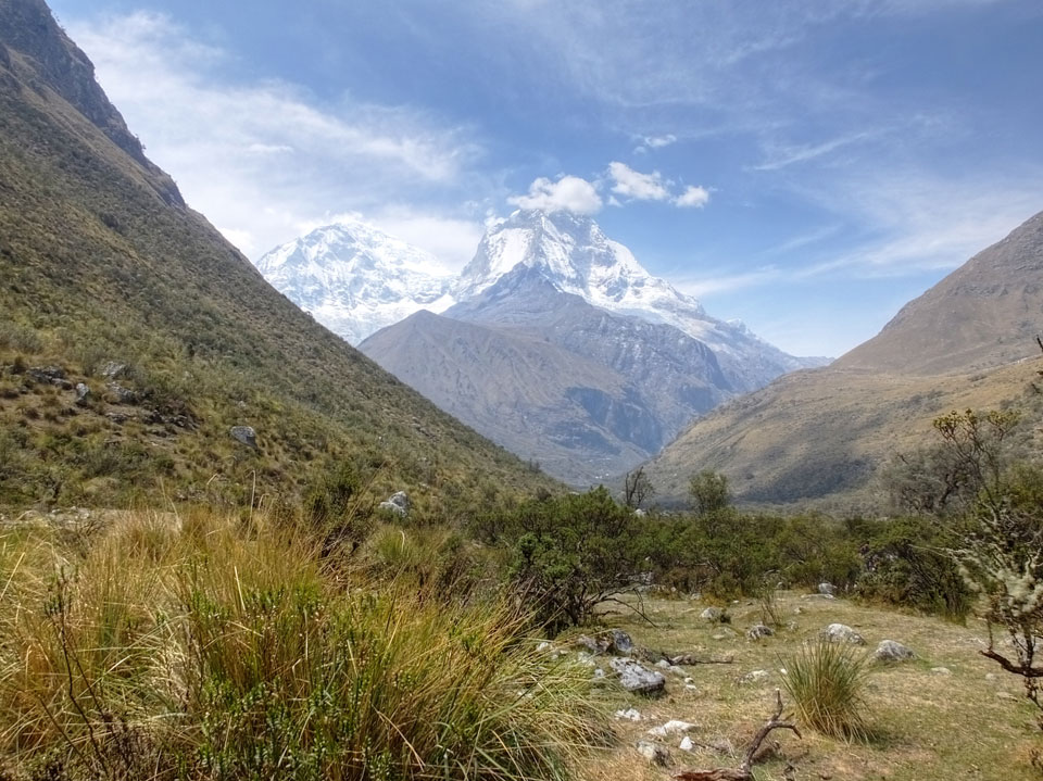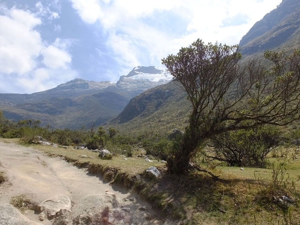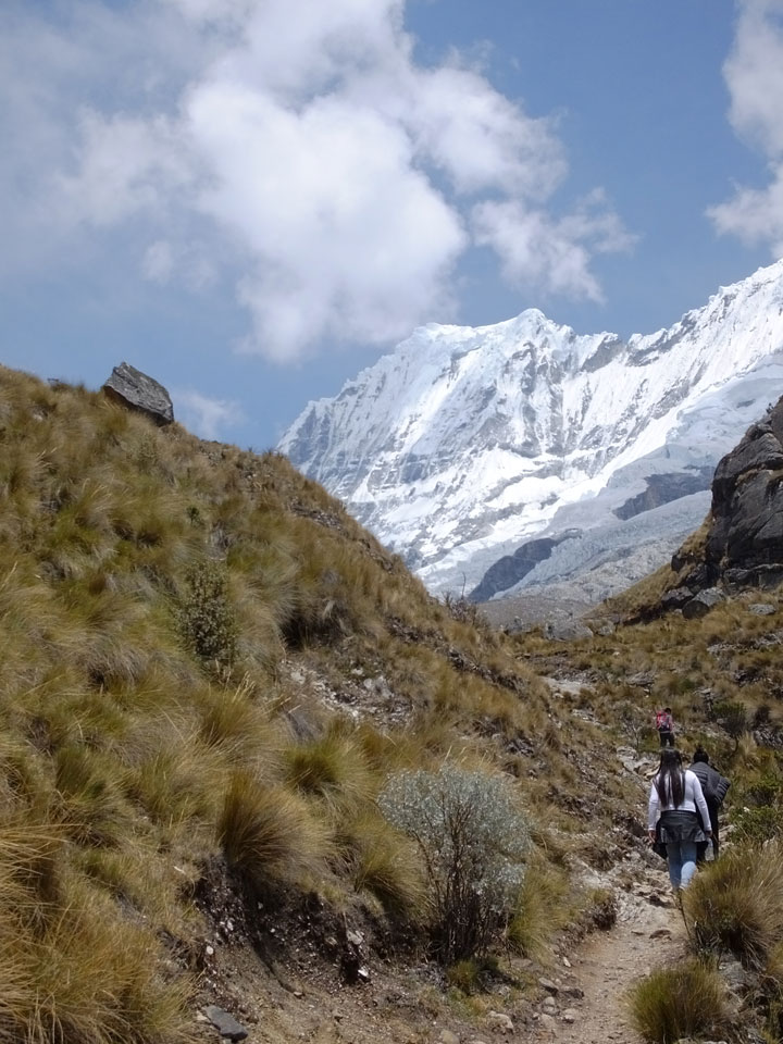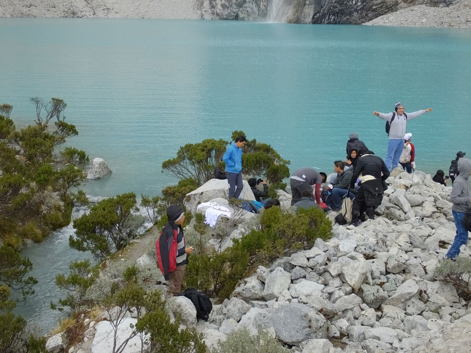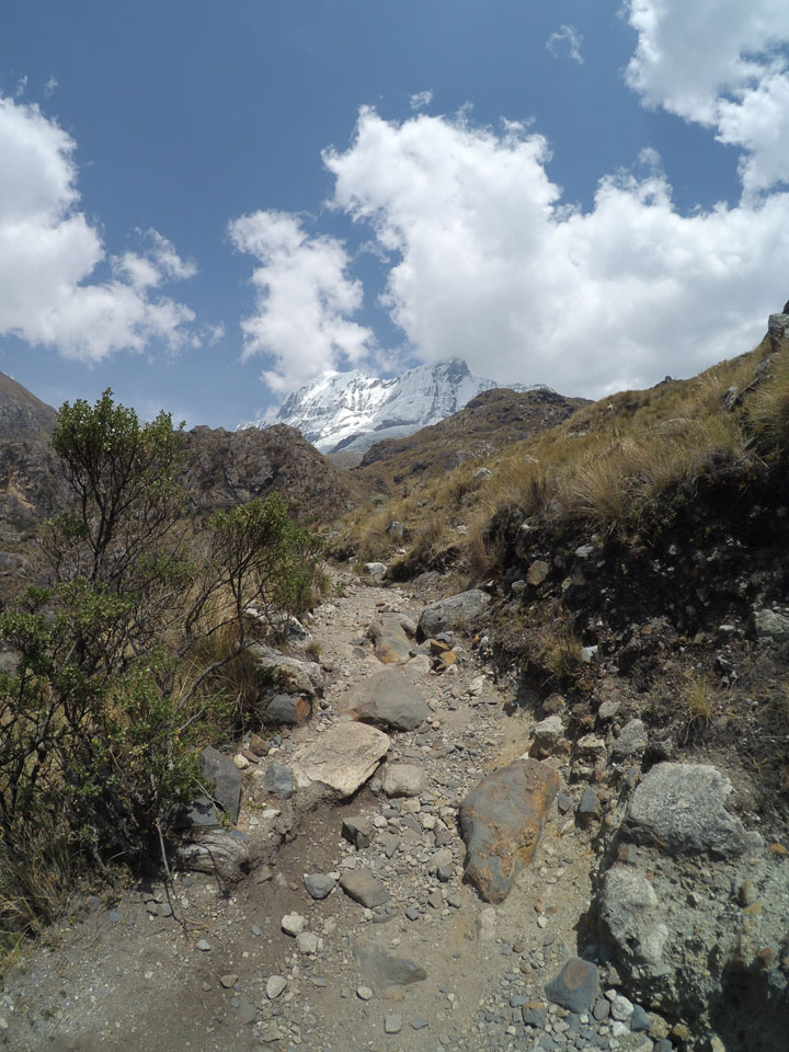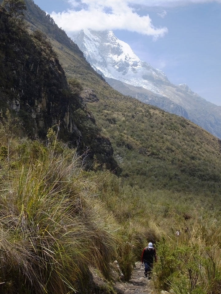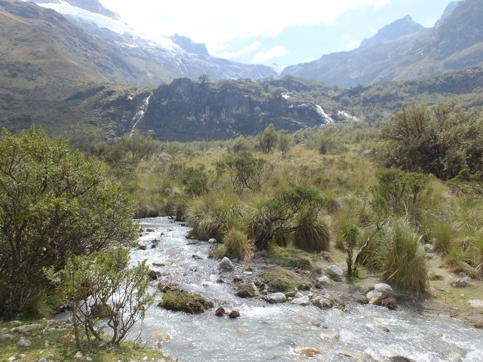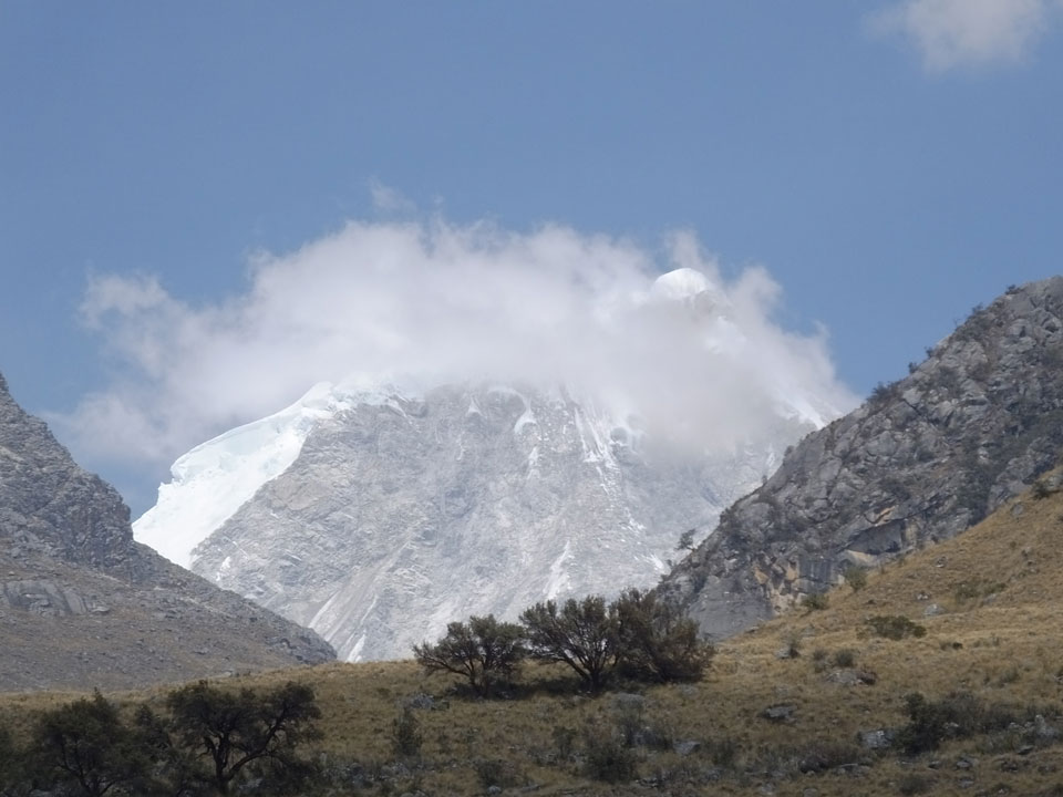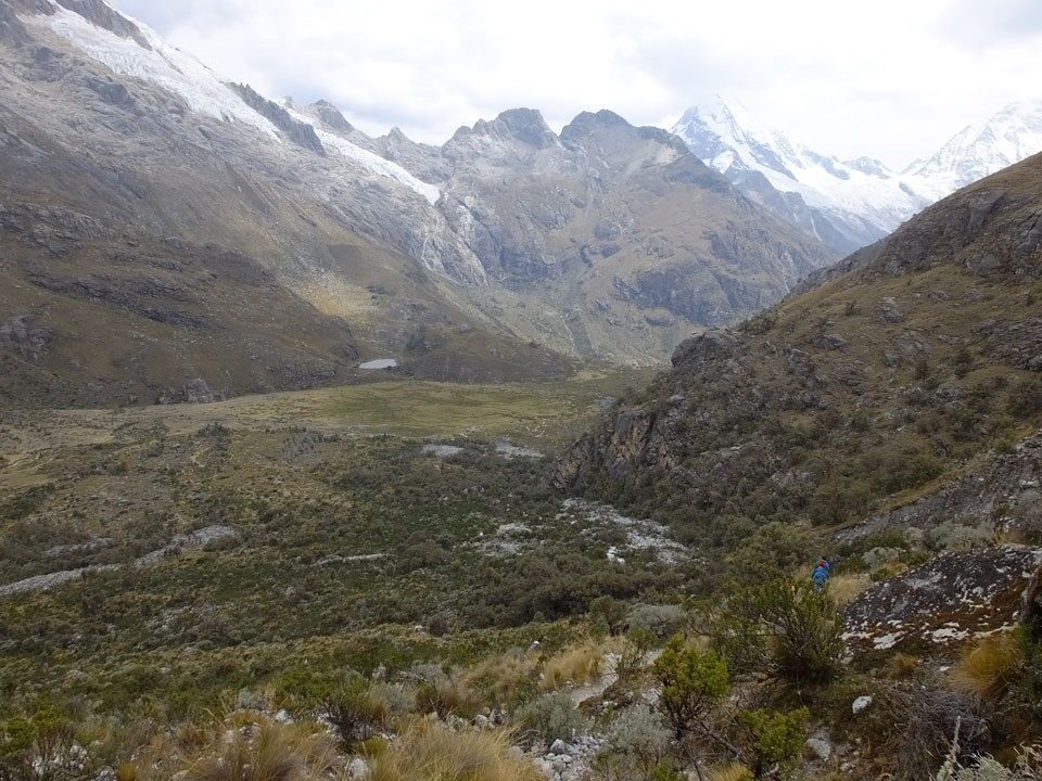 Der Huascan, mit über 6000m der höchste Berg Perus, thronte hinter uns. Ich drehte mich deswegen oft um, weil die Gegend einfach fantastisch aussah. Ringsum Berge, perfektes Wetter und ein gut ausgetretener Weg. Nach einer guten Stunde flachen Pfades, ging es dann bergauf. Vorbei an Wasserfällen ging es immer weiter in die Höhe, was ich doch mit der Puste merkte. Ich ging öfters mal schneller an Leuten vorbei und schloss dabei meinen Mund, versuchte nur über die Nase zu atmen. Ha! Die Rechnung folgte auf dem Fuß, weil ich dann schnell atemlos war. Der Egotrip, Höhenfitness zu faken, gab gute Schwindelanfälle.