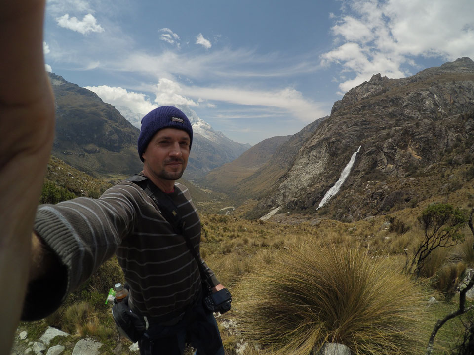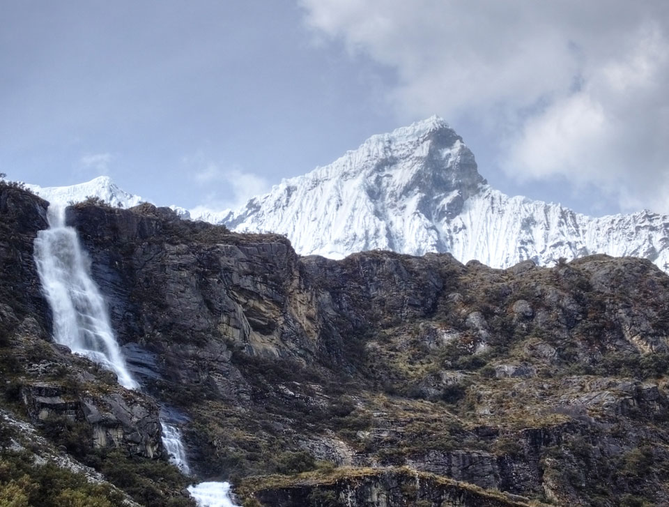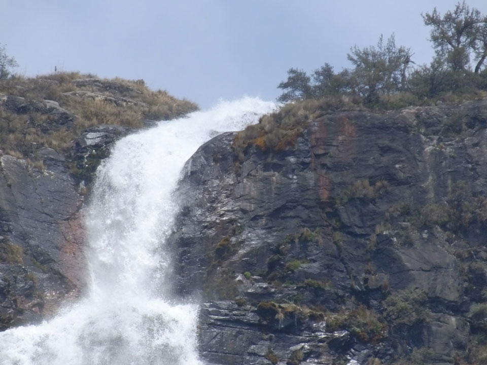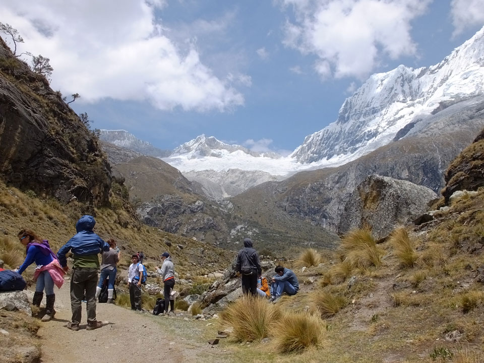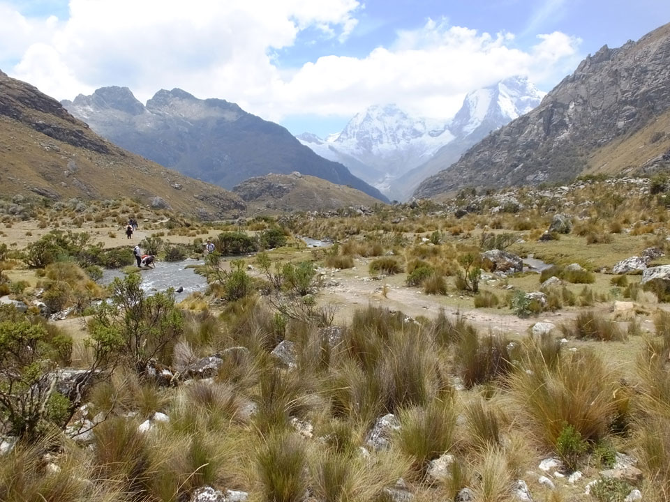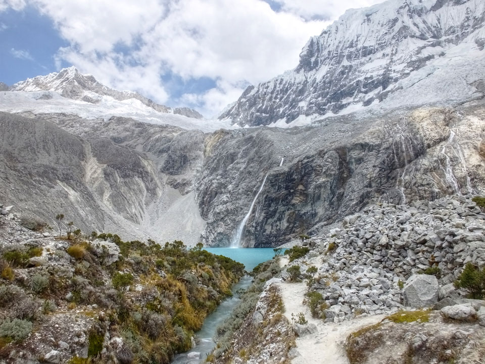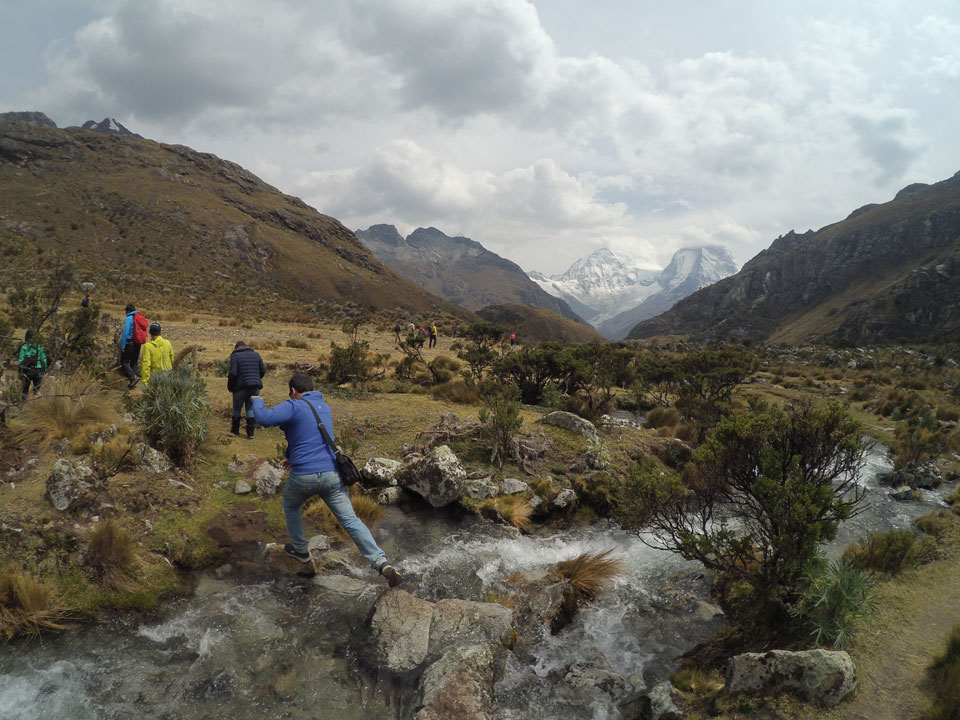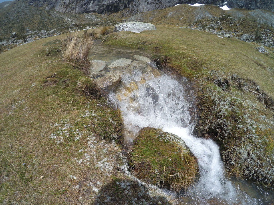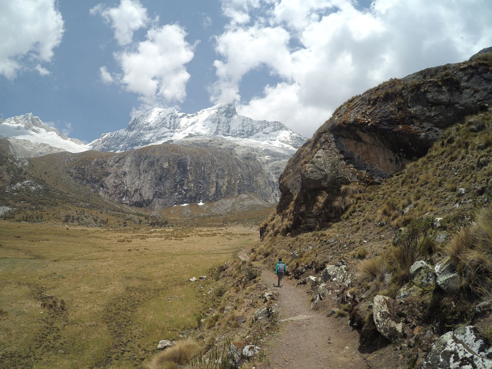 Der Huascan, mit über 6000m der höchste Berg Perus, thronte hinter uns. Ich drehte mich deswegen oft um, weil die Gegend einfach fantastisch aussah. Ringsum Berge, perfektes Wetter und ein gut ausgetretener Weg. Nach einer guten Stunde flachen Pfades, ging es dann bergauf. Vorbei an Wasserfällen ging es immer weiter in die Höhe, was ich doch mit der Puste merkte. Ich ging öfters mal schneller an Leuten vorbei und schloss dabei meinen Mund, versuchte nur über die Nase zu atmen. Ha! Die Rechnung folgte auf dem Fuß, weil ich dann schnell atemlos war. Der Egotrip, Höhenfitness zu faken, gab gute Schwindelanfälle.