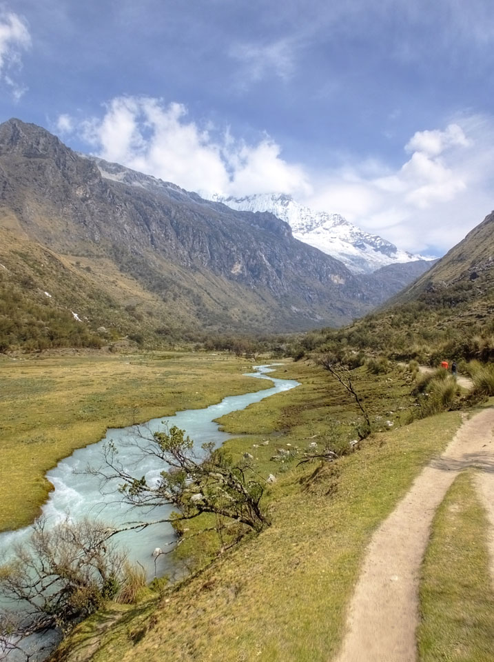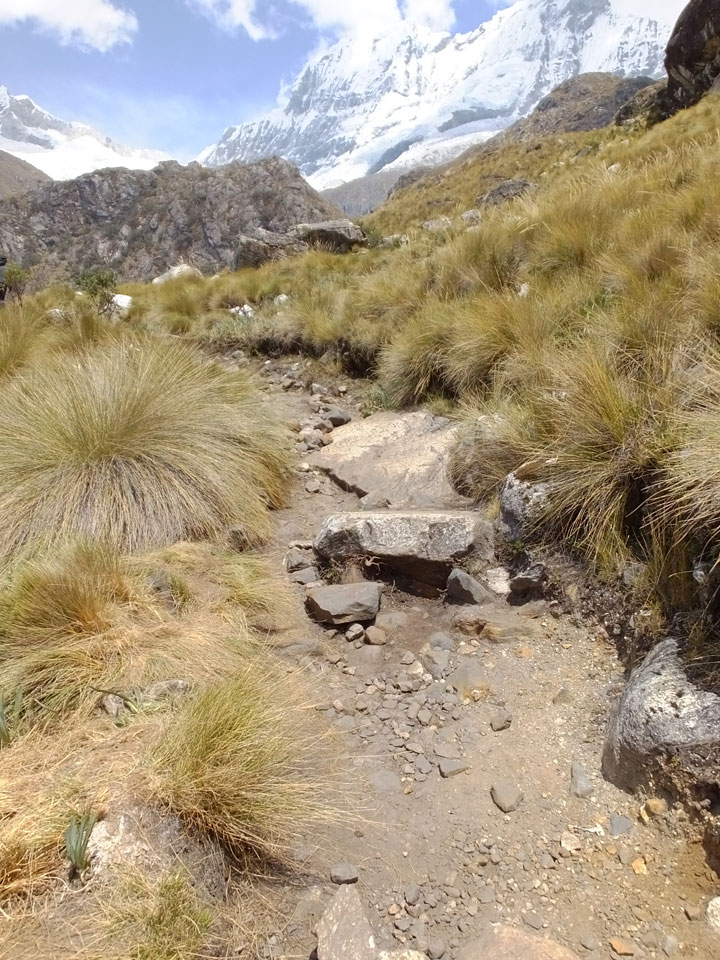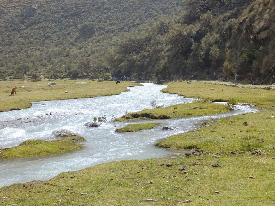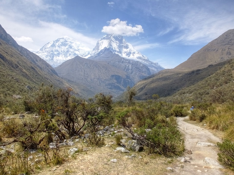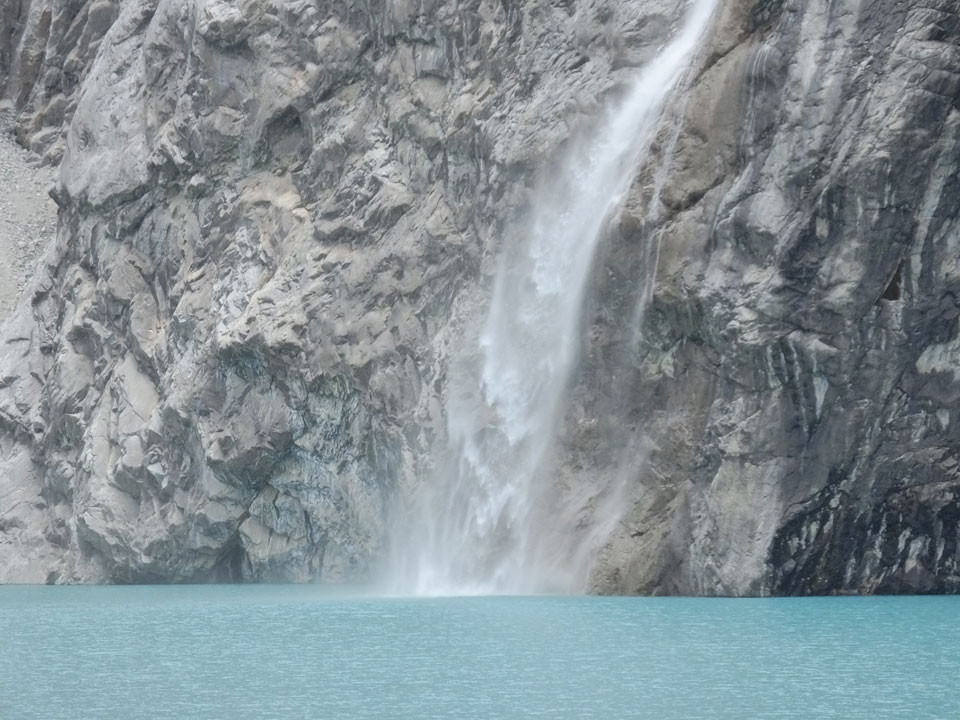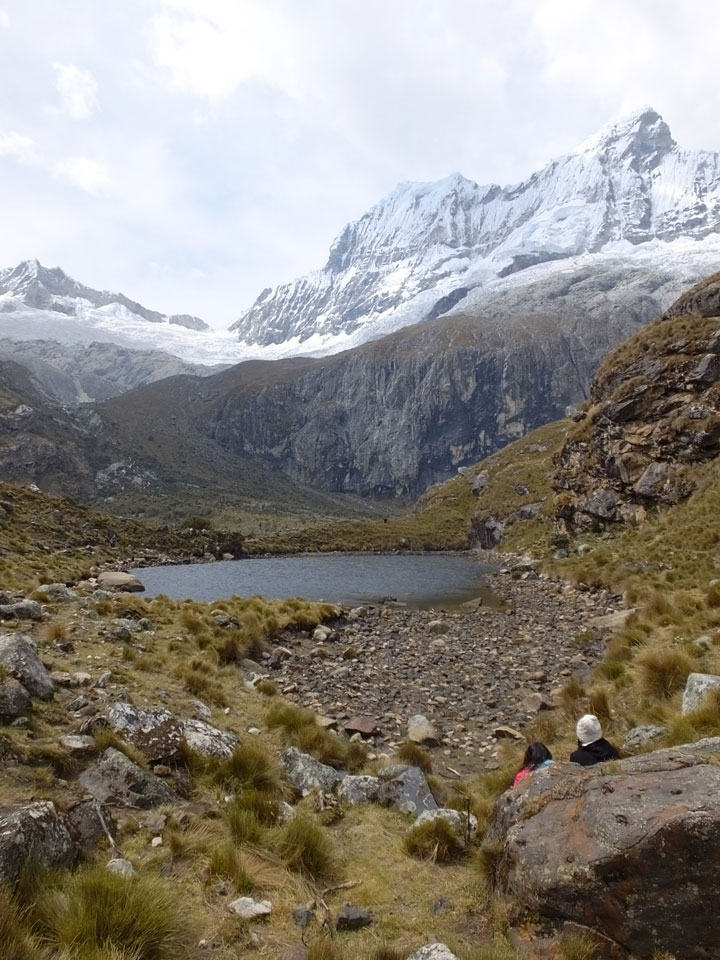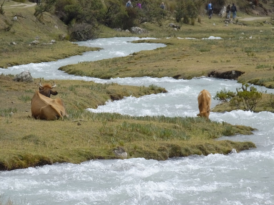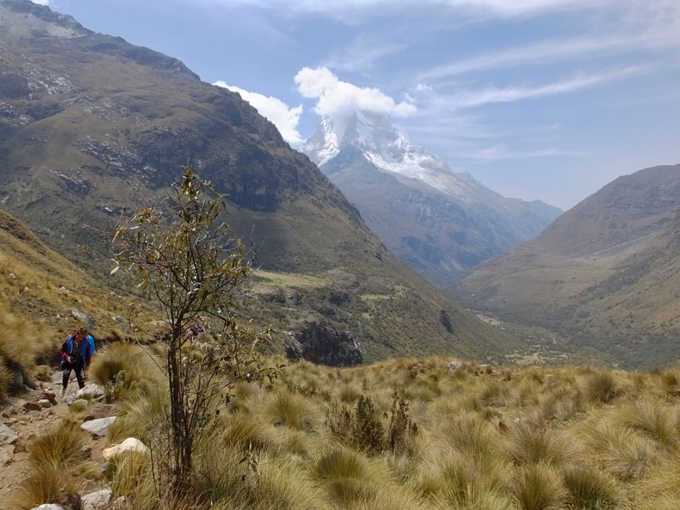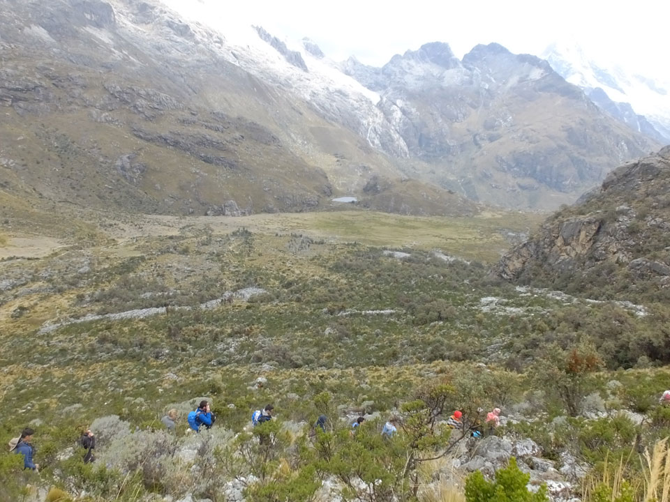 Der Huascan, mit über 6000m der höchste Berg Perus, thronte hinter uns. Ich drehte mich deswegen oft um, weil die Gegend einfach fantastisch aussah. Ringsum Berge, perfektes Wetter und ein gut ausgetretener Weg. Nach einer guten Stunde flachen Pfades, ging es dann bergauf. Vorbei an Wasserfällen ging es immer weiter in die Höhe, was ich doch mit der Puste merkte. Ich ging öfters mal schneller an Leuten vorbei und schloss dabei meinen Mund, versuchte nur über die Nase zu atmen. Ha! Die Rechnung folgte auf dem Fuß, weil ich dann schnell atemlos war. Der Egotrip, Höhenfitness zu faken, gab gute Schwindelanfälle.