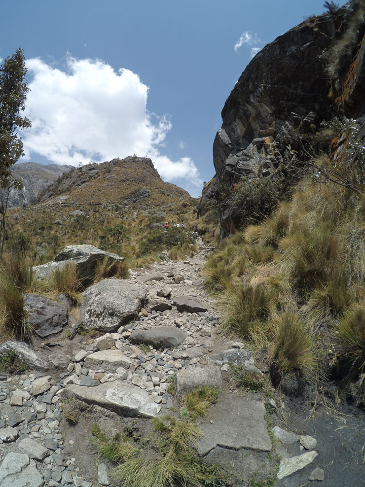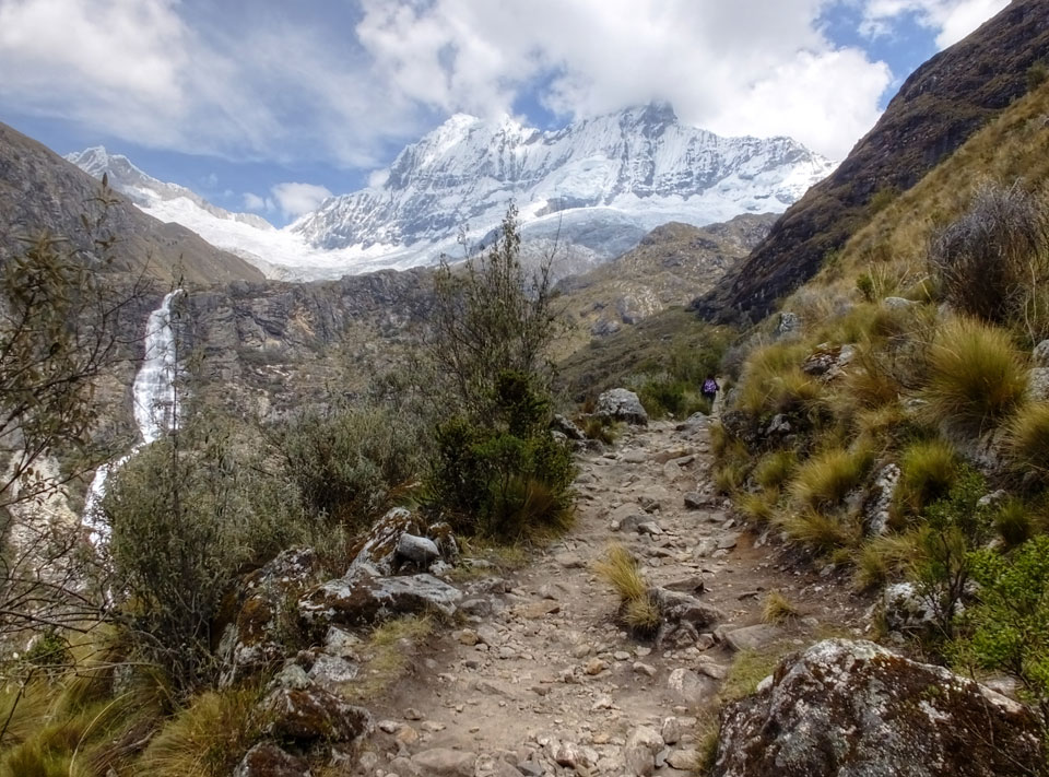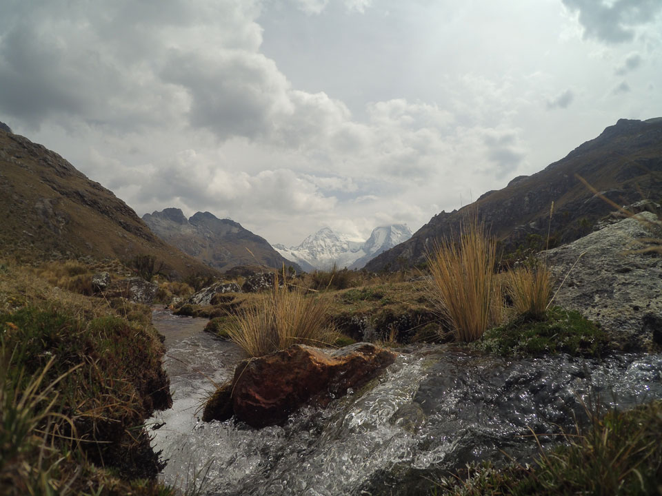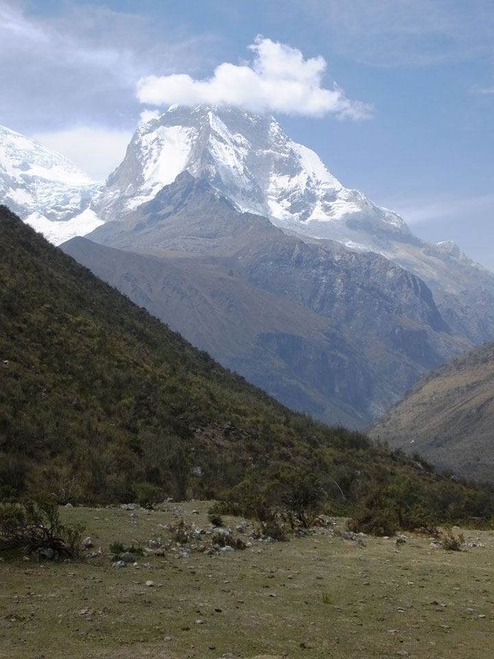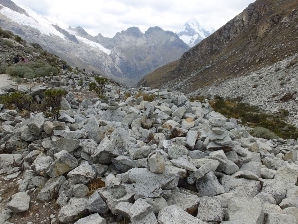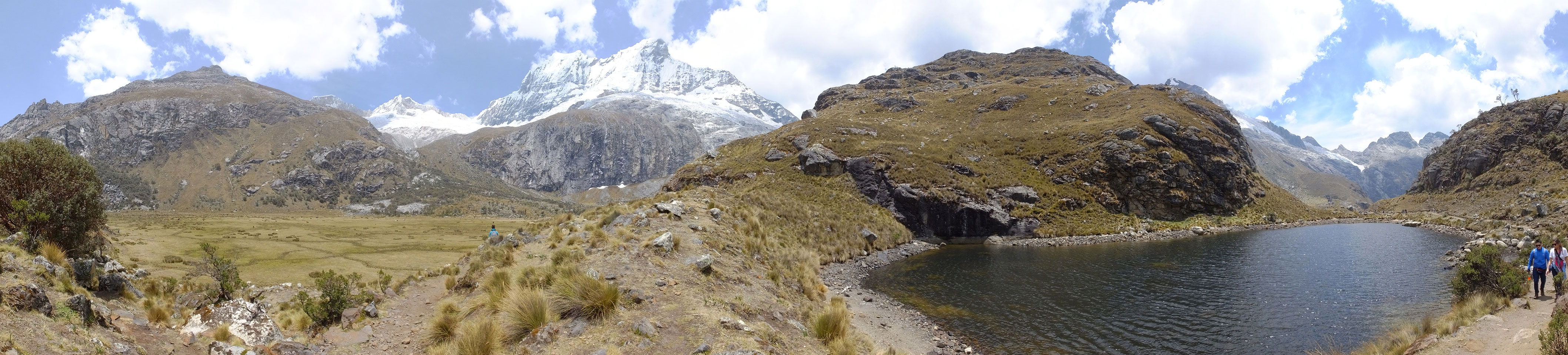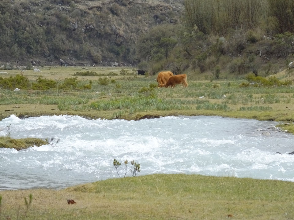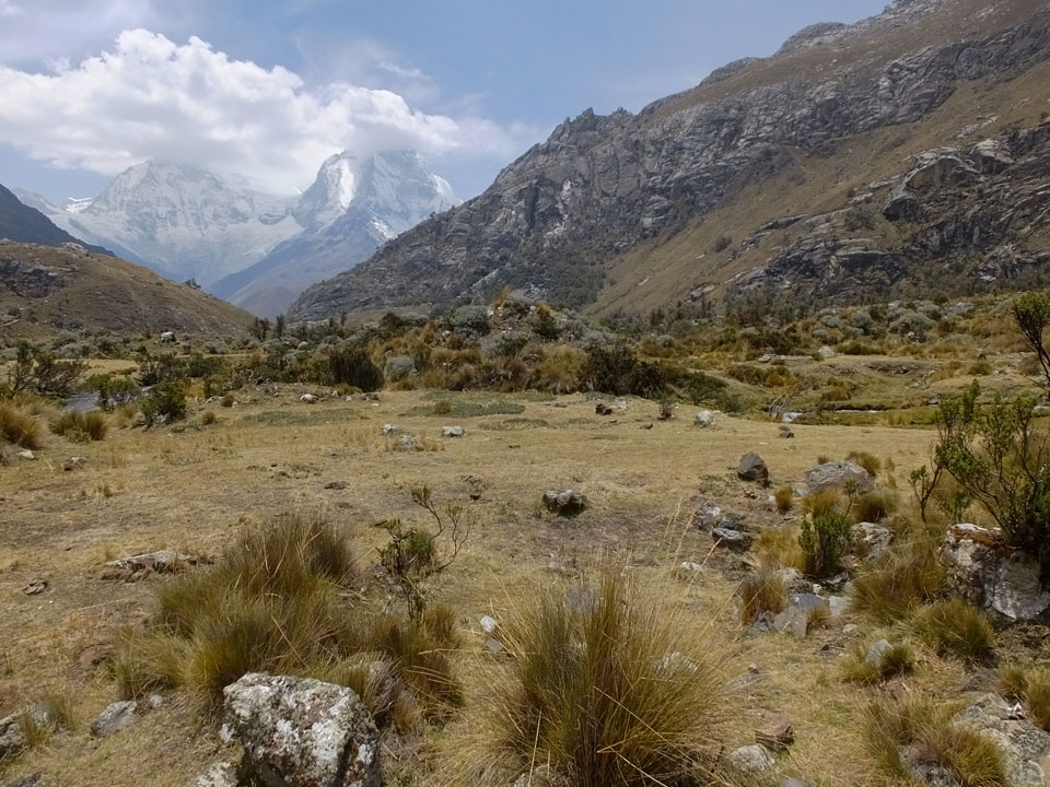 Der Huascan, mit über 6000m der höchste Berg Perus, thronte hinter uns. Ich drehte mich deswegen oft um, weil die Gegend einfach fantastisch aussah. Ringsum Berge, perfektes Wetter und ein gut ausgetretener Weg. Nach einer guten Stunde flachen Pfades, ging es dann bergauf. Vorbei an Wasserfällen ging es immer weiter in die Höhe, was ich doch mit der Puste merkte. Ich ging öfters mal schneller an Leuten vorbei und schloss dabei meinen Mund, versuchte nur über die Nase zu atmen. Ha! Die Rechnung folgte auf dem Fuß, weil ich dann schnell atemlos war. Der Egotrip, Höhenfitness zu faken, gab gute Schwindelanfälle.
