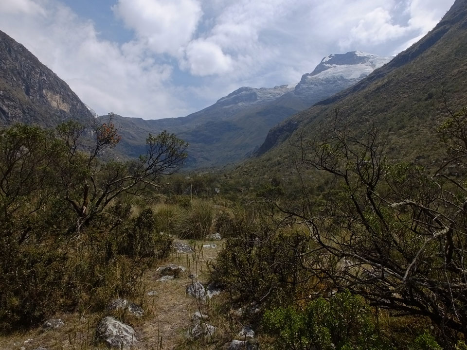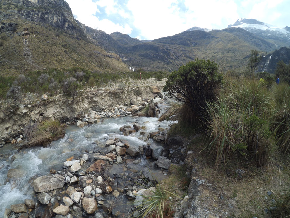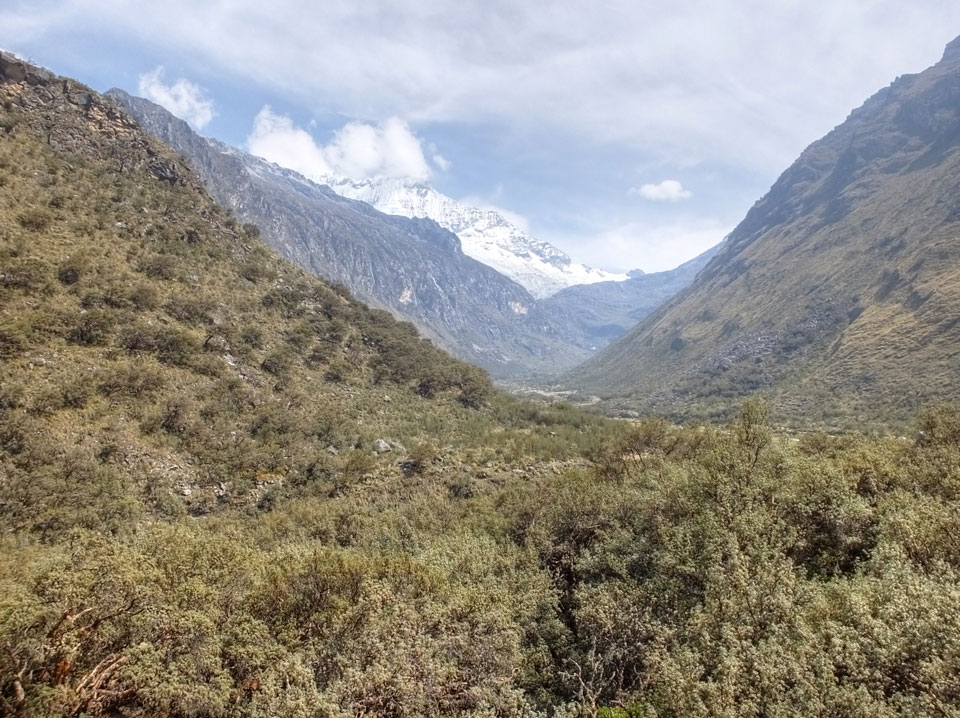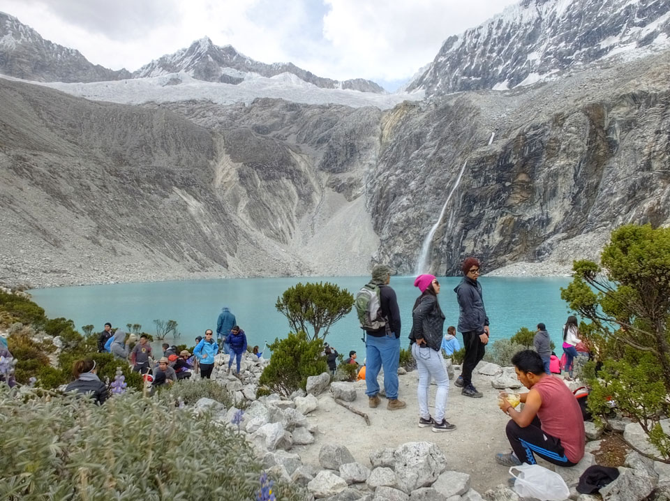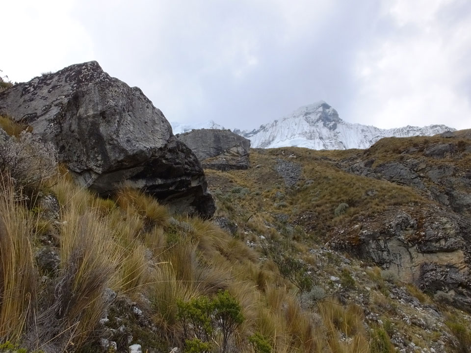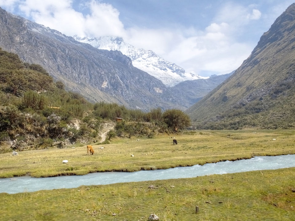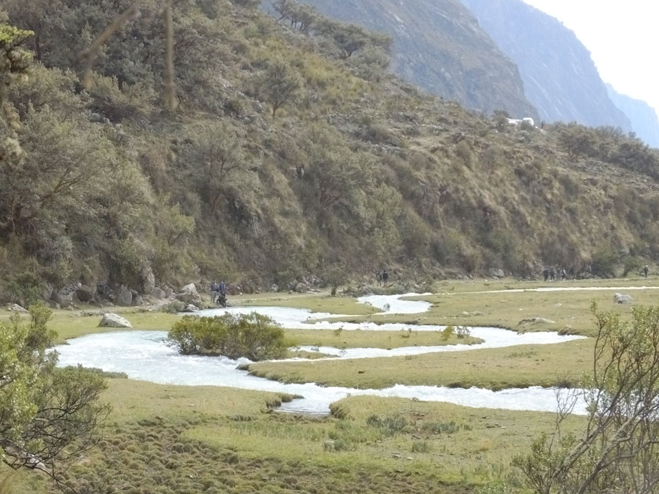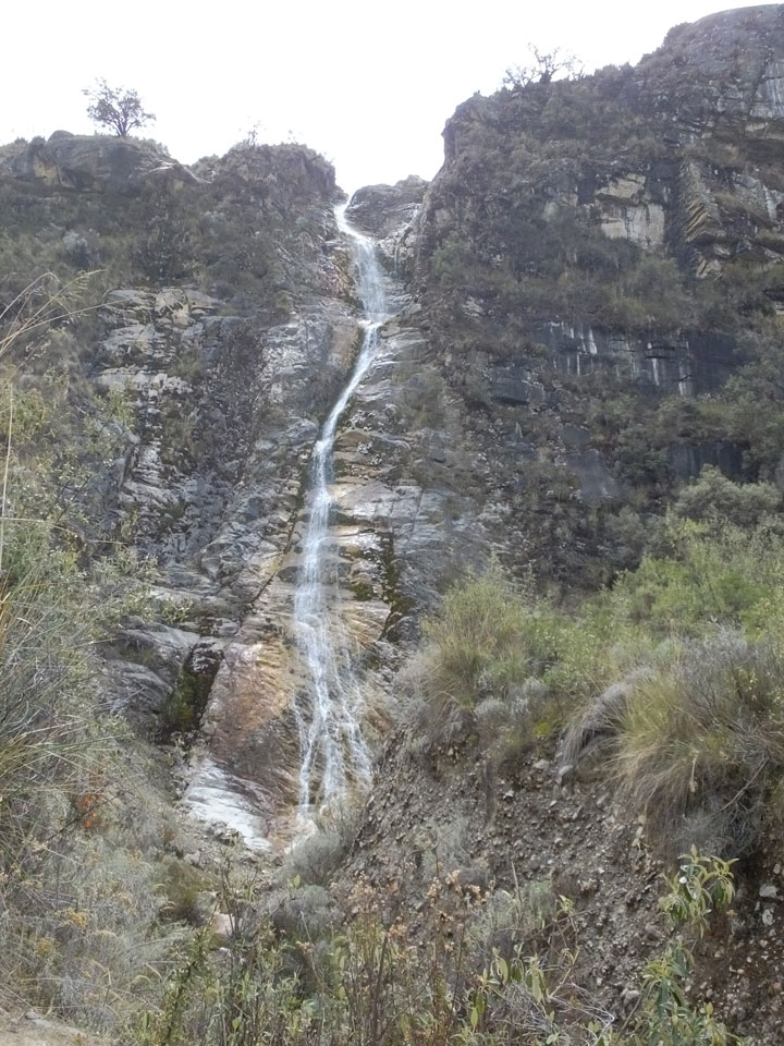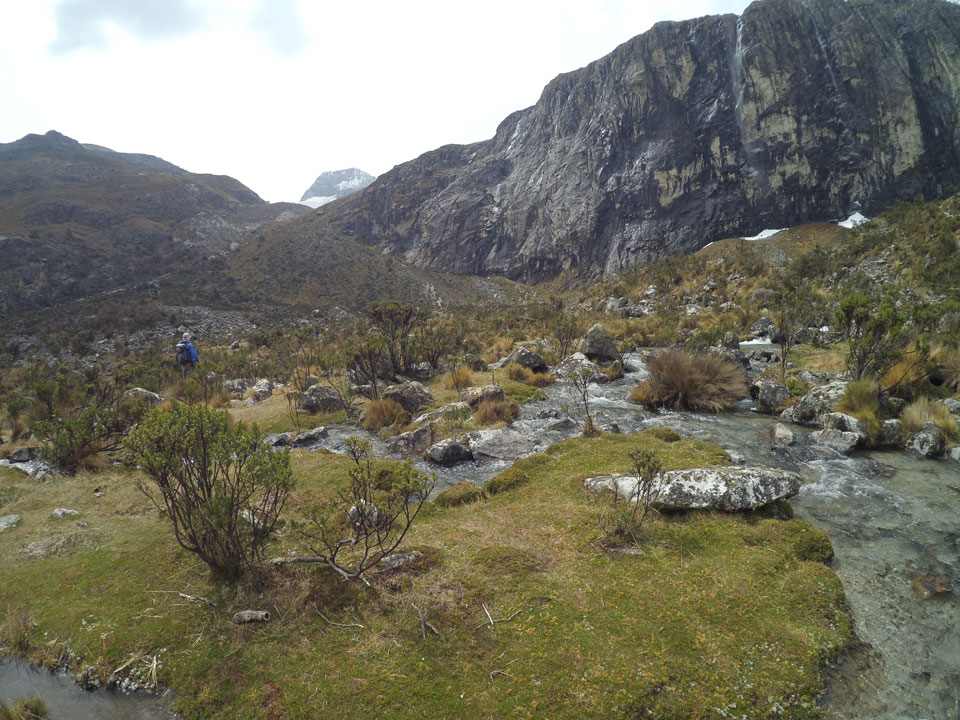 Der Huascan, mit über 6000m der höchste Berg Perus, thronte hinter uns. Ich drehte mich deswegen oft um, weil die Gegend einfach fantastisch aussah. Ringsum Berge, perfektes Wetter und ein gut ausgetretener Weg. Nach einer guten Stunde flachen Pfades, ging es dann bergauf. Vorbei an Wasserfällen ging es immer weiter in die Höhe, was ich doch mit der Puste merkte. Ich ging öfters mal schneller an Leuten vorbei und schloss dabei meinen Mund, versuchte nur über die Nase zu atmen. Ha! Die Rechnung folgte auf dem Fuß, weil ich dann schnell atemlos war. Der Egotrip, Höhenfitness zu faken, gab gute Schwindelanfälle.