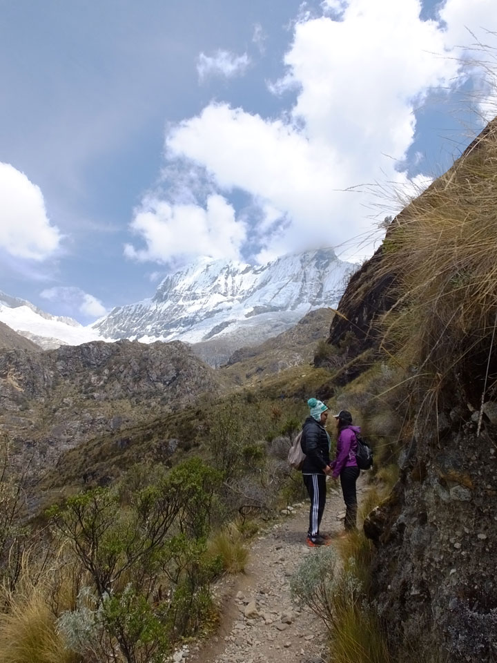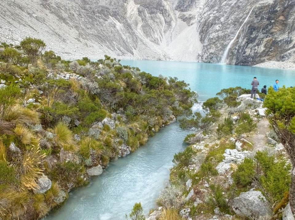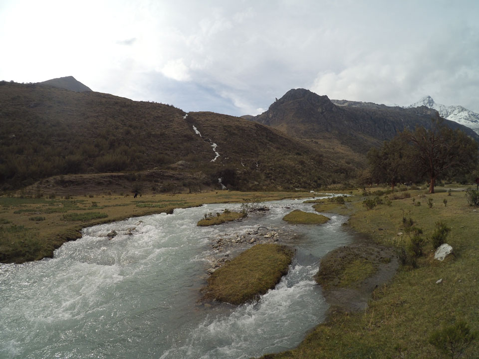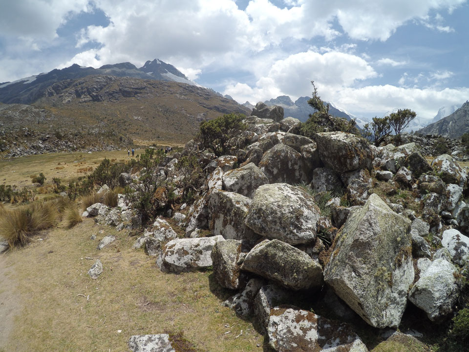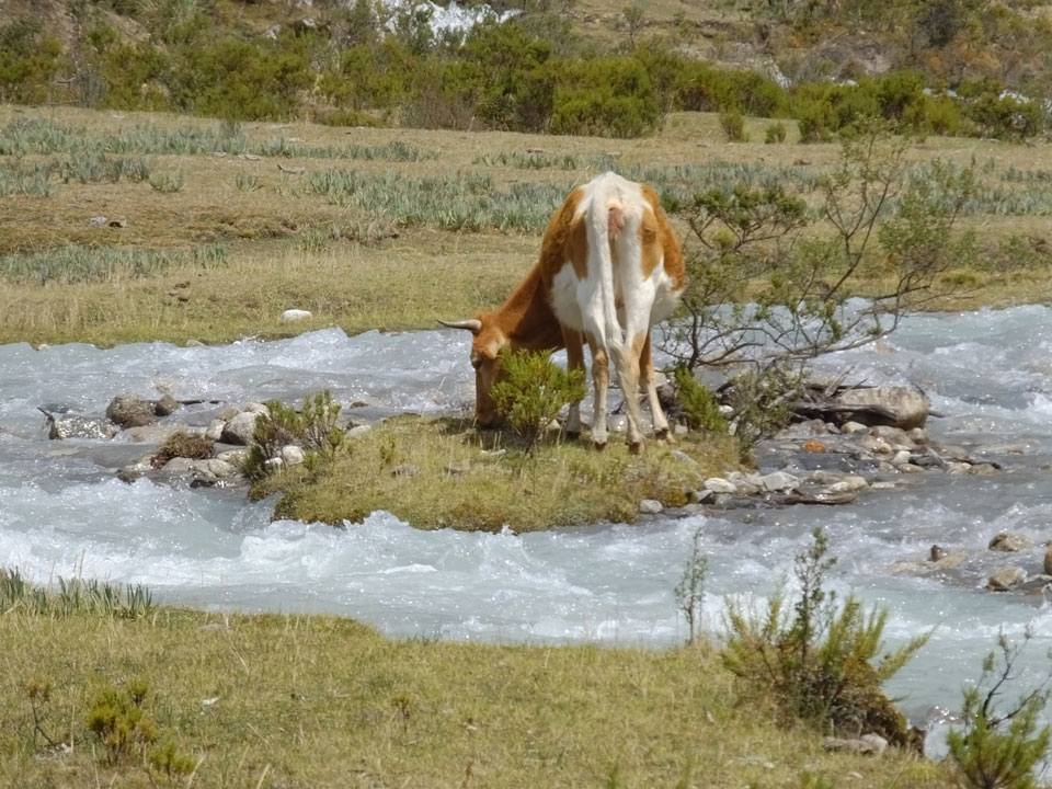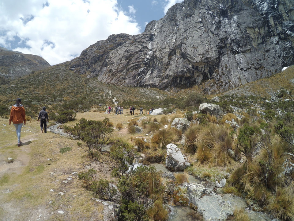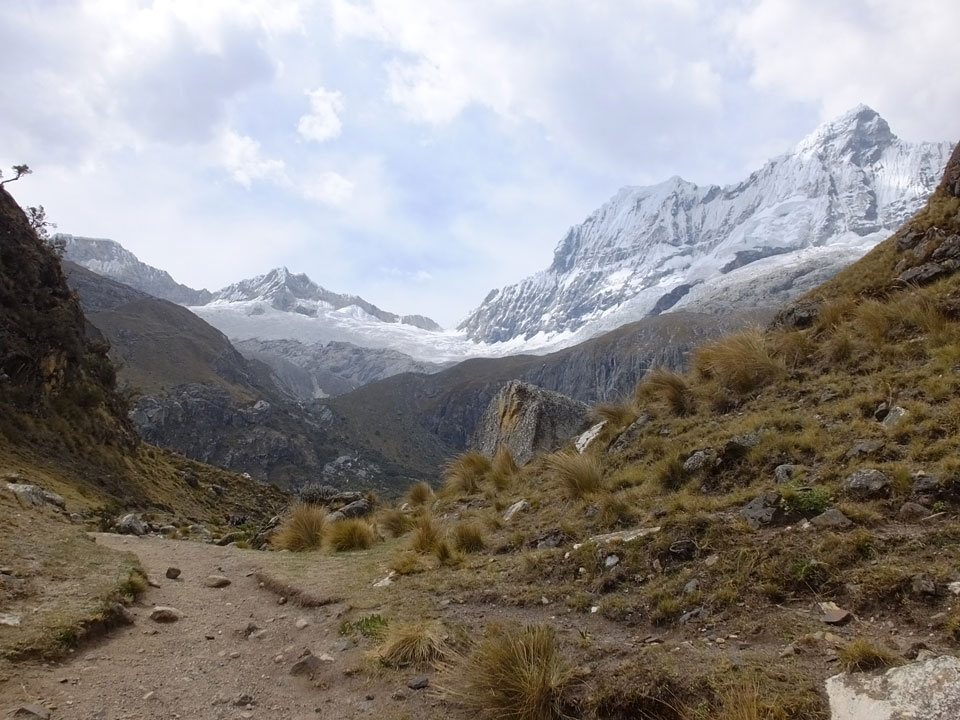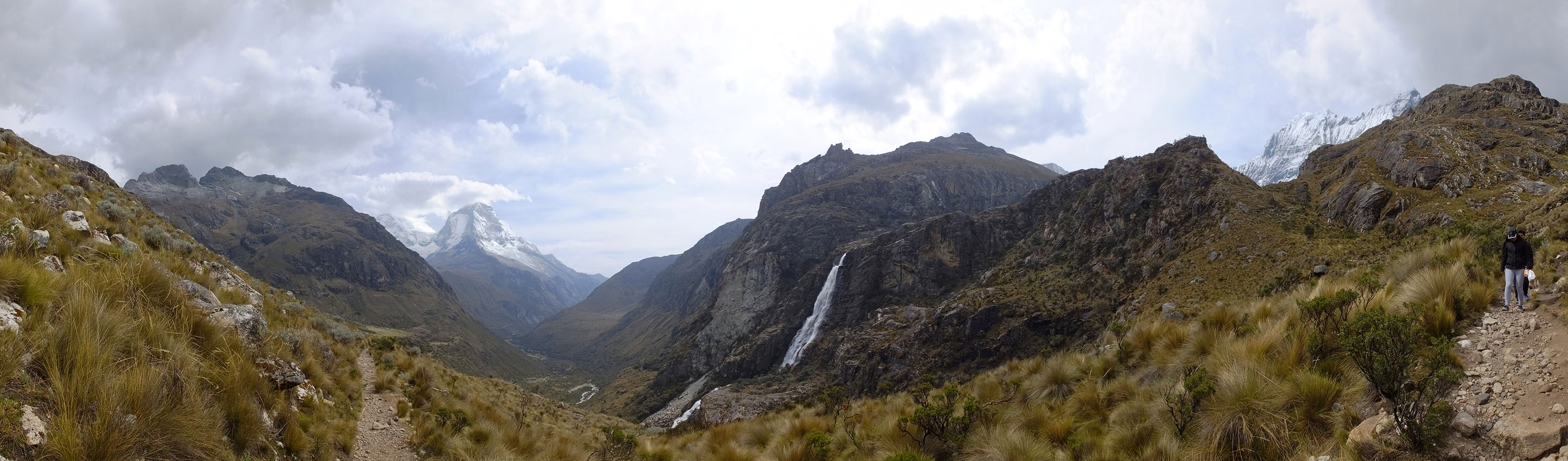 Der Huascan, mit über 6000m der höchste Berg Perus, thronte hinter uns. Ich drehte mich deswegen oft um, weil die Gegend einfach fantastisch aussah. Ringsum Berge, perfektes Wetter und ein gut ausgetretener Weg. Nach einer guten Stunde flachen Pfades, ging es dann bergauf. Vorbei an Wasserfällen ging es immer weiter in die Höhe, was ich doch mit der Puste merkte. Ich ging öfters mal schneller an Leuten vorbei und schloss dabei meinen Mund, versuchte nur über die Nase zu atmen. Ha! Die Rechnung folgte auf dem Fuß, weil ich dann schnell atemlos war. Der Egotrip, Höhenfitness zu faken, gab gute Schwindelanfälle.