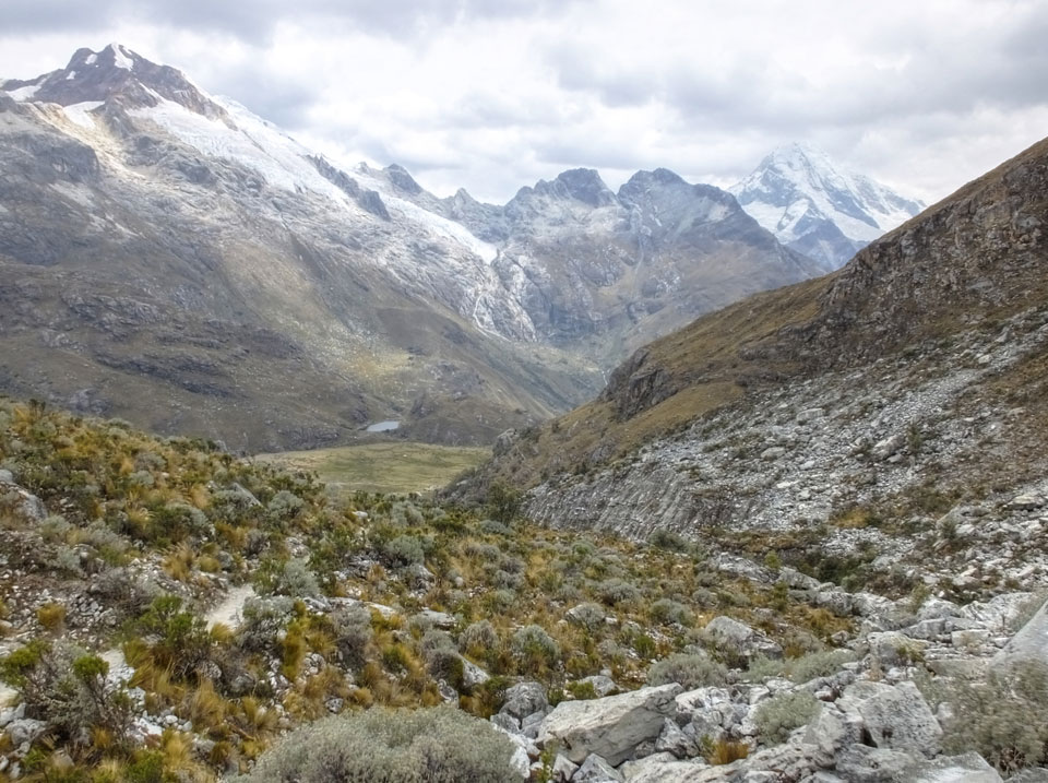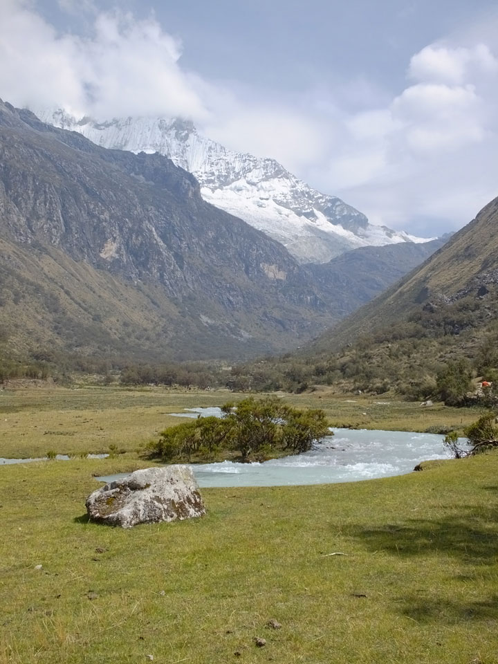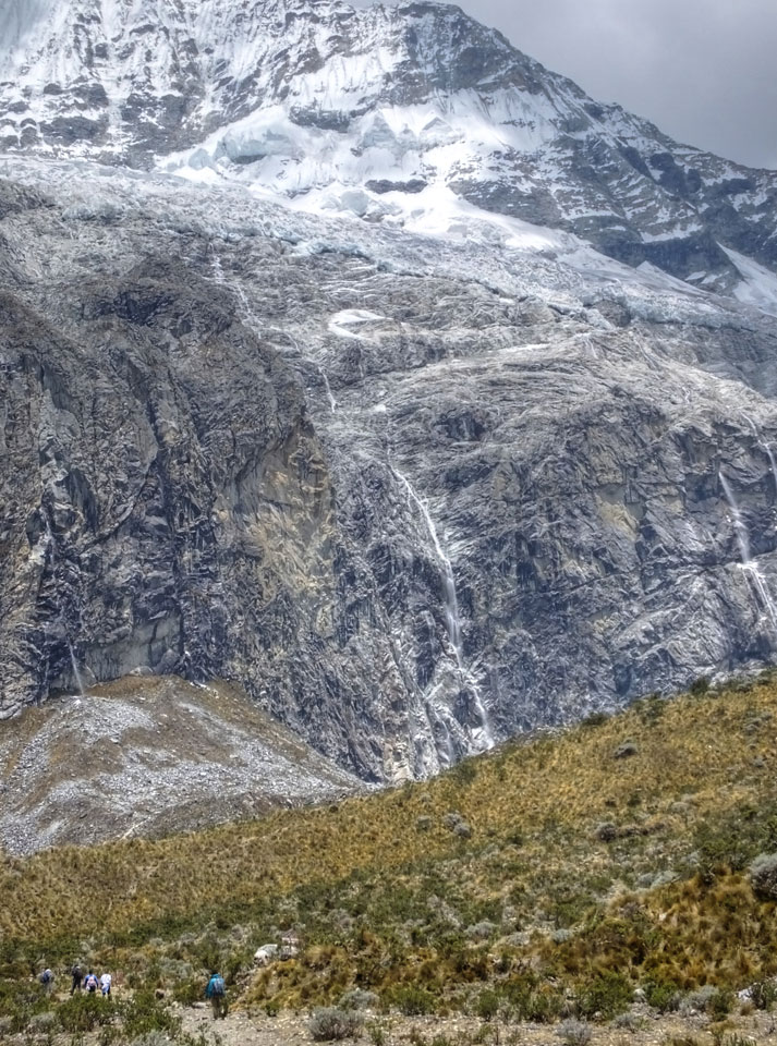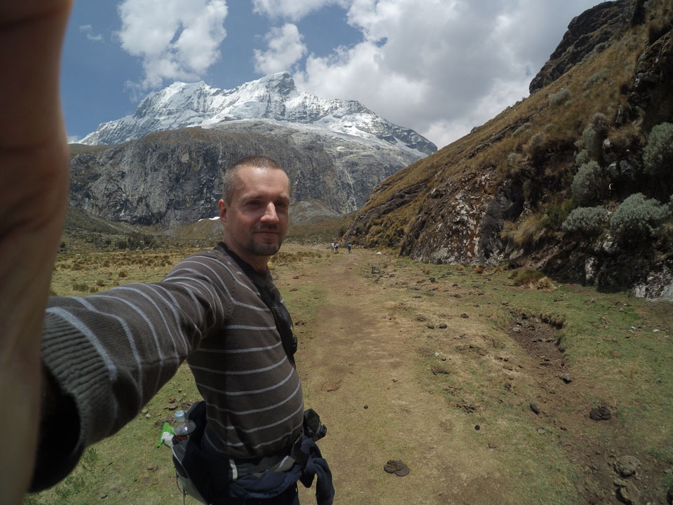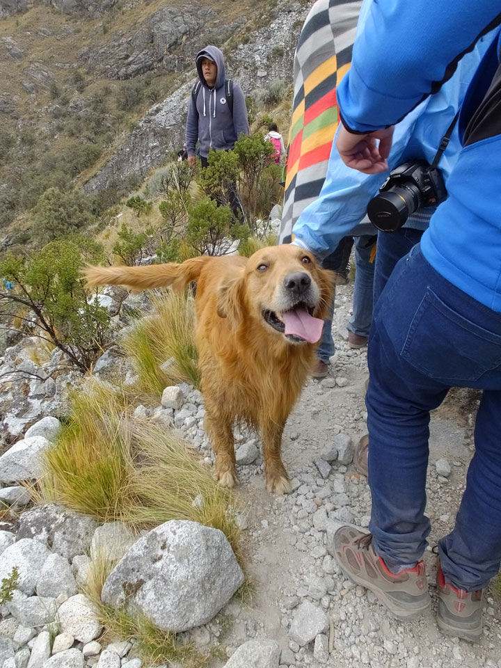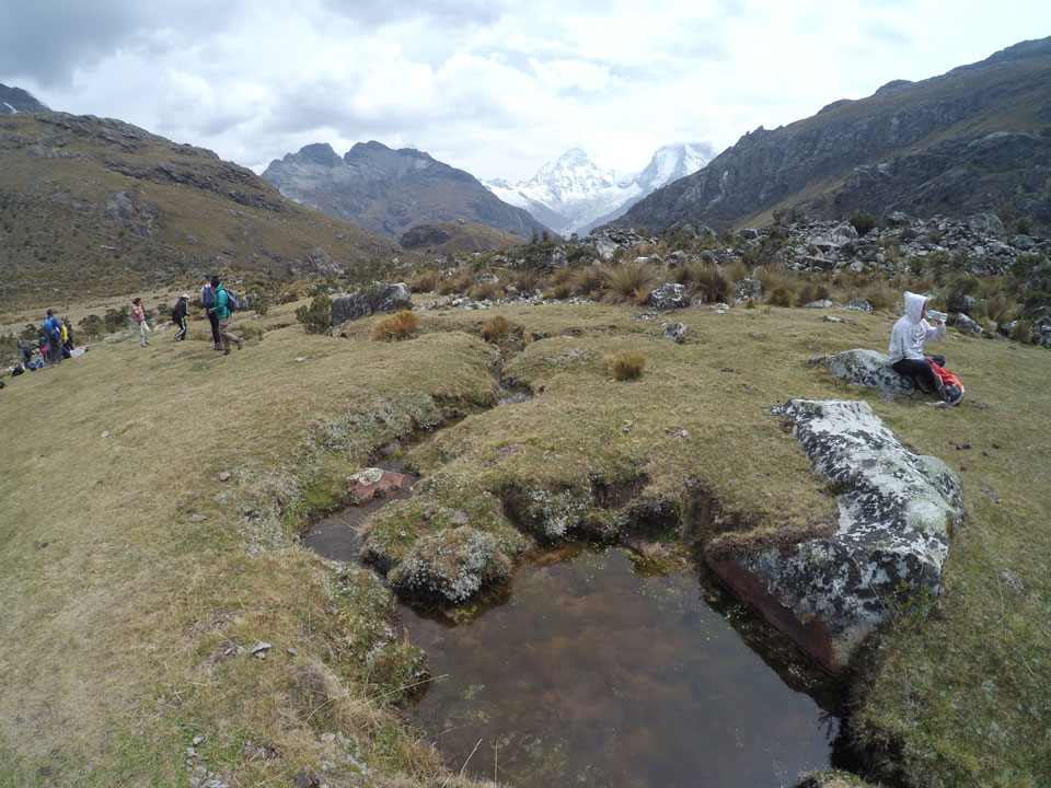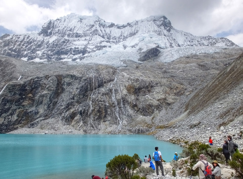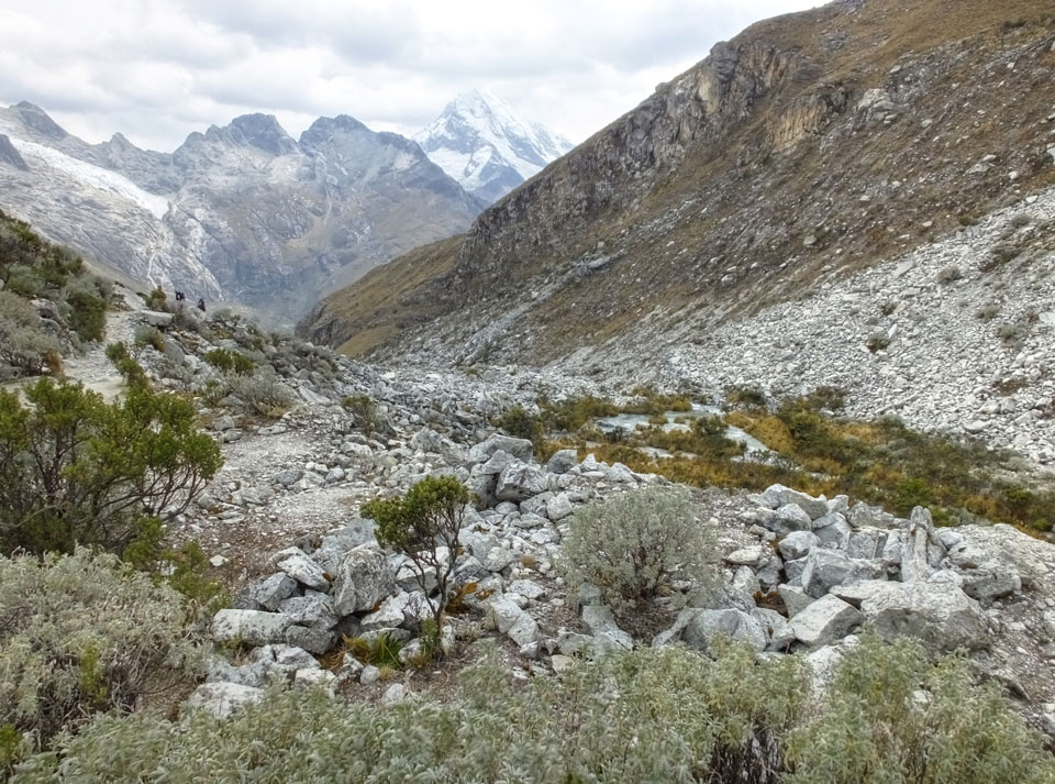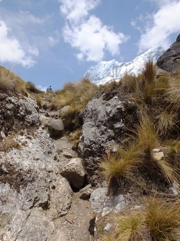 Der Huascan, mit über 6000m der höchste Berg Perus, thronte hinter uns. Ich drehte mich deswegen oft um, weil die Gegend einfach fantastisch aussah. Ringsum Berge, perfektes Wetter und ein gut ausgetretener Weg. Nach einer guten Stunde flachen Pfades, ging es dann bergauf. Vorbei an Wasserfällen ging es immer weiter in die Höhe, was ich doch mit der Puste merkte. Ich ging öfters mal schneller an Leuten vorbei und schloss dabei meinen Mund, versuchte nur über die Nase zu atmen. Ha! Die Rechnung folgte auf dem Fuß, weil ich dann schnell atemlos war. Der Egotrip, Höhenfitness zu faken, gab gute Schwindelanfälle.