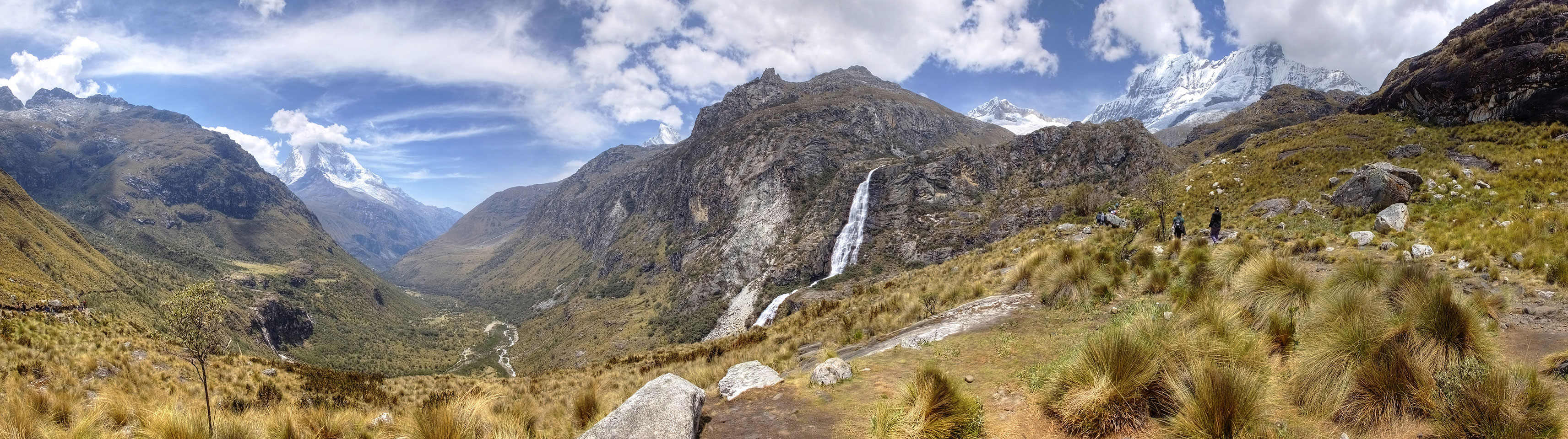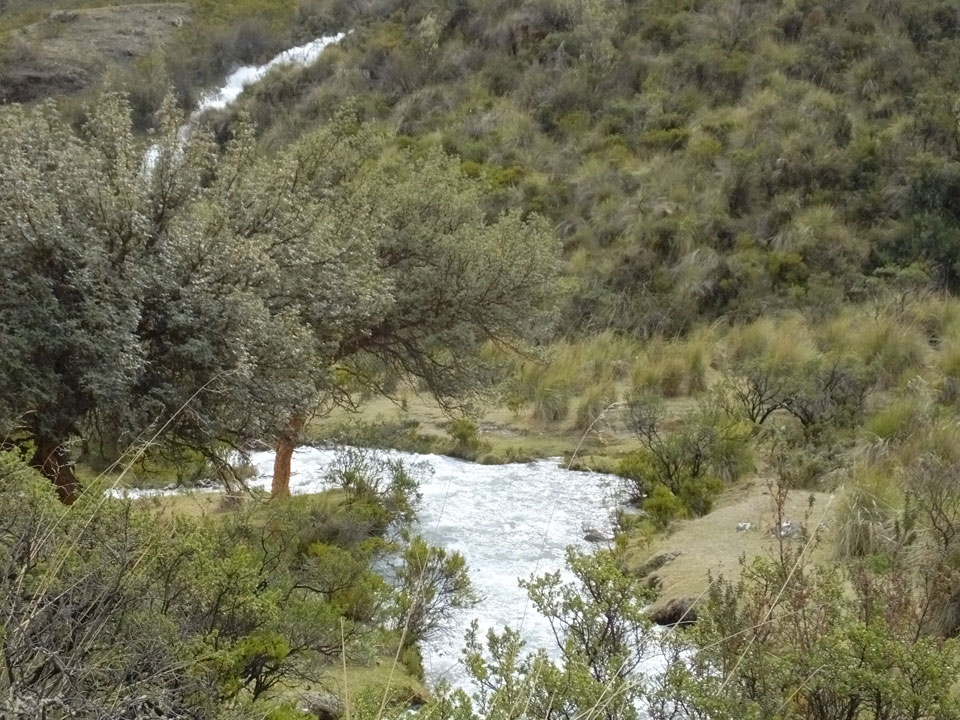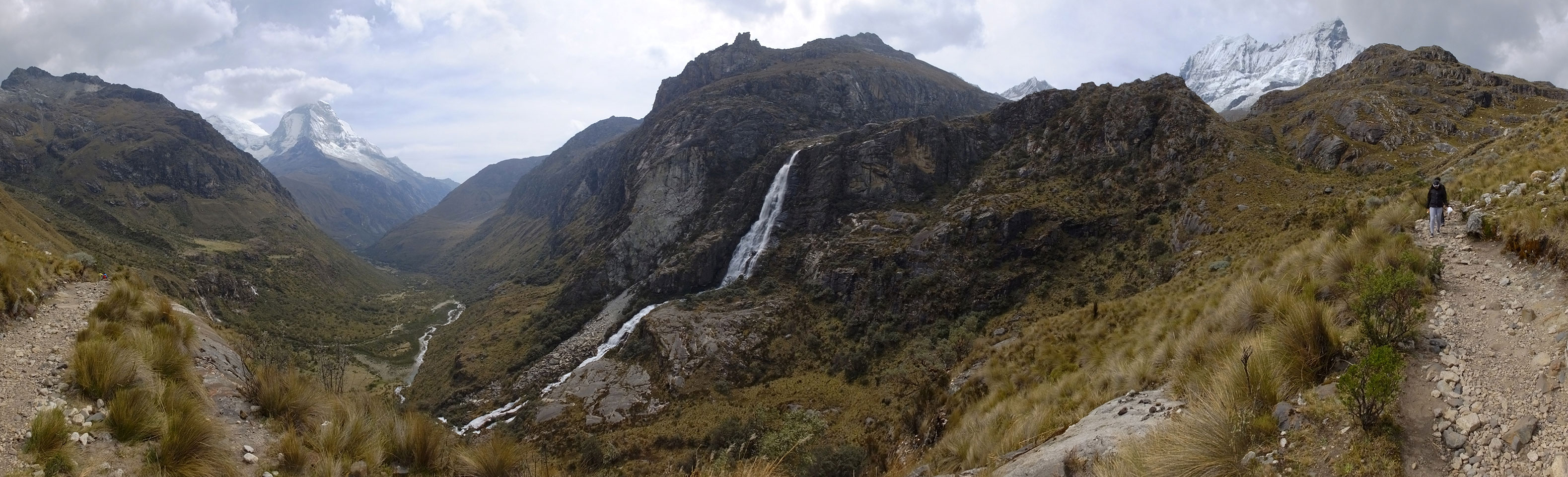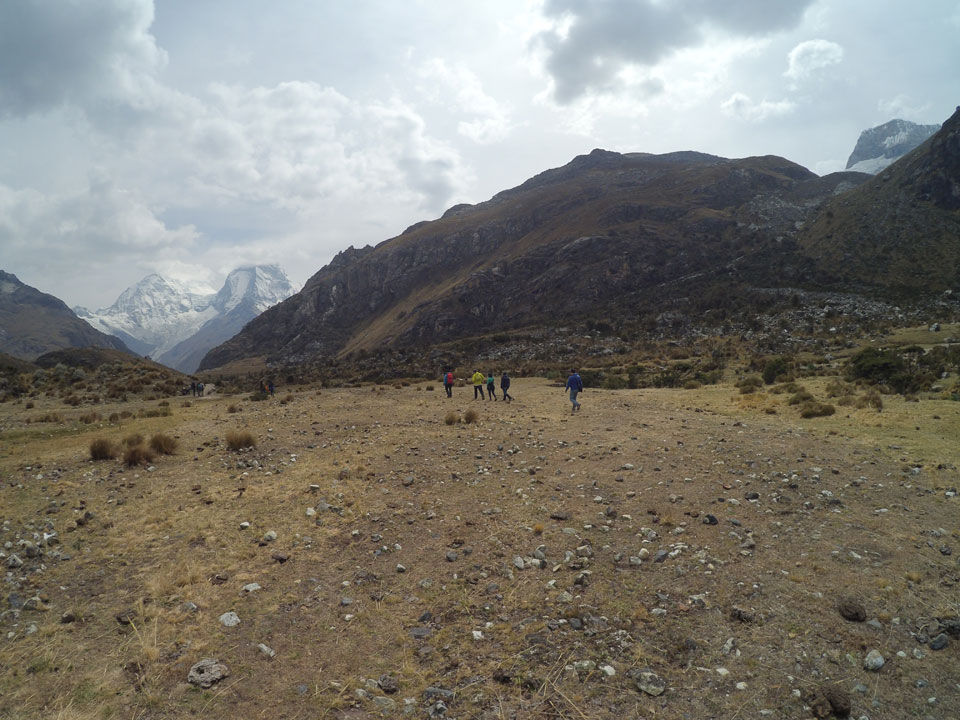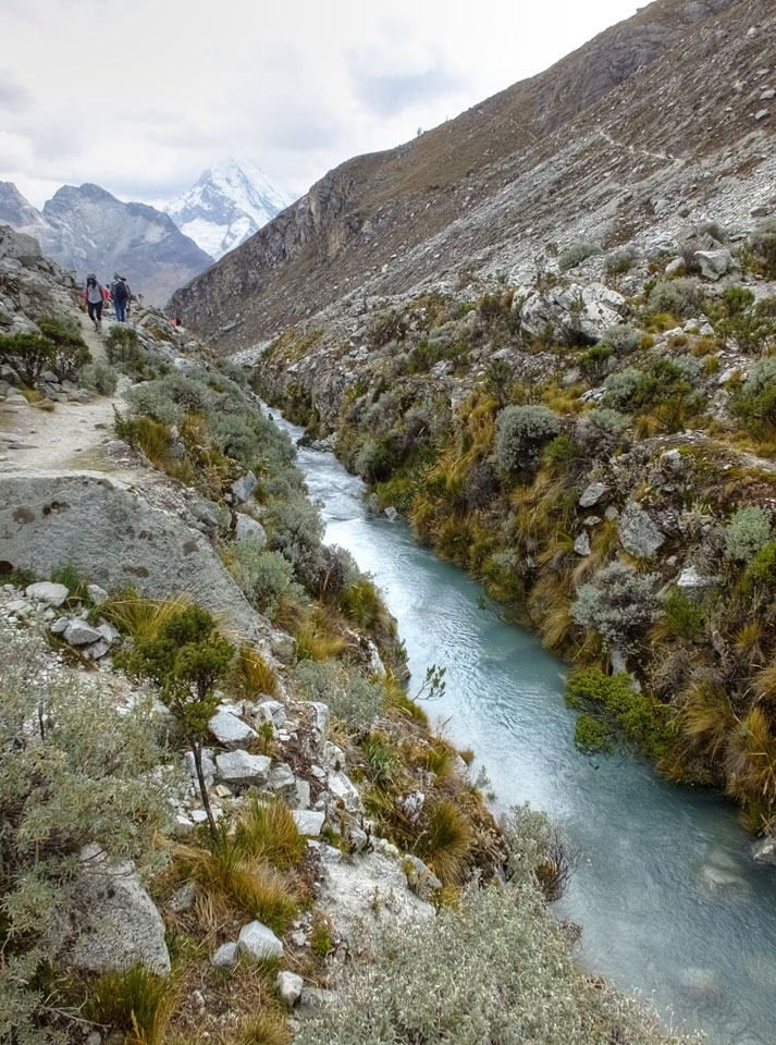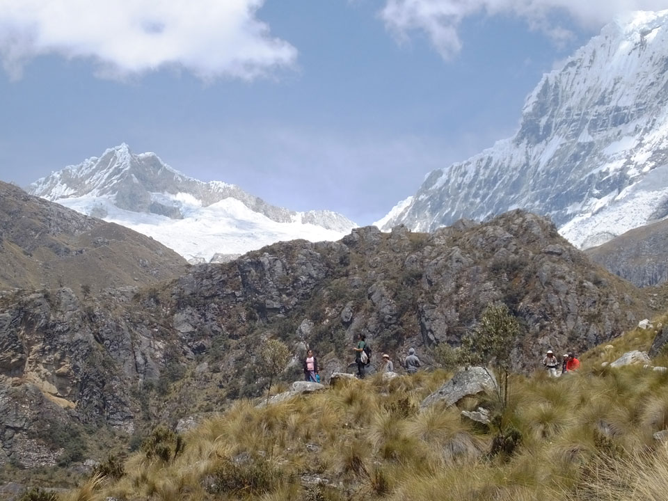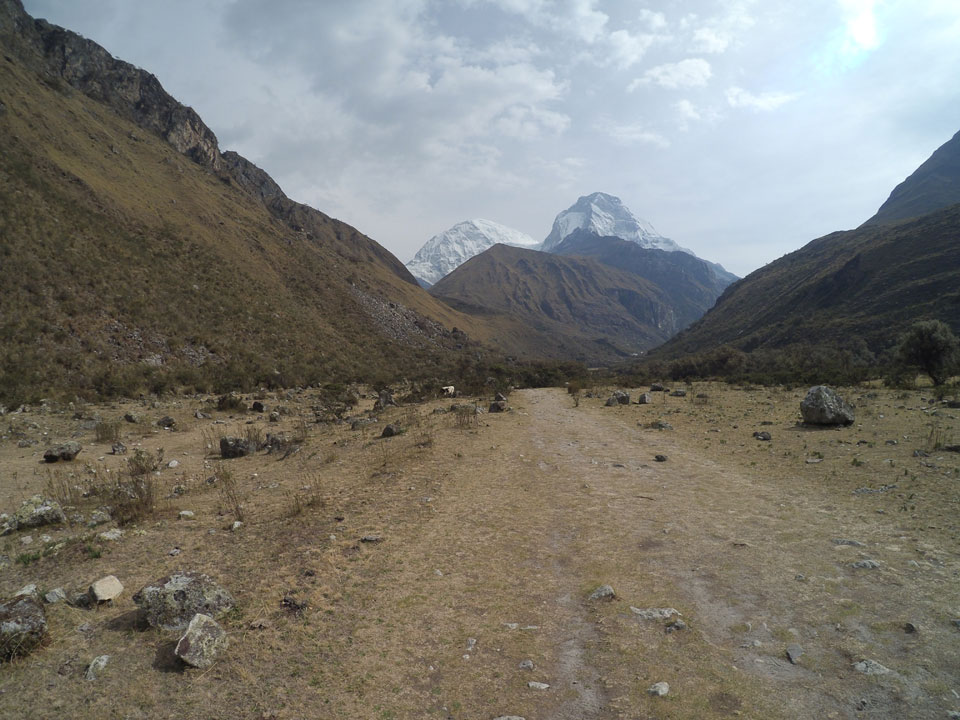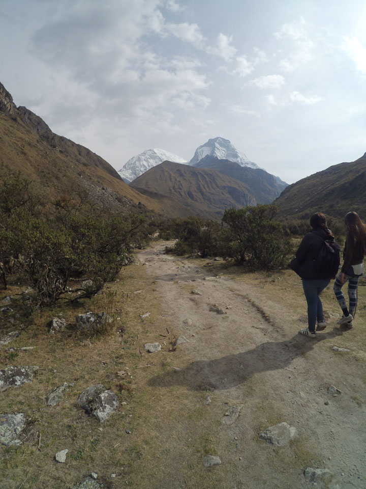 Der Huascan, mit über 6000m der höchste Berg Perus, thronte hinter uns. Ich drehte mich deswegen oft um, weil die Gegend einfach fantastisch aussah. Ringsum Berge, perfektes Wetter und ein gut ausgetretener Weg. Nach einer guten Stunde flachen Pfades, ging es dann bergauf. Vorbei an Wasserfällen ging es immer weiter in die Höhe, was ich doch mit der Puste merkte. Ich ging öfters mal schneller an Leuten vorbei und schloss dabei meinen Mund, versuchte nur über die Nase zu atmen. Ha! Die Rechnung folgte auf dem Fuß, weil ich dann schnell atemlos war. Der Egotrip, Höhenfitness zu faken, gab gute Schwindelanfälle.