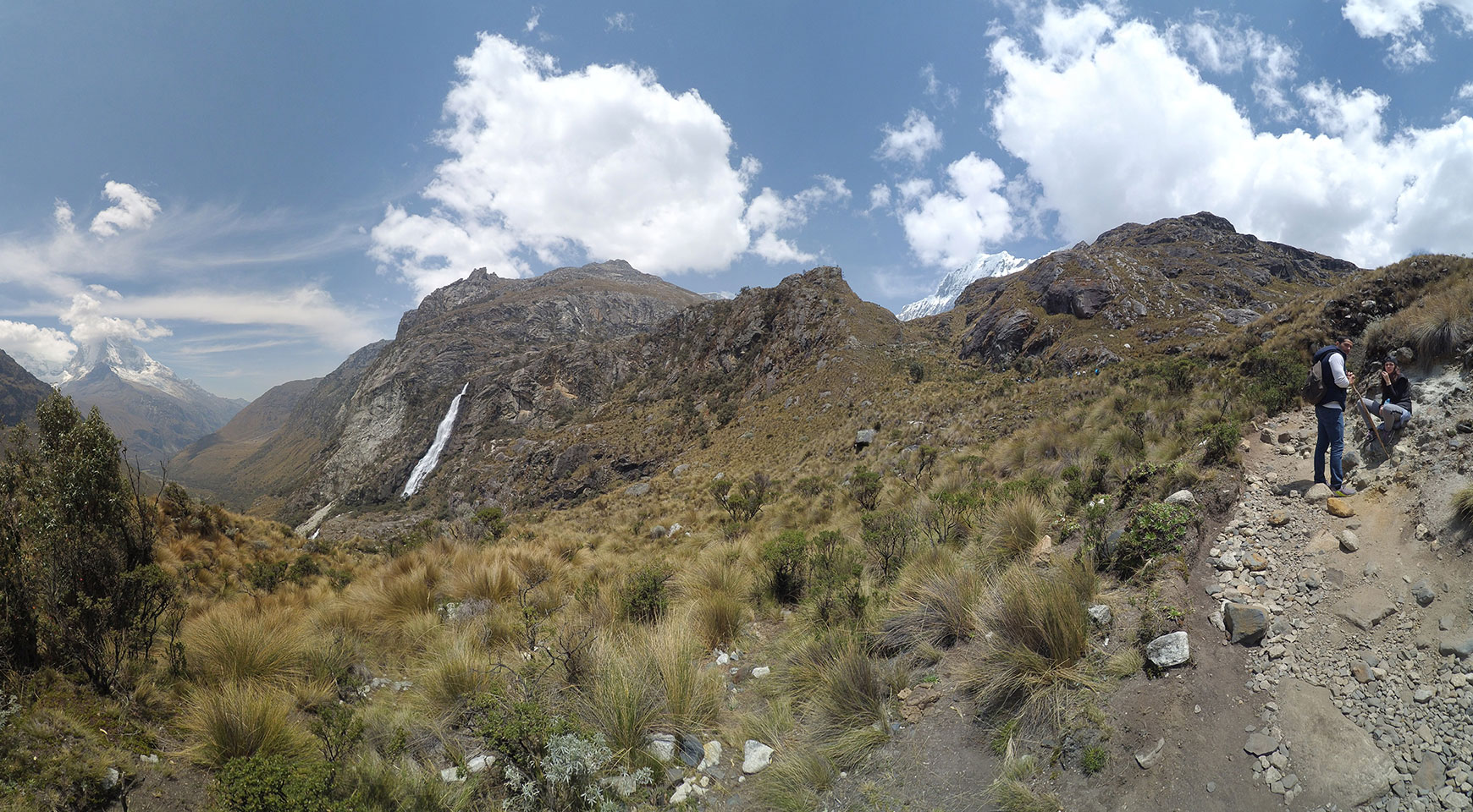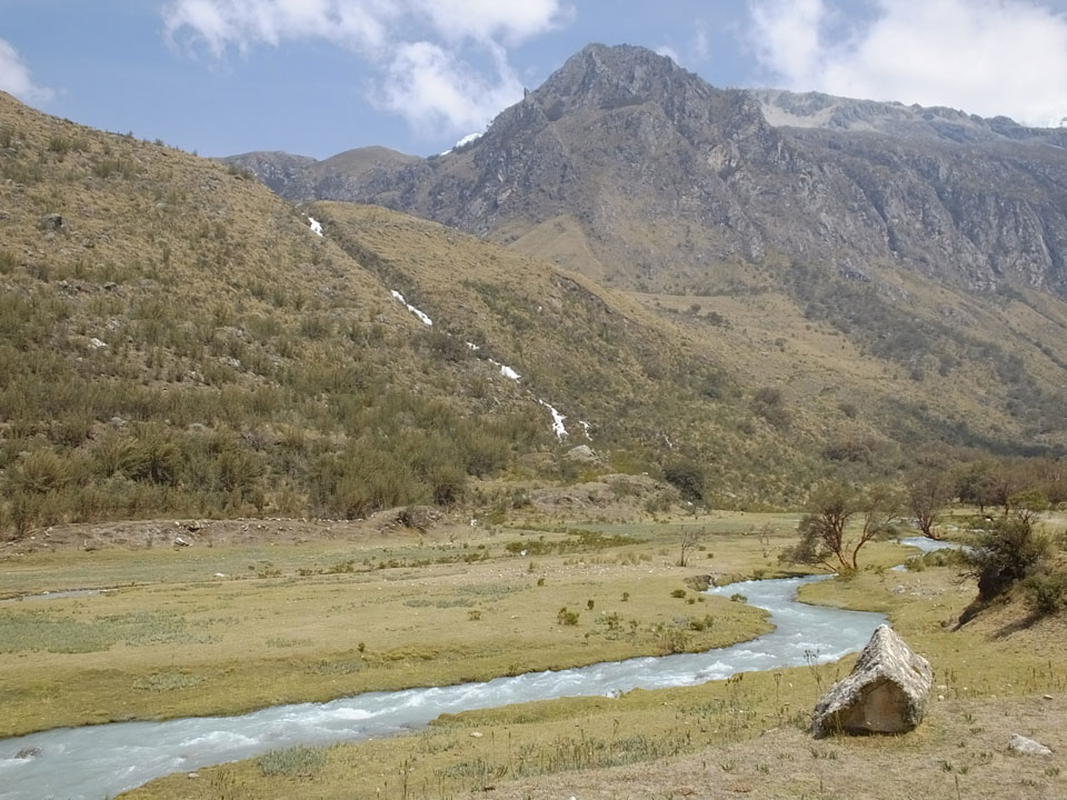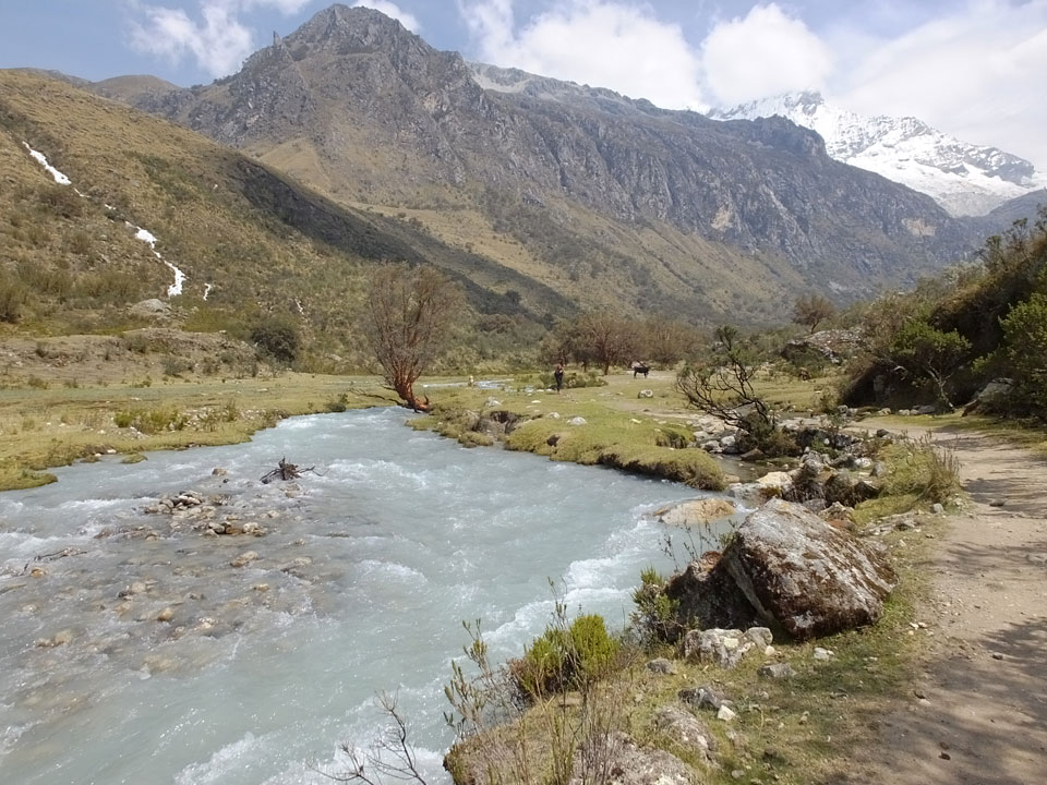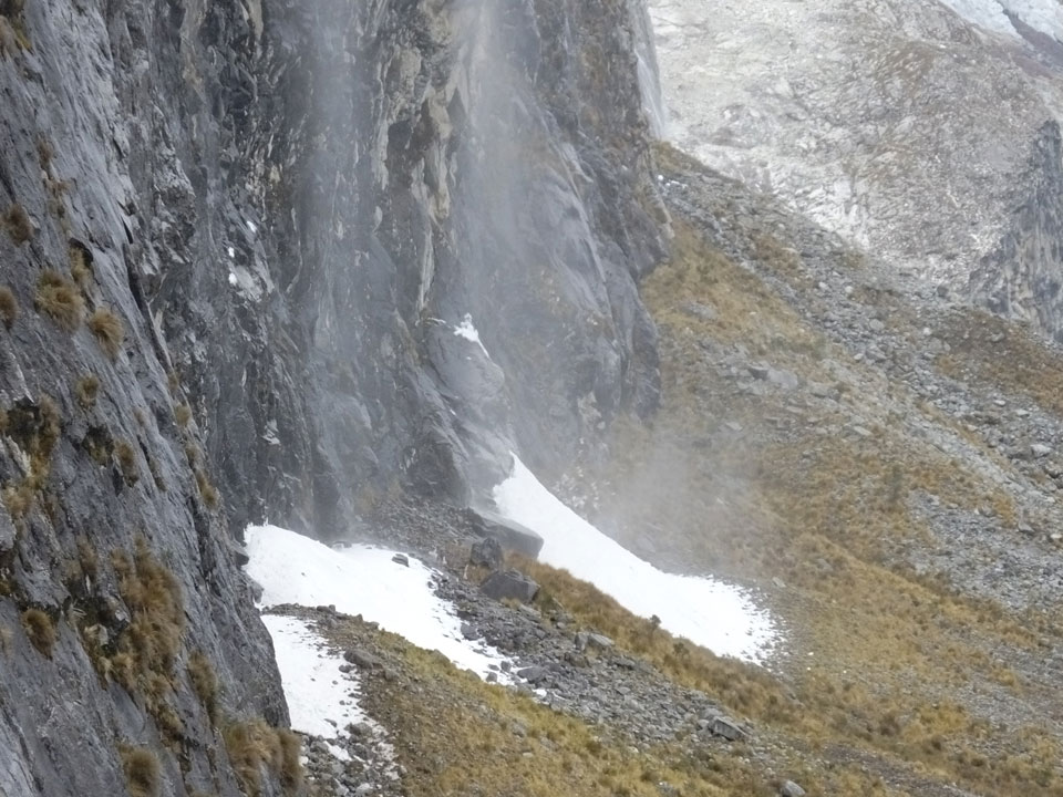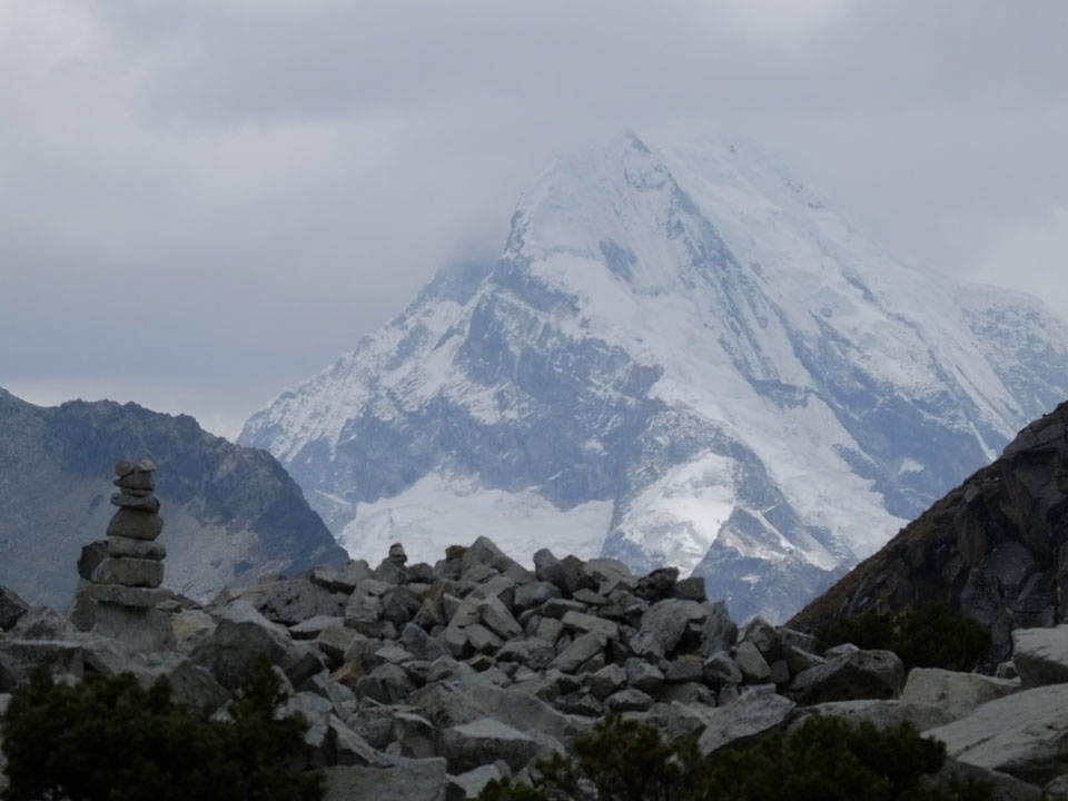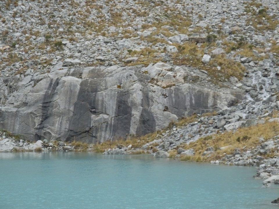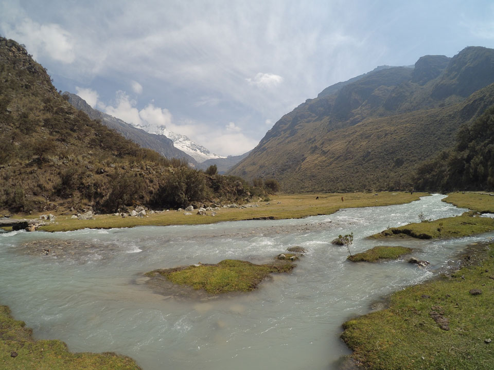 Der Huascan, mit über 6000m der höchste Berg Perus, thronte hinter uns. Ich drehte mich deswegen oft um, weil die Gegend einfach fantastisch aussah. Ringsum Berge, perfektes Wetter und ein gut ausgetretener Weg. Nach einer guten Stunde flachen Pfades, ging es dann bergauf. Vorbei an Wasserfällen ging es immer weiter in die Höhe, was ich doch mit der Puste merkte. Ich ging öfters mal schneller an Leuten vorbei und schloss dabei meinen Mund, versuchte nur über die Nase zu atmen. Ha! Die Rechnung folgte auf dem Fuß, weil ich dann schnell atemlos war. Der Egotrip, Höhenfitness zu faken, gab gute Schwindelanfälle.