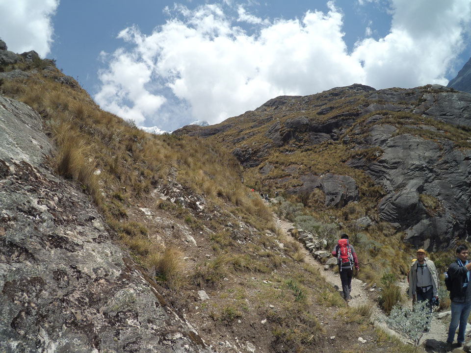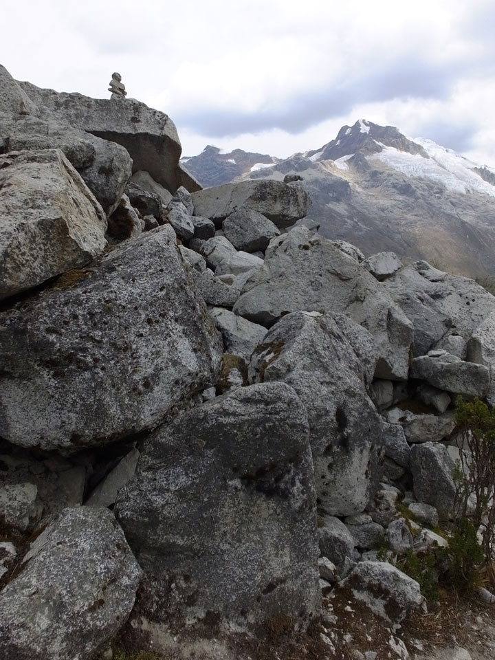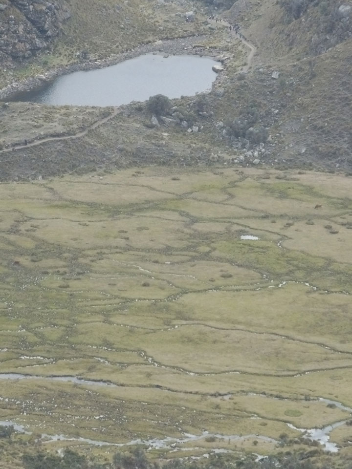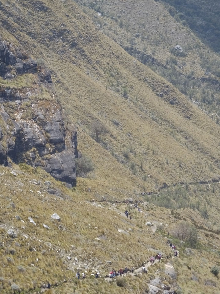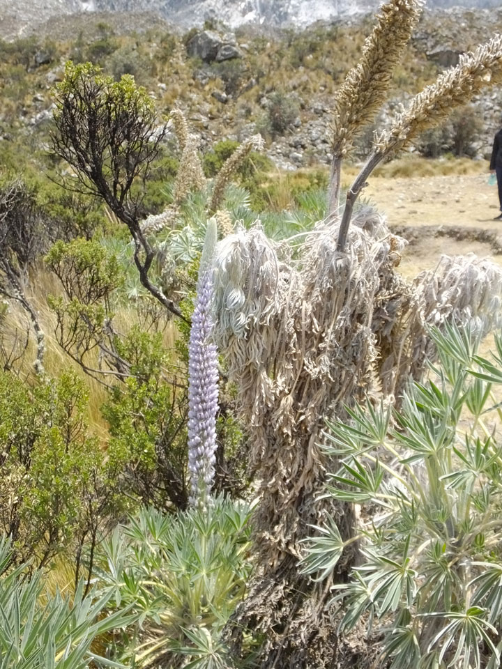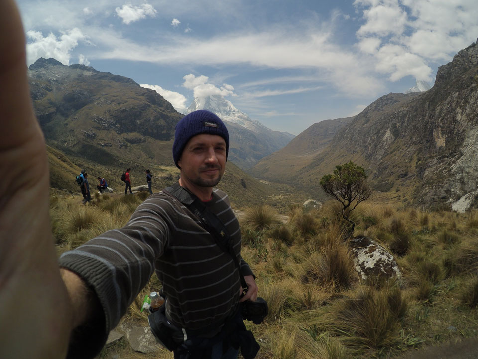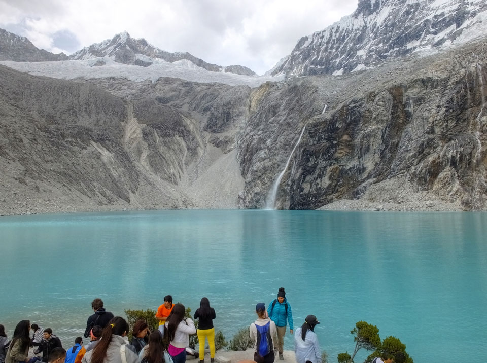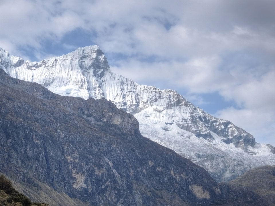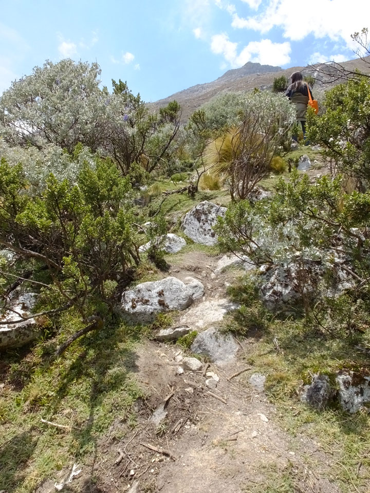 Der Huascan, mit über 6000m der höchste Berg Perus, thronte hinter uns. Ich drehte mich deswegen oft um, weil die Gegend einfach fantastisch aussah. Ringsum Berge, perfektes Wetter und ein gut ausgetretener Weg. Nach einer guten Stunde flachen Pfades, ging es dann bergauf. Vorbei an Wasserfällen ging es immer weiter in die Höhe, was ich doch mit der Puste merkte. Ich ging öfters mal schneller an Leuten vorbei und schloss dabei meinen Mund, versuchte nur über die Nase zu atmen. Ha! Die Rechnung folgte auf dem Fuß, weil ich dann schnell atemlos war. Der Egotrip, Höhenfitness zu faken, gab gute Schwindelanfälle.