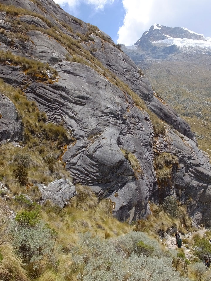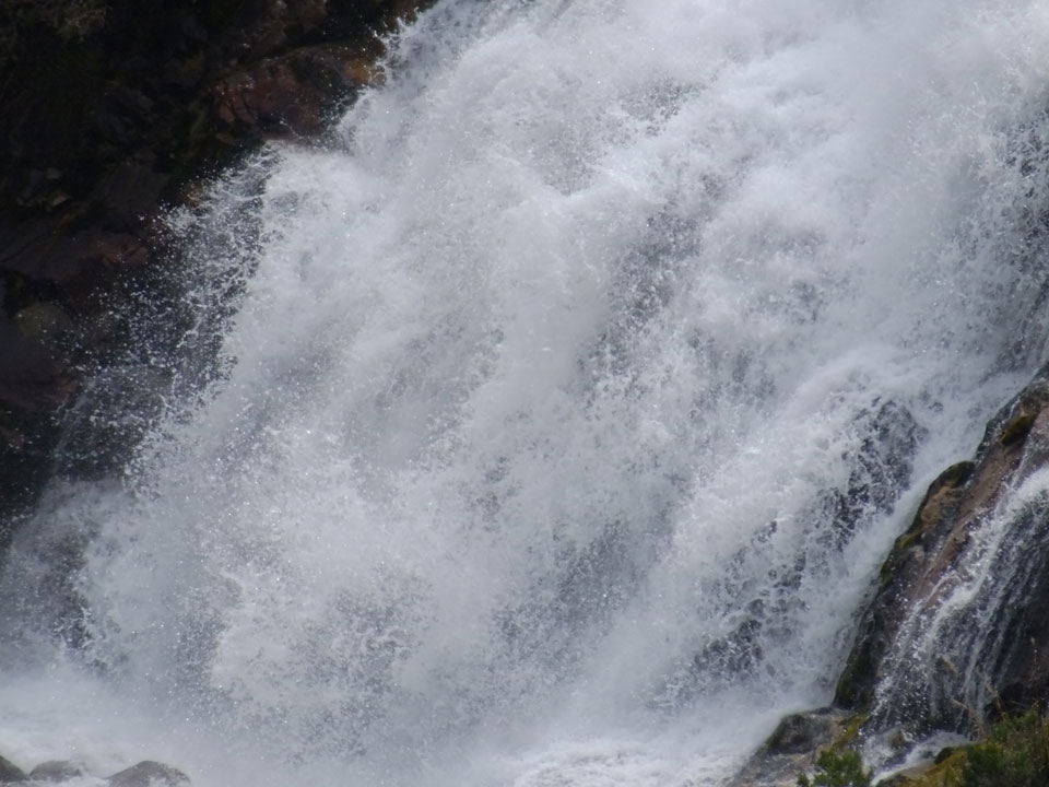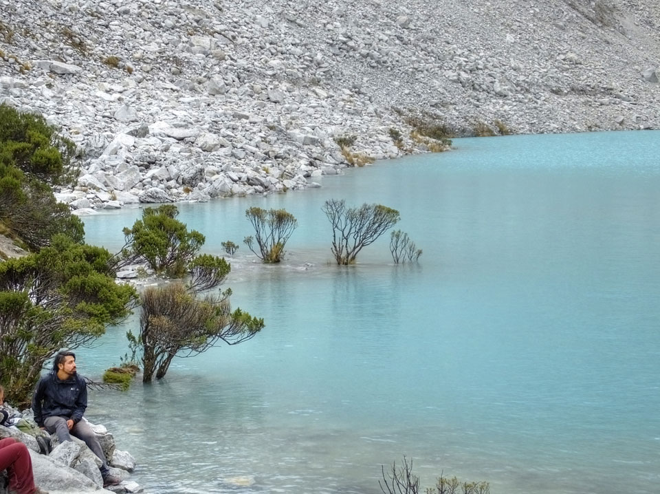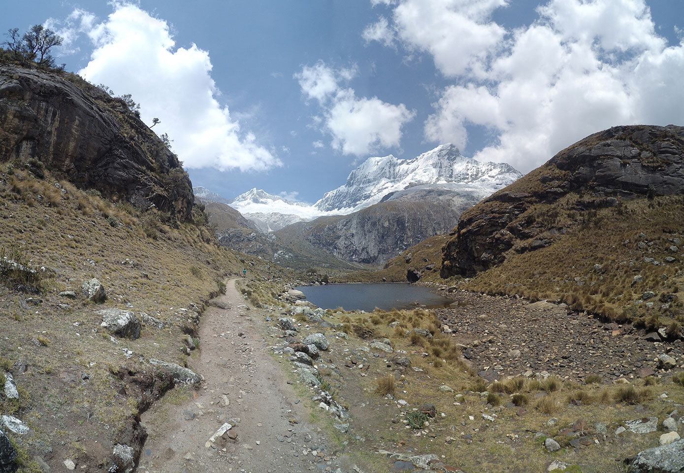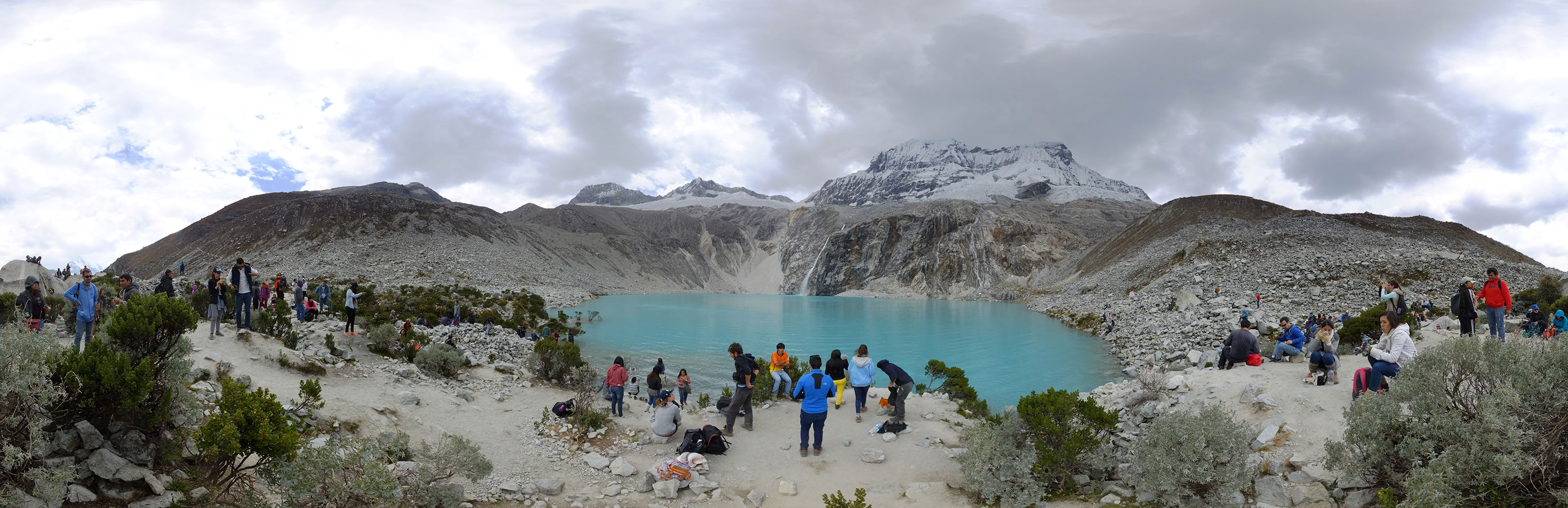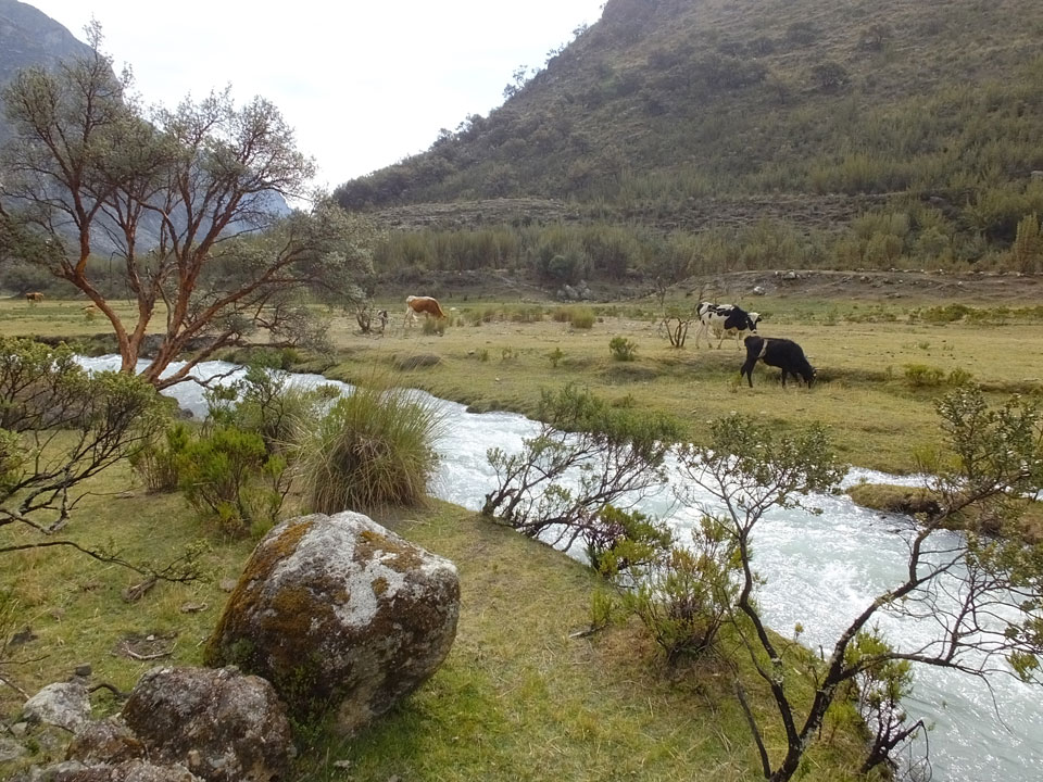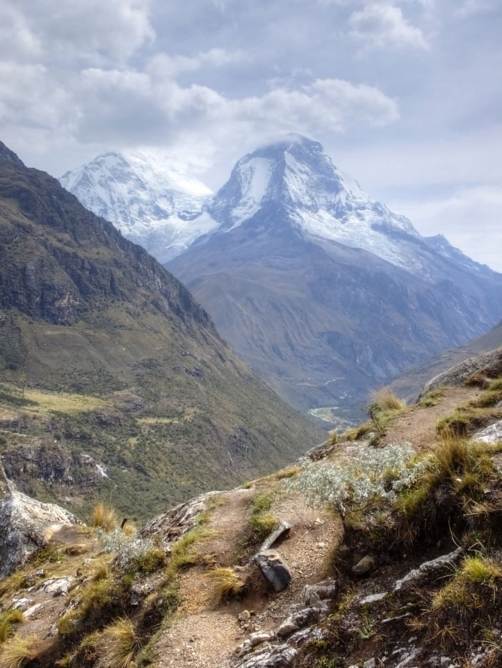 Der Huascan, mit über 6000m der höchste Berg Perus, thronte hinter uns. Ich drehte mich deswegen oft um, weil die Gegend einfach fantastisch aussah. Ringsum Berge, perfektes Wetter und ein gut ausgetretener Weg. Nach einer guten Stunde flachen Pfades, ging es dann bergauf. Vorbei an Wasserfällen ging es immer weiter in die Höhe, was ich doch mit der Puste merkte. Ich ging öfters mal schneller an Leuten vorbei und schloss dabei meinen Mund, versuchte nur über die Nase zu atmen. Ha! Die Rechnung folgte auf dem Fuß, weil ich dann schnell atemlos war. Der Egotrip, Höhenfitness zu faken, gab gute Schwindelanfälle.