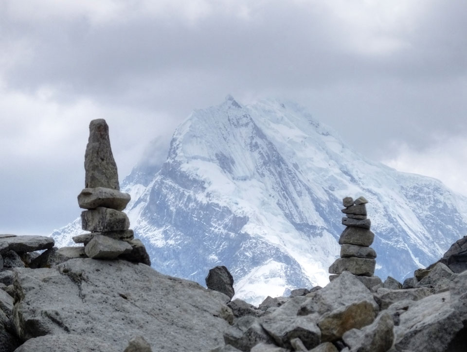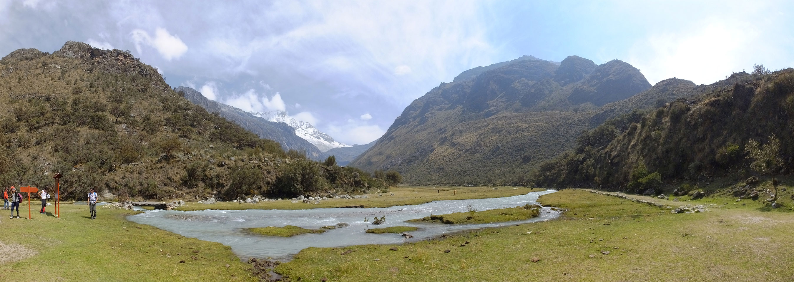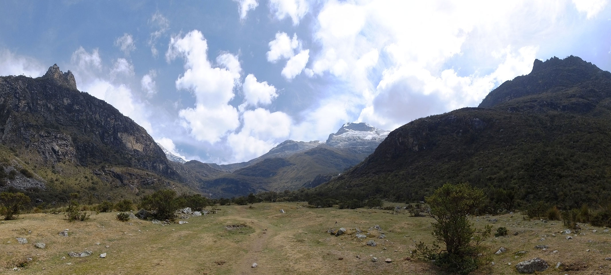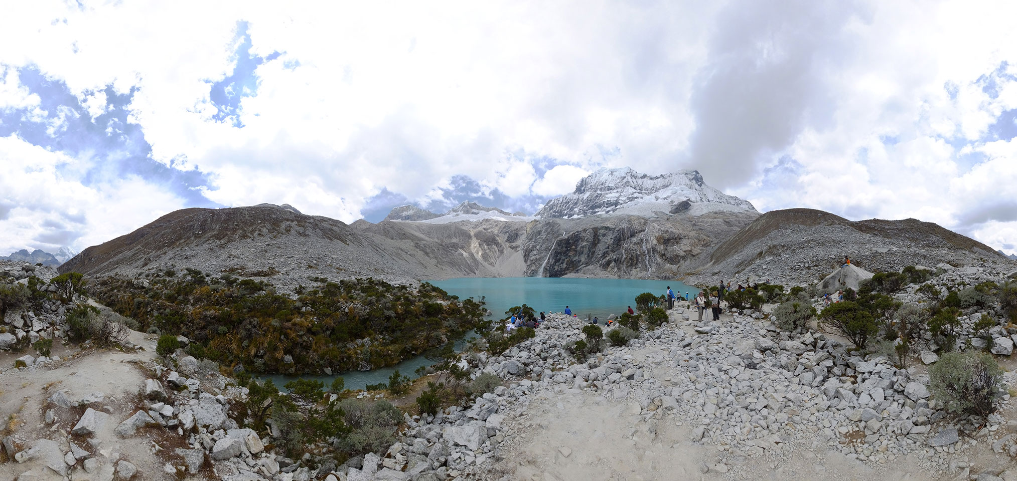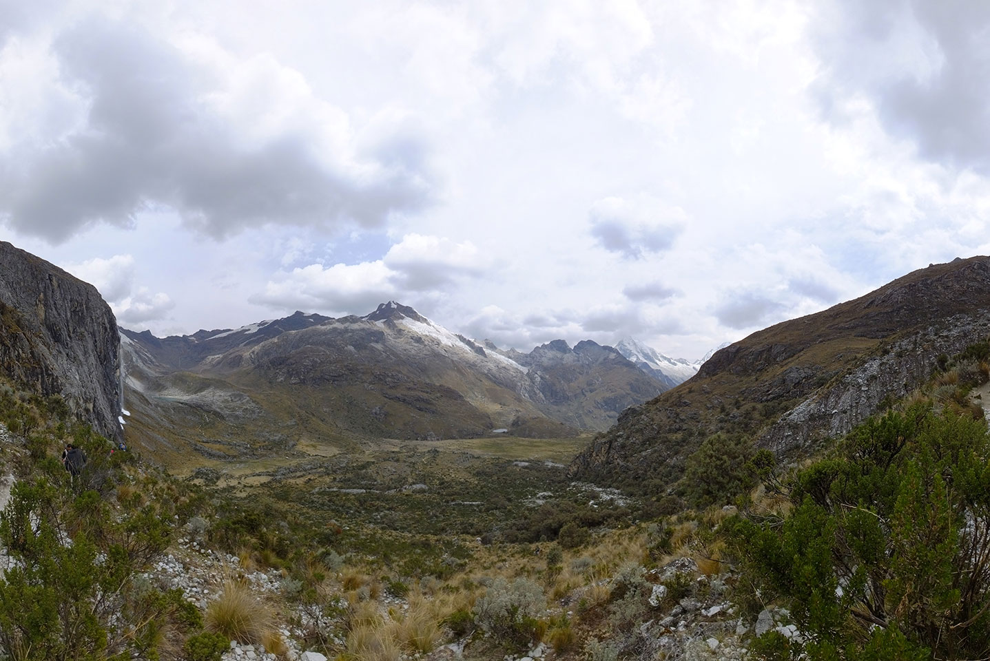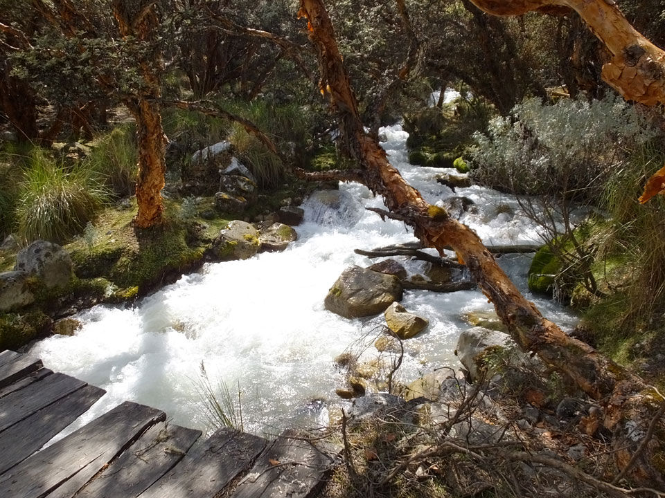 Der Huascan, mit über 6000m der höchste Berg Perus, thronte hinter uns. Ich drehte mich deswegen oft um, weil die Gegend einfach fantastisch aussah. Ringsum Berge, perfektes Wetter und ein gut ausgetretener Weg. Nach einer guten Stunde flachen Pfades, ging es dann bergauf. Vorbei an Wasserfällen ging es immer weiter in die Höhe, was ich doch mit der Puste merkte. Ich ging öfters mal schneller an Leuten vorbei und schloss dabei meinen Mund, versuchte nur über die Nase zu atmen. Ha! Die Rechnung folgte auf dem Fuß, weil ich dann schnell atemlos war. Der Egotrip, Höhenfitness zu faken, gab gute Schwindelanfälle.
