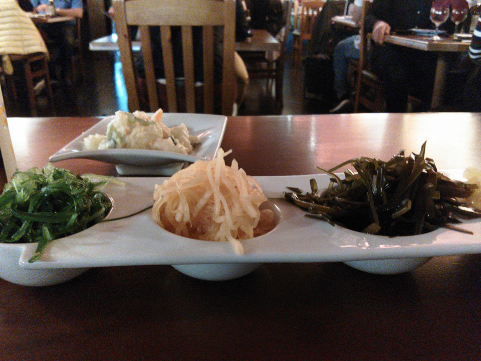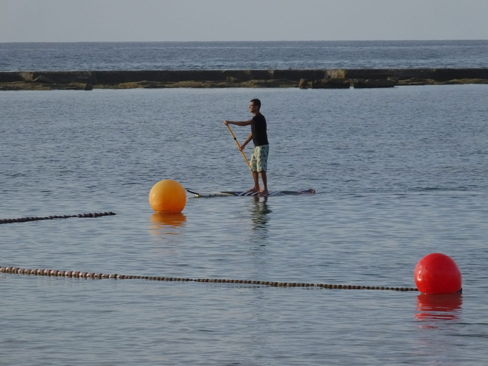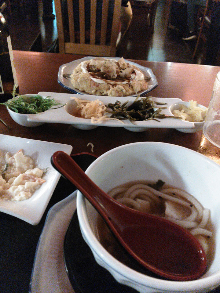 Ich vergaß, mit den Füßen in’s Wasser zu gehen. Ich schickte die Photos weg und ging Abendessen. Das japanische Restaurant „Kyoto“ bot eine gute Auswahl. Es gab eine Auswahl von Salat auf’s Haus, dann die Udon und Okonomiyaki. Alles exzellent!