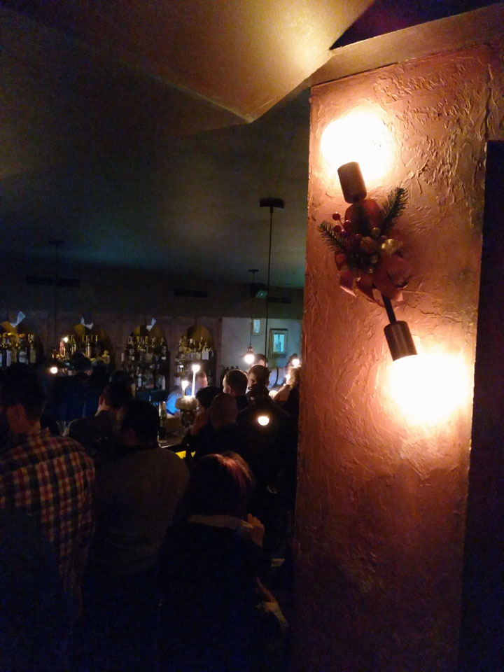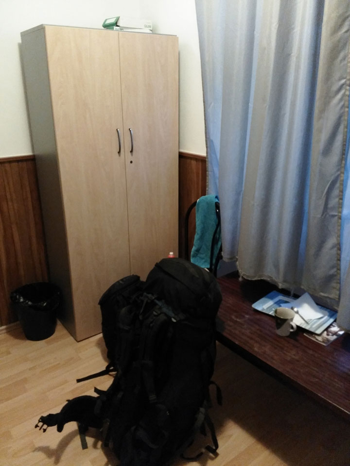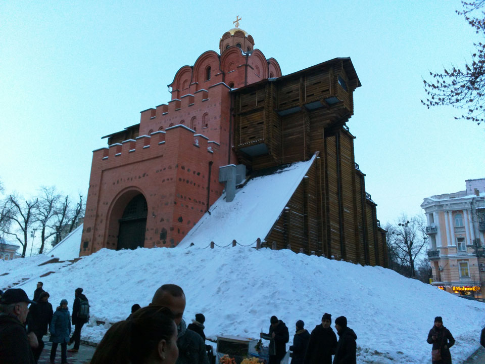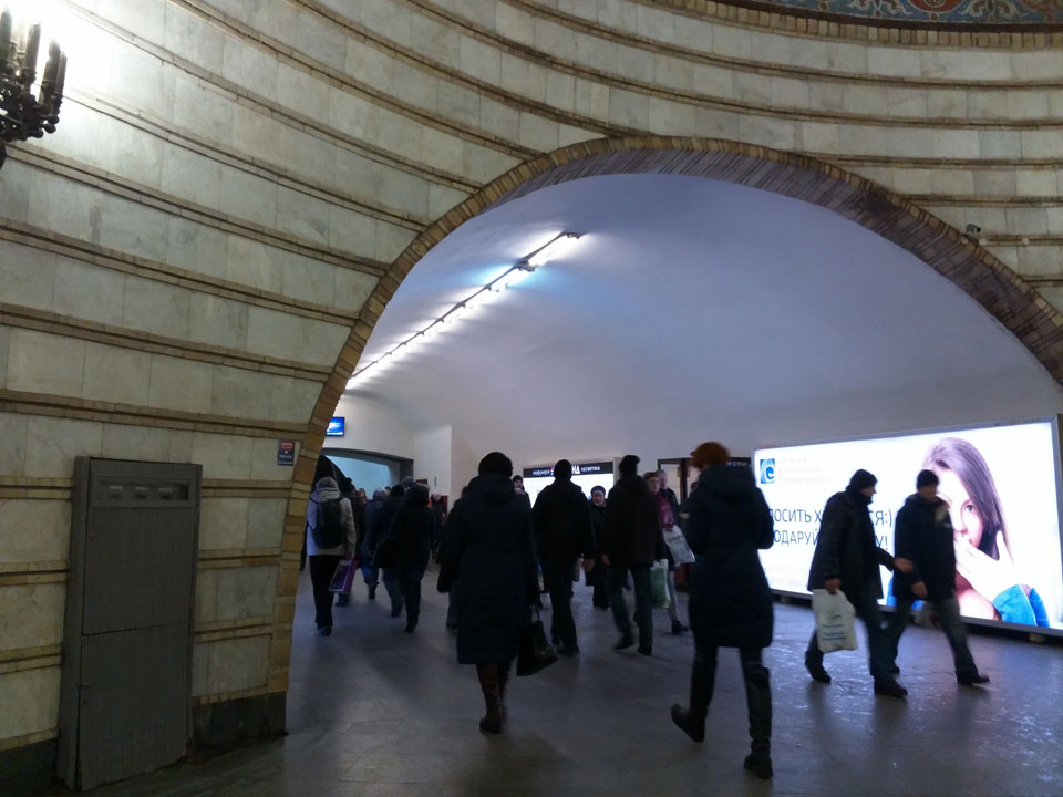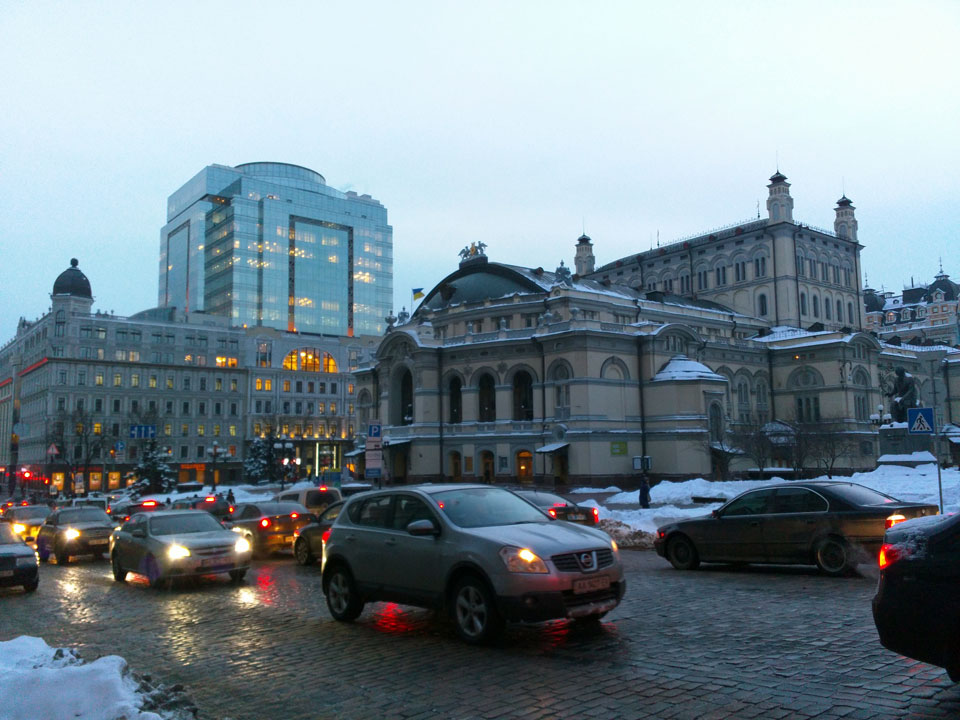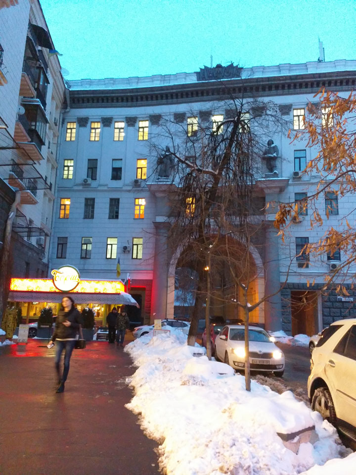 Mit der Metro bis Teatralnaja. Eigentlich müsste ich nochmals wechseln aber entschied mich für den Marsch zum Apartment. Das war keine gute Entscheidung, denn am Abend wurde es arg kalt in Kiev. Vereister Fußweg, pfiffiger Wind – ich schaffte es doch noch zum Maydan und suchte das Apartment. Ein Schild sah ich, doch sah ich keinen Eingang oder Schild am Eingang. Sushija hatte kostenloses WLAN. Ich versuchte (erfolglos), per Hangouts anzurufen und schrieb dann eine Nachricht. Ein Mädel holte mich ab. Der Eingang zum Apartment ging durch ein Restaurant. Sowas hatte ich noch nicht gesehen, doch das machte Sinn. In Kiev werden ein paar Restaurants an die Wohnhäuser gebaut. Irgendwie muss man ja noch in den alten Eingang.