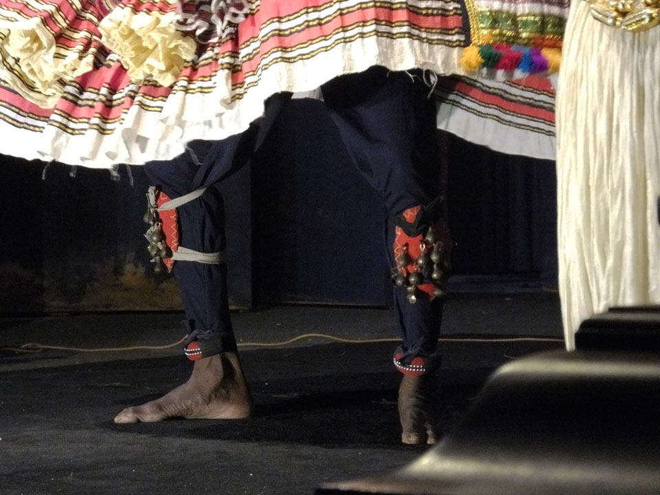 Nachdem die Maskenschminke vorüber war, ging es los mit einem netten Tanz eines Mädels. Danach folgten die Männer mit Grimassen, die verschiedene Emotionen darstellten – auch als Frau verkleidet. Die Sache ähnelt Pantomime. Mit Trommel und Tamburin waren alle Bewegungen exakt zum Rhythmus. Teilweise sah das zwar improvisiert aus, folgte dann aber mit der Musik wohl einer klare Choreografie.