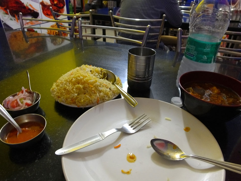 Nach einer Stunde war’s vorbei. Man hätte noch Photos mit den Akteuren machen lassen können, nur nicht mit dem Mädel, ha. Ich hatte aber Hunger und ging heute mal in ein anderes Restaurant. Bryiani Reise und dann noch ein vegetarisches Curry schmeckten gut. Hier gab’s auch mal Wechselgeld auf 2000.