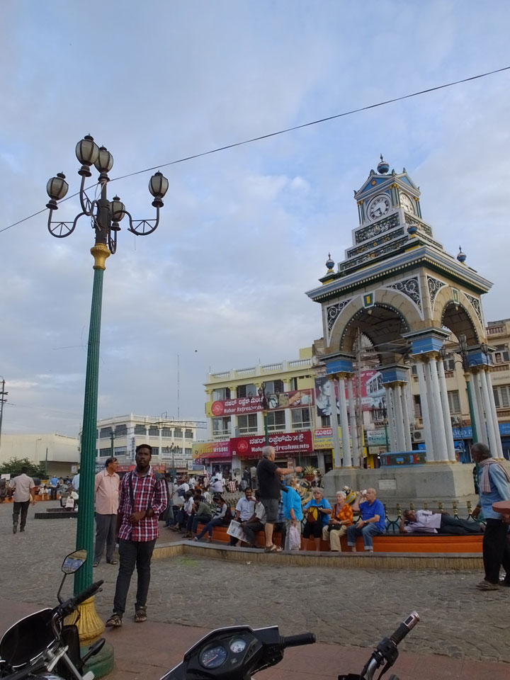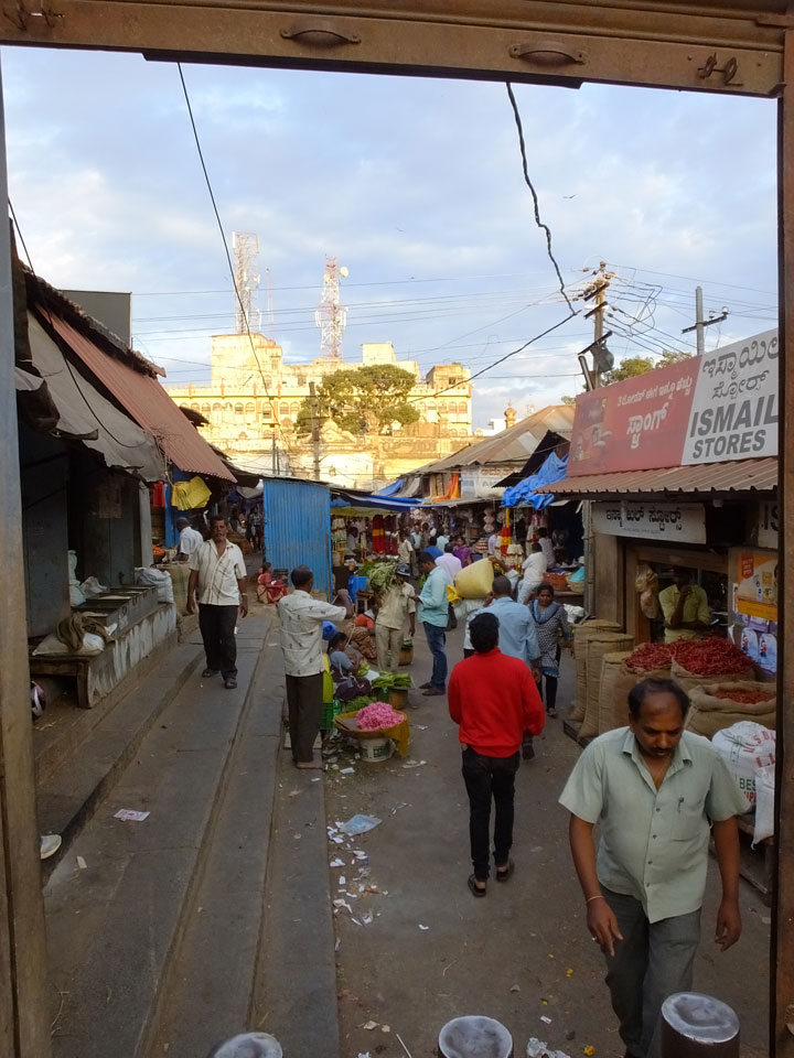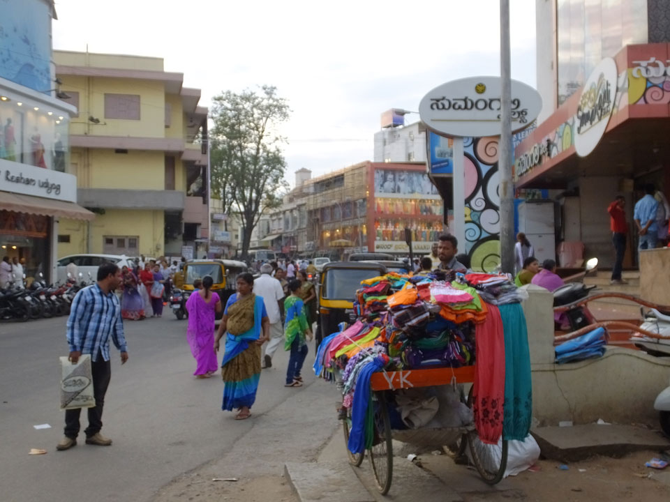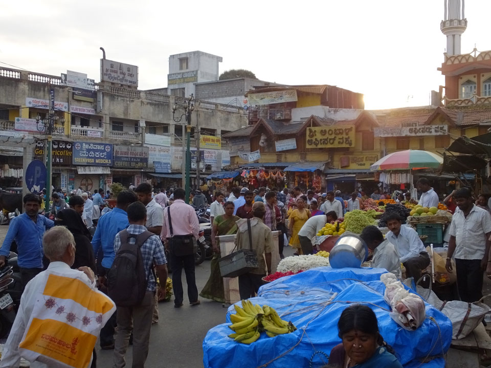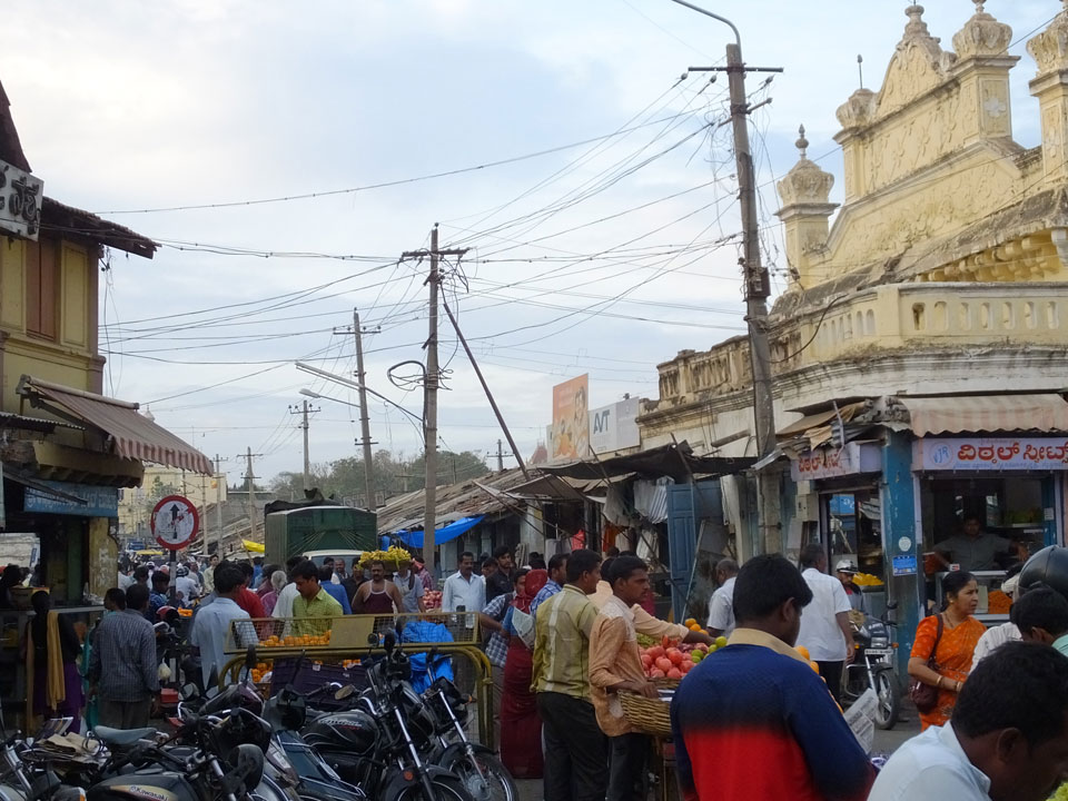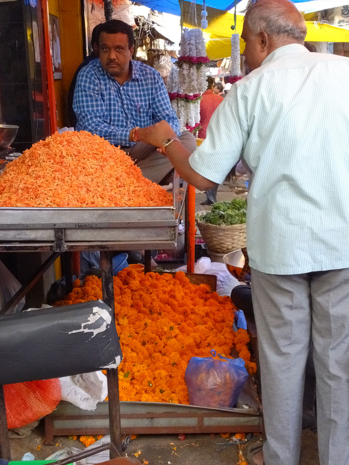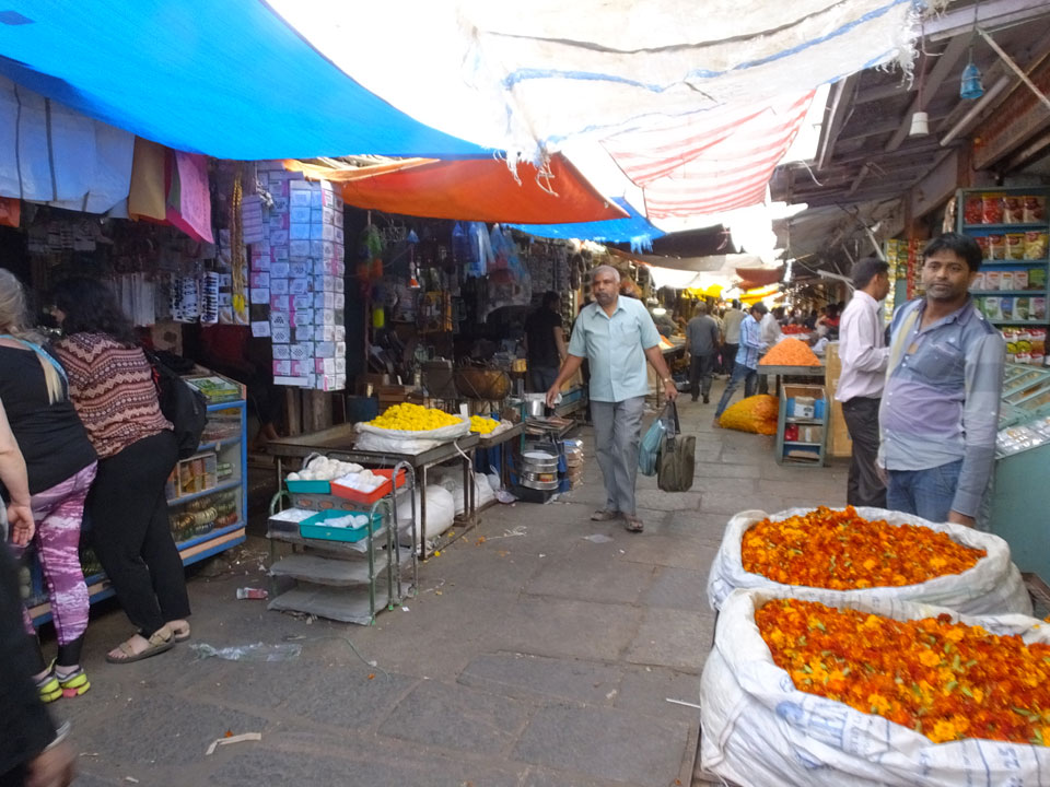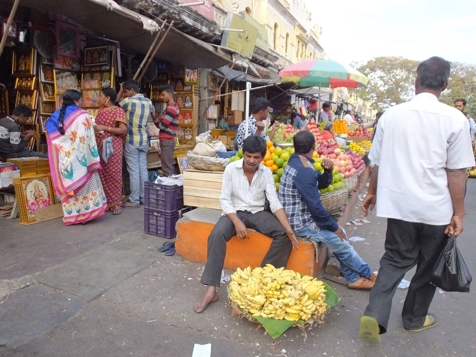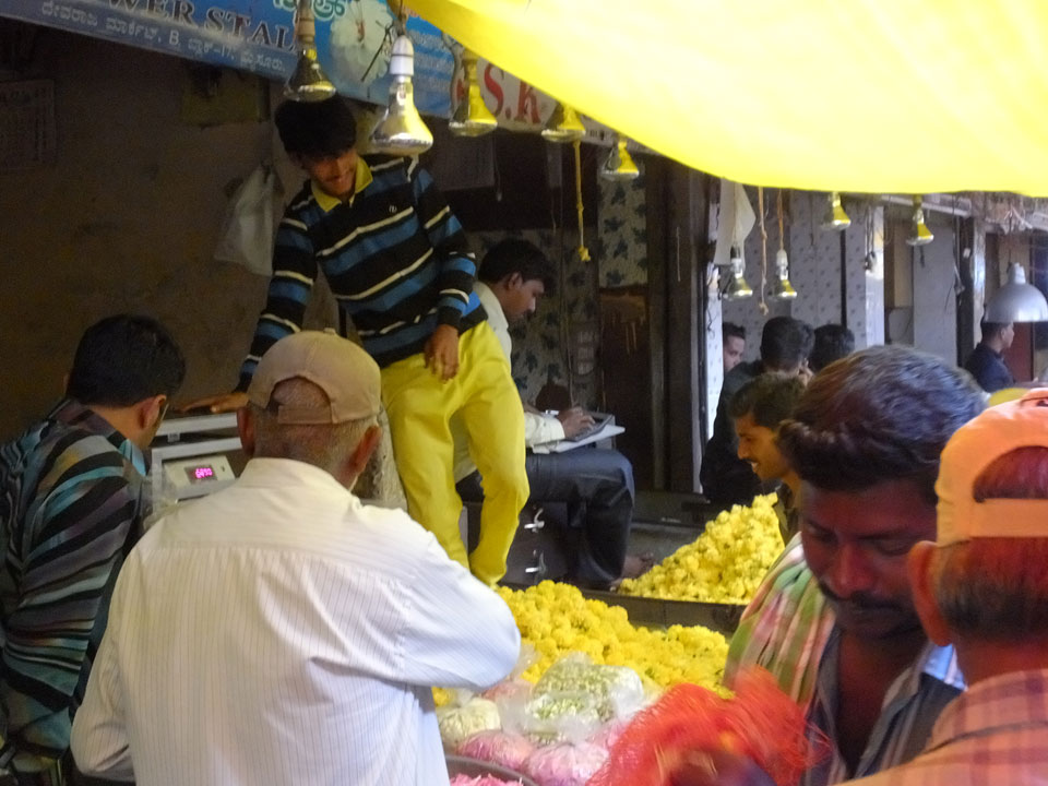 Ich ging nach 17:00 die vielleicht 10 Minuten zum Markt. Der Devaraja Markt war riesig und war etwas anstrengend. Immer wieder kommen Inder auf einen zu, fragen woher man kommt und so weiter. Hand schütteln soll ich auch immer. Mag ich nicht, weil die auch einen extrem laschen Händedruck haben. Irgendwo gibt es wohl einen Kurs, wie man Touristen zum Kauf animiert, denn alles läuft ständig gleich ab. Danke, kein Interesse an Räucherstäbchen. Das wird sogar auf Deutsch angeboten. Weiterhin wurden heute viele Blumen verkauft. Morgen ist Tag der Republik.