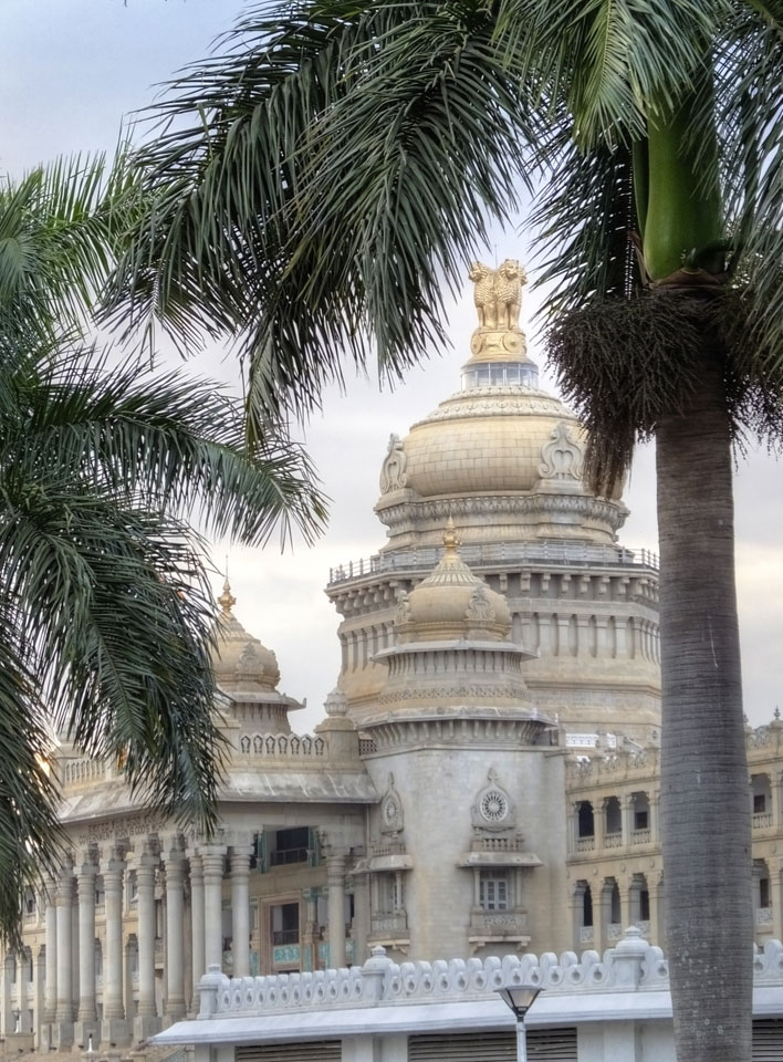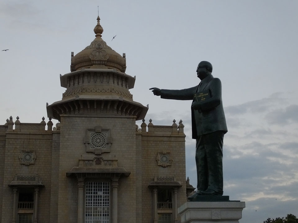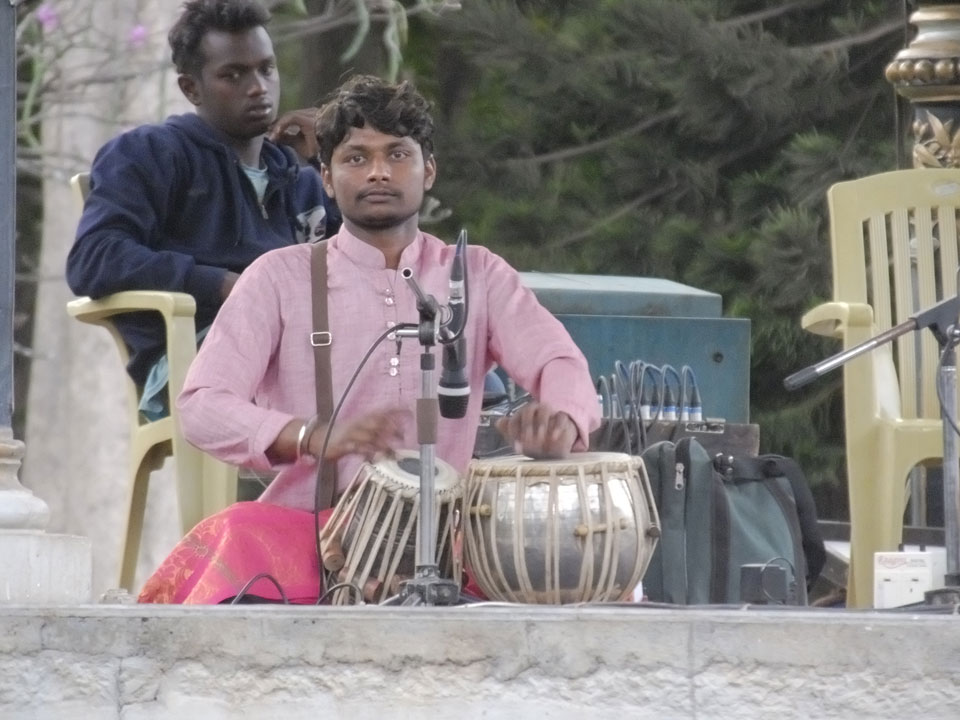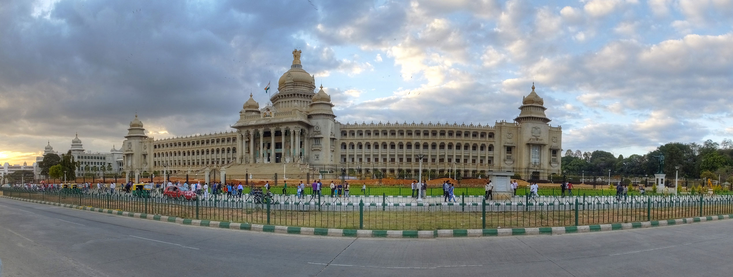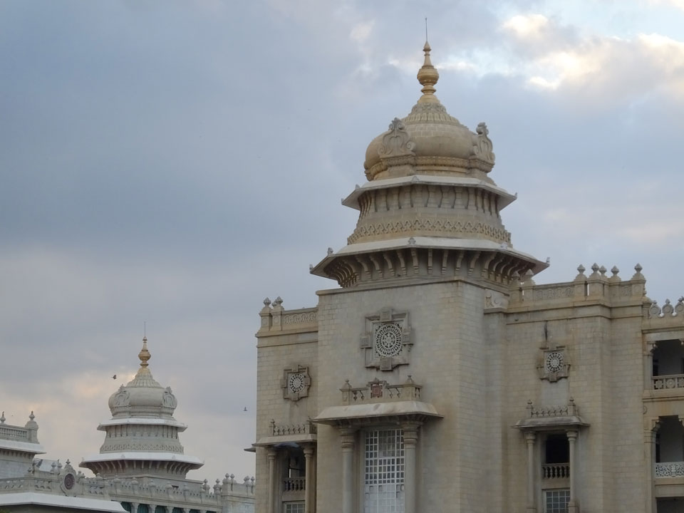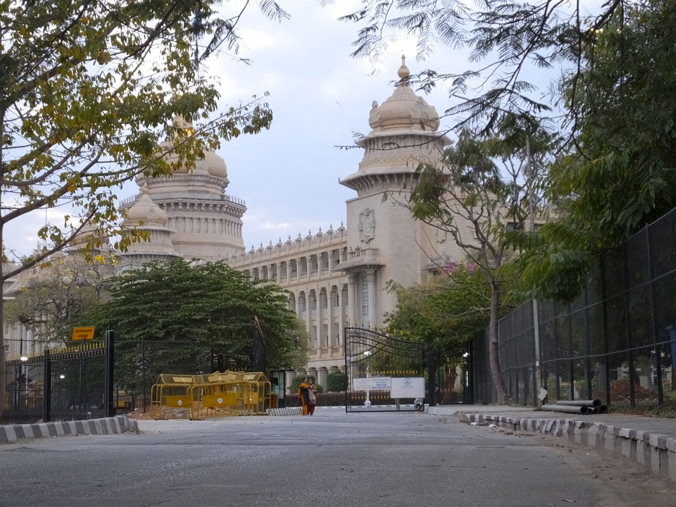 Im Garten wurde gesungen und musiziert. Das Hohes Gericht Karnataka ist dynamorot angestrichen und wird auch vn den Indern gern als Hintergrundmotiv für Photos genutzt. Vorbei da zur Vidhana Soudha, dem Regierungssitz. Da wurde auch viel geknipst. Mit dem Sonnenuntergang sah das ganz nett aus.
