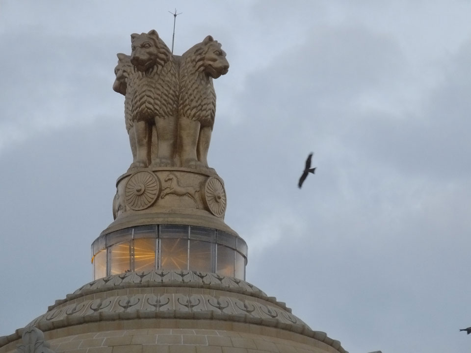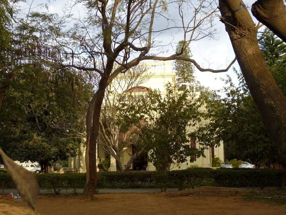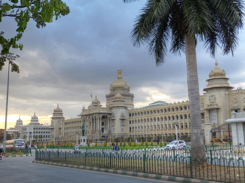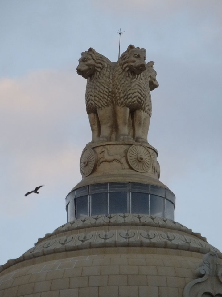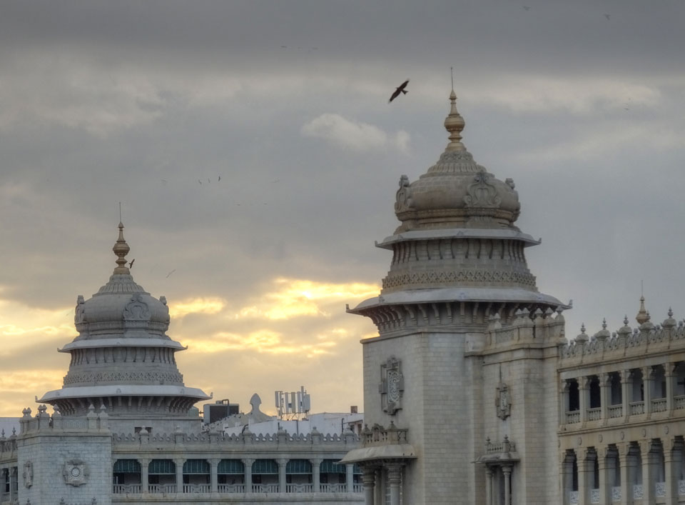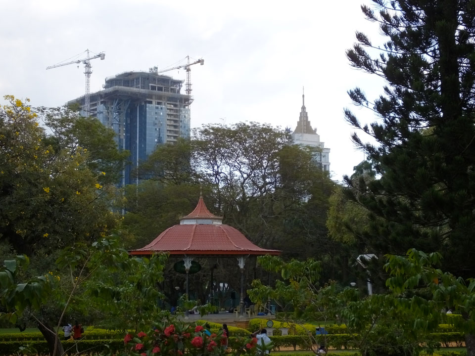 Im Garten wurde gesungen und musiziert. Das Hohes Gericht Karnataka ist dynamorot angestrichen und wird auch vn den Indern gern als Hintergrundmotiv für Photos genutzt. Vorbei da zur Vidhana Soudha, dem Regierungssitz. Da wurde auch viel geknipst. Mit dem Sonnenuntergang sah das ganz nett aus.
