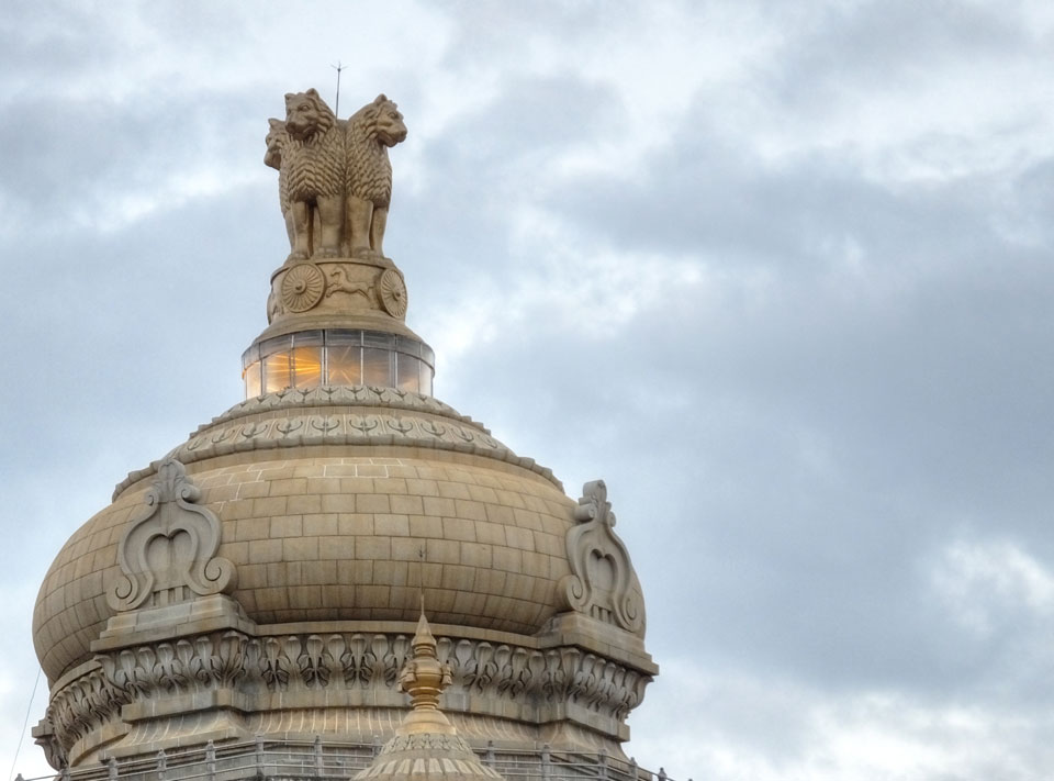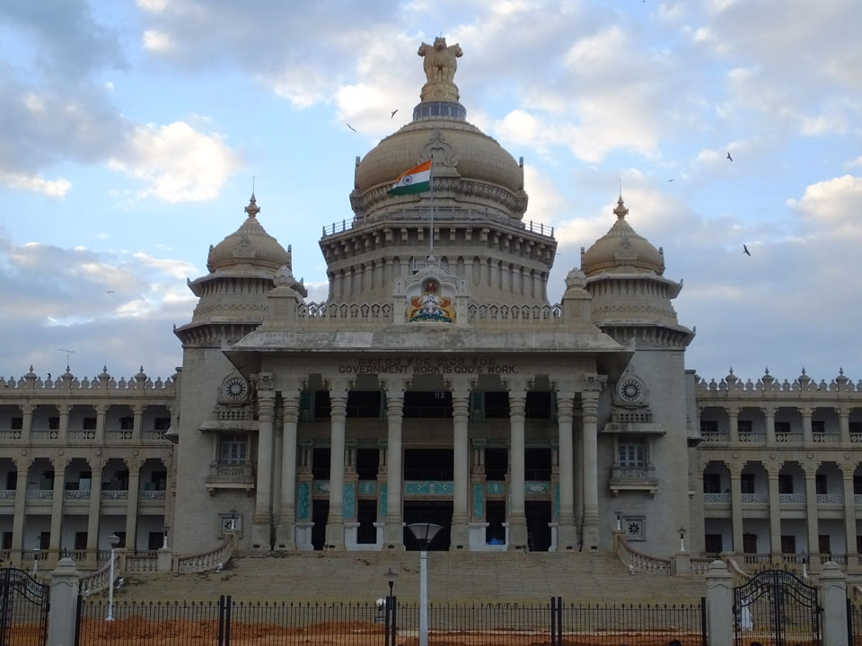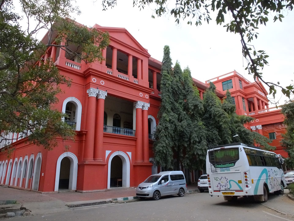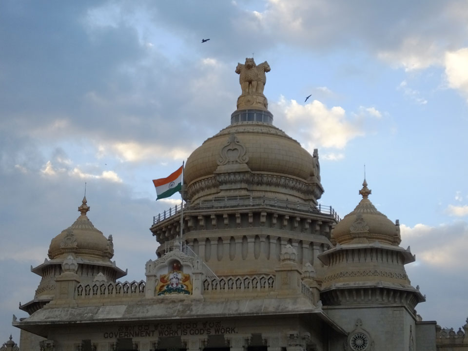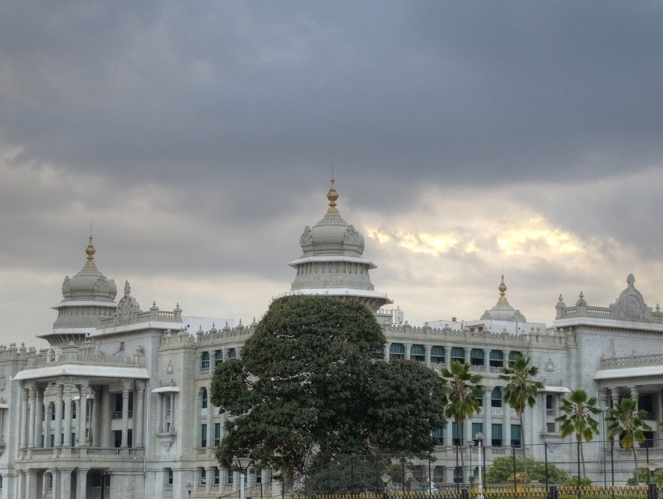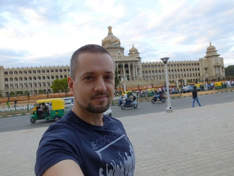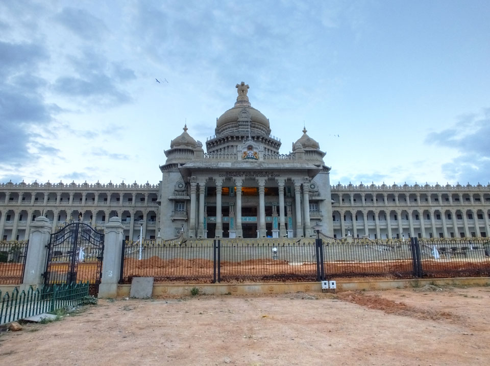 Im Garten wurde gesungen und musiziert. Das Hohes Gericht Karnataka ist dynamorot angestrichen und wird auch vn den Indern gern als Hintergrundmotiv für Photos genutzt. Vorbei da zur Vidhana Soudha, dem Regierungssitz. Da wurde auch viel geknipst. Mit dem Sonnenuntergang sah das ganz nett aus.