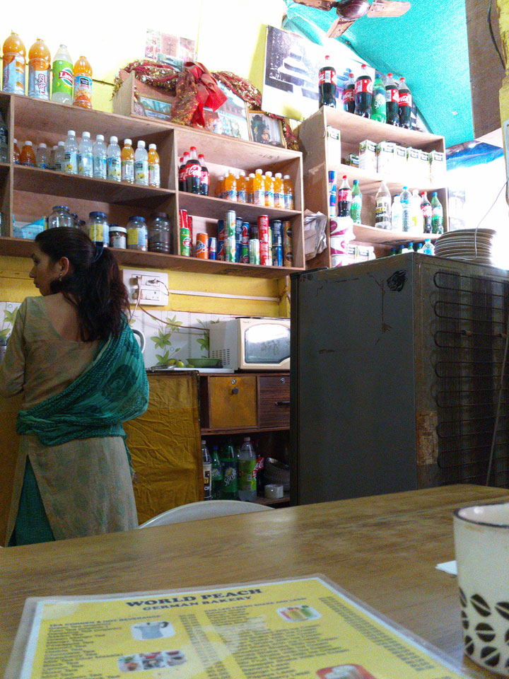 In einem nepalesischem Laden, das auch „German Bakery“ war, hatte ich Mango Kuche, Spezial-Fühstück und dann noch einen Extra-Kaffee. Halbwegs munter inzwischen nahm ich doch einen Moped-Fahrer. Der wollte erst 70, als ich dann schnurstraks wegging, kamen doch die gewünschten 50 raus.