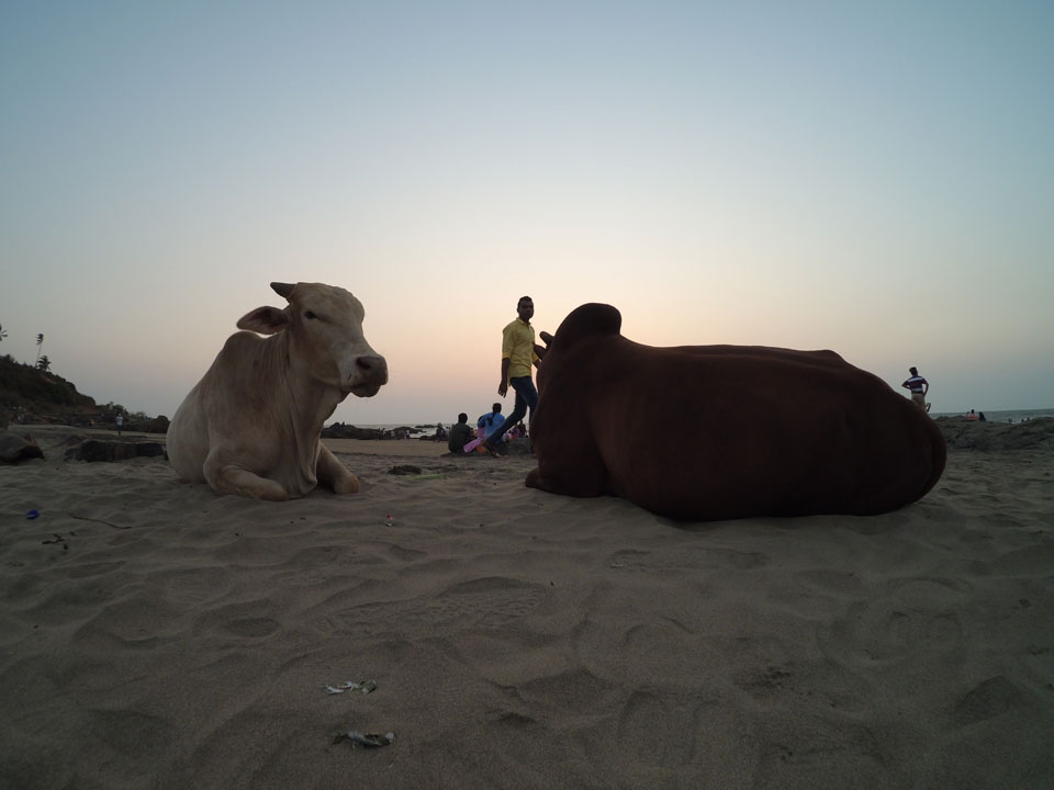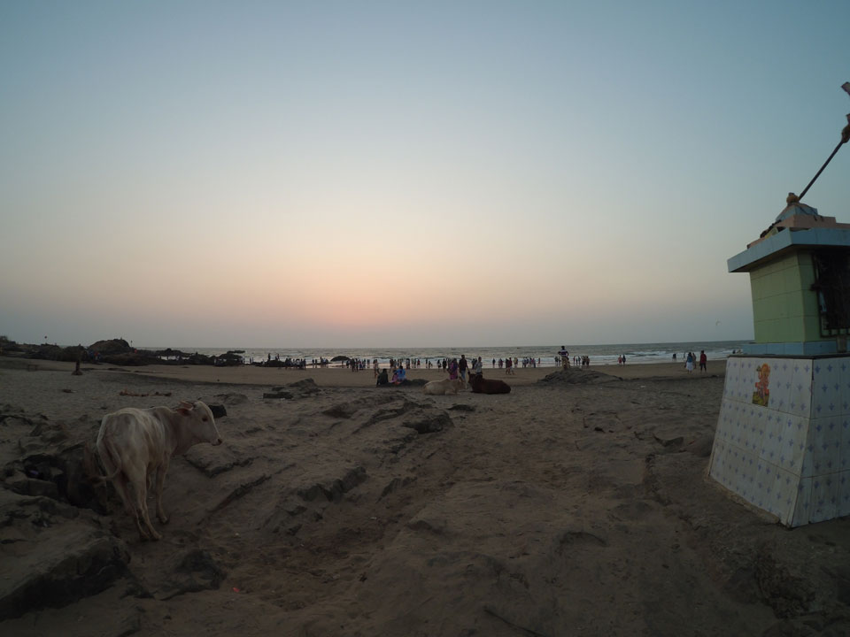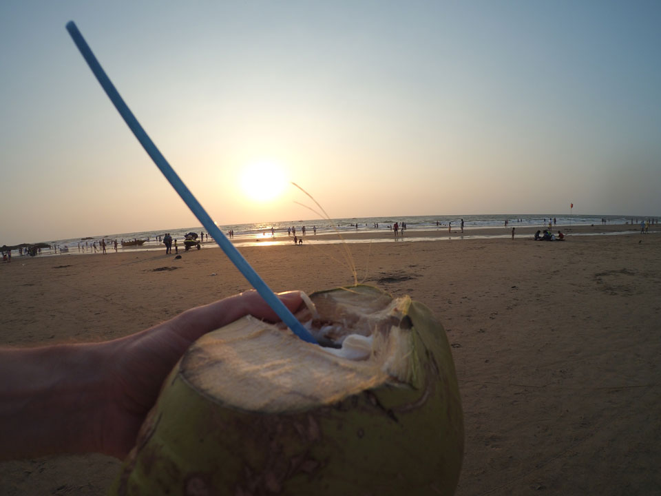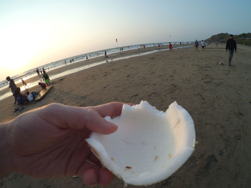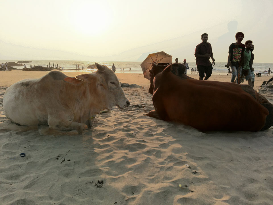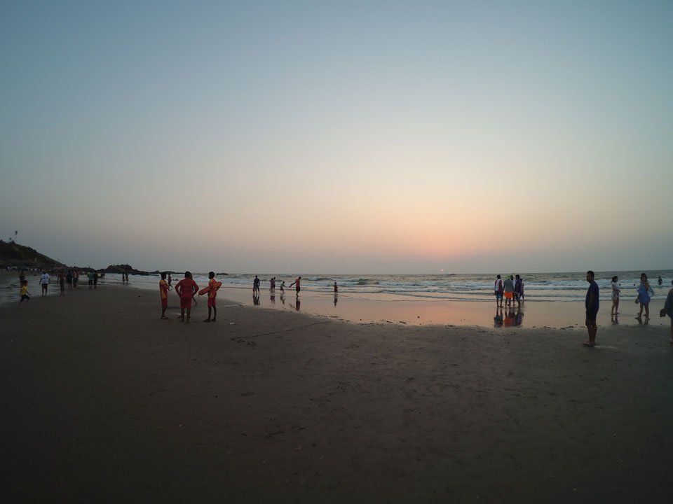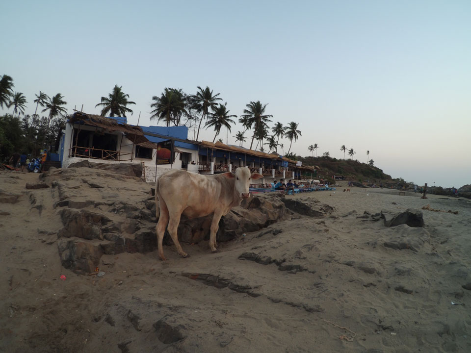 Vagator Beach war von mehr Indern besucht. Mir gefiel es hier nicht so, weil der Strand feucht und damit wenig zum Hinsetzen geeignet war. Kühe lagen herum, ein Hund bellte eine lethargische Kuh an. Ich kaufte eine Kokosnuss (50) unnd knipste den Sonnenuntergang. Durch den frischen Wind hatte ich keine Lust auf Baden. Auch hier wurde von den Rettungsschwimmern heute wieder viel getrillert.