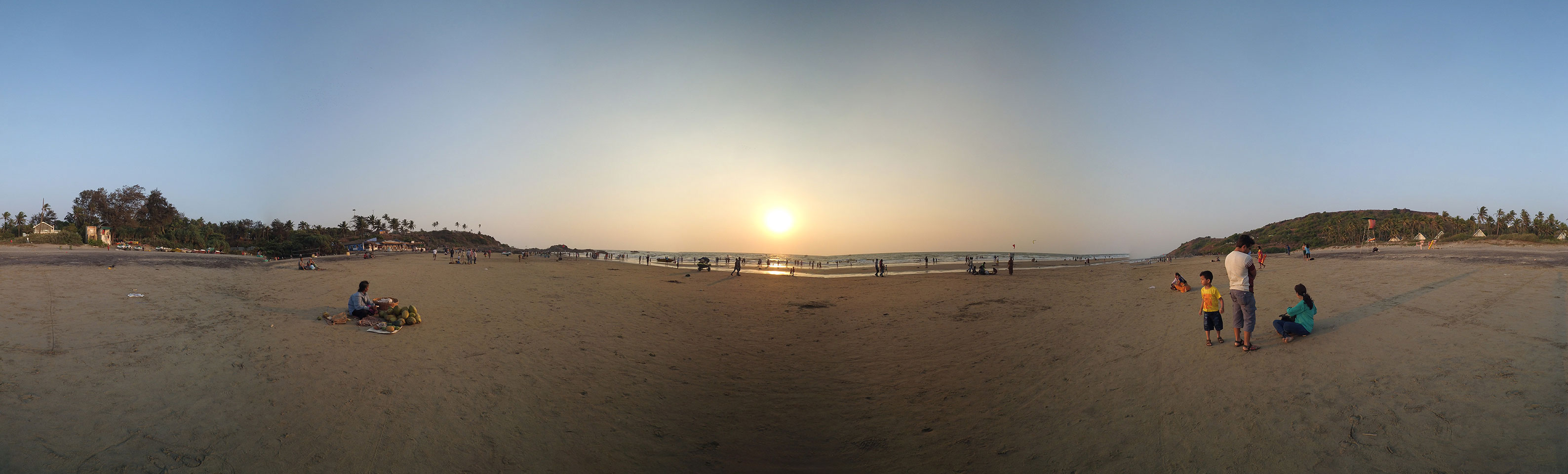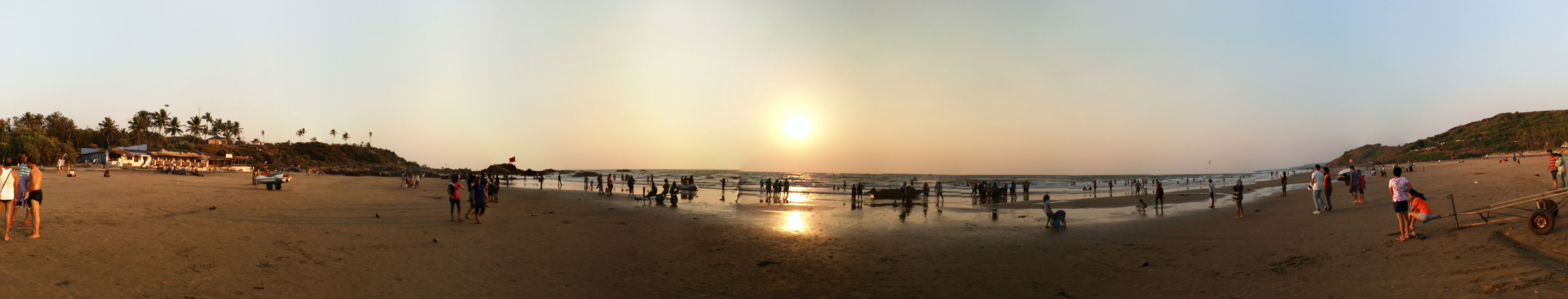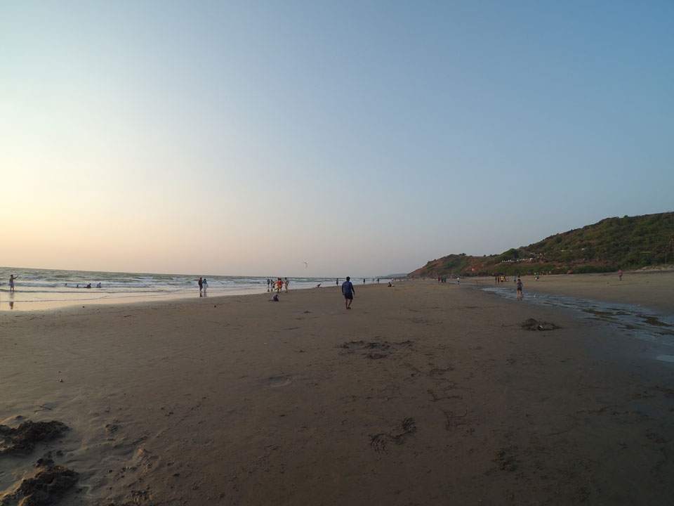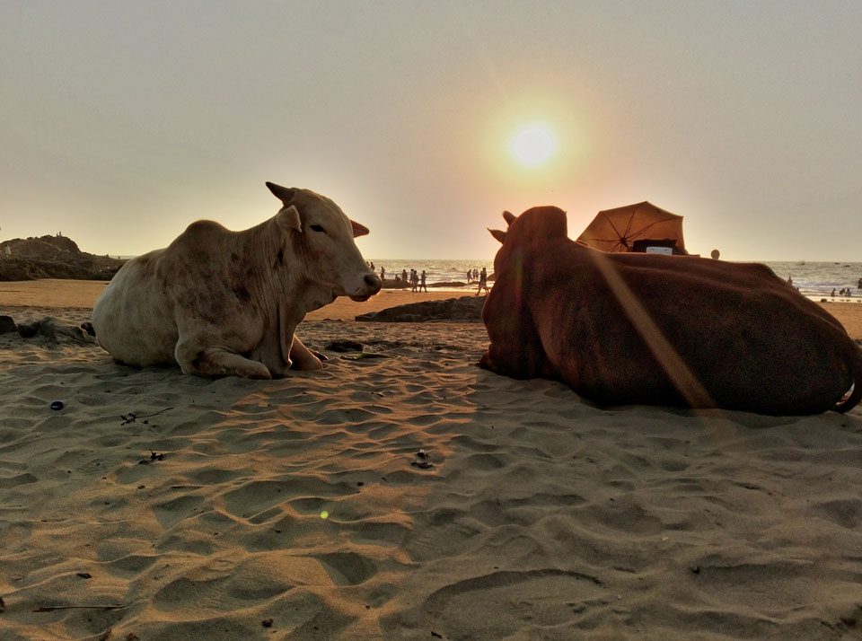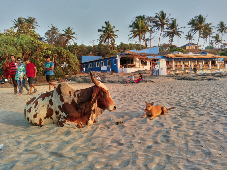 Vagator Beach war von mehr Indern besucht. Mir gefiel es hier nicht so, weil der Strand feucht und damit wenig zum Hinsetzen geeignet war. Kühe lagen herum, ein Hund bellte eine lethargische Kuh an. Ich kaufte eine Kokosnuss (50) unnd knipste den Sonnenuntergang. Durch den frischen Wind hatte ich keine Lust auf Baden. Auch hier wurde von den Rettungsschwimmern heute wieder viel getrillert.