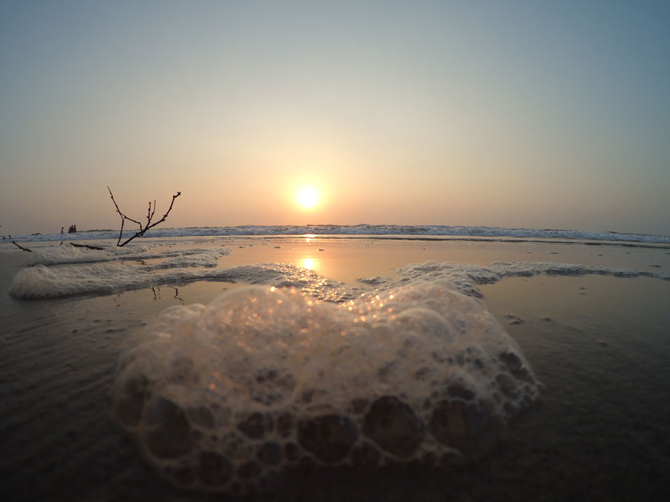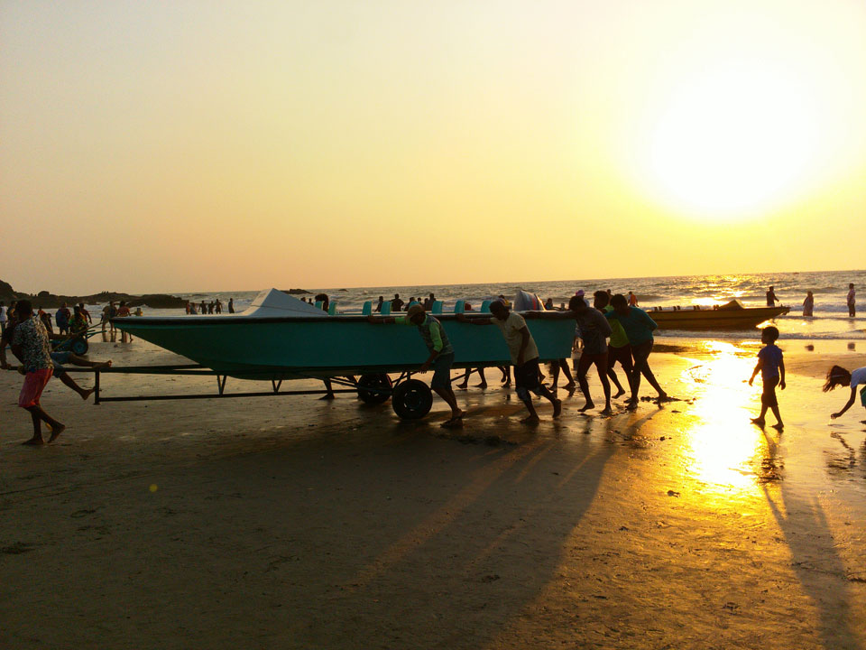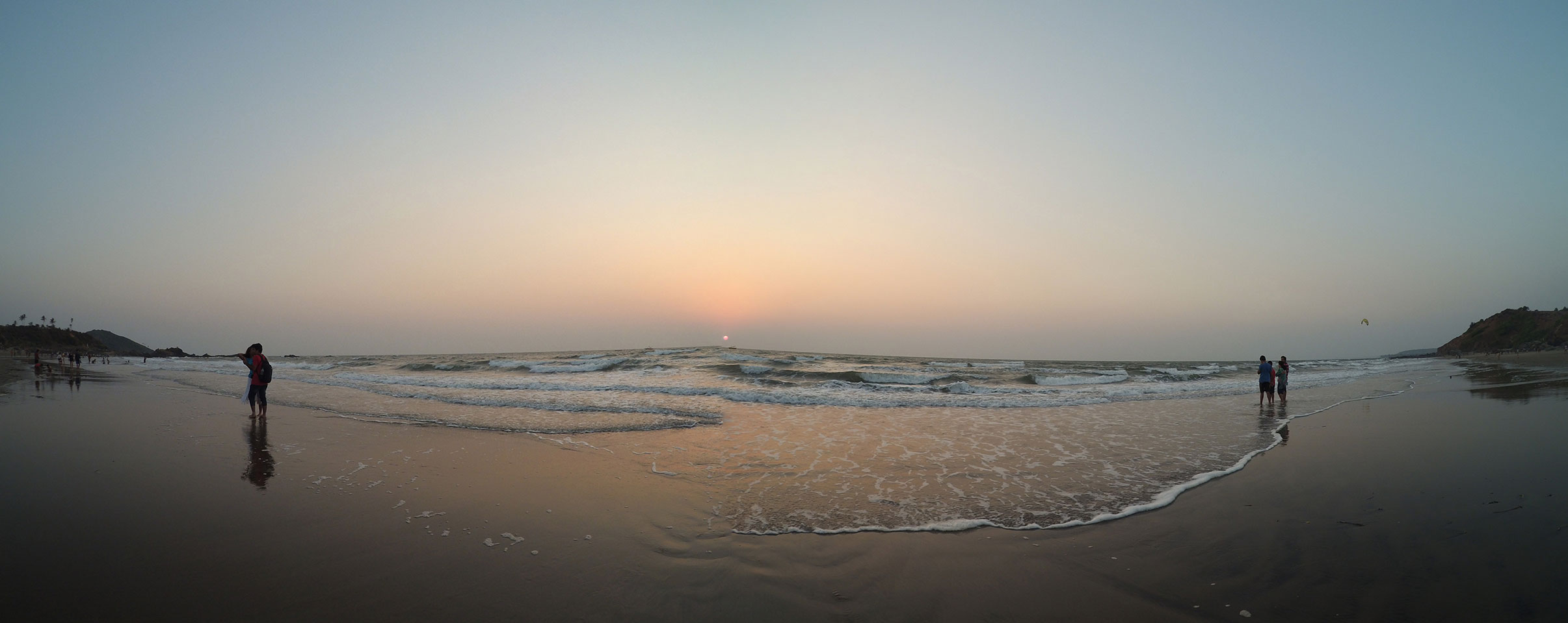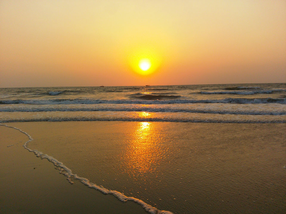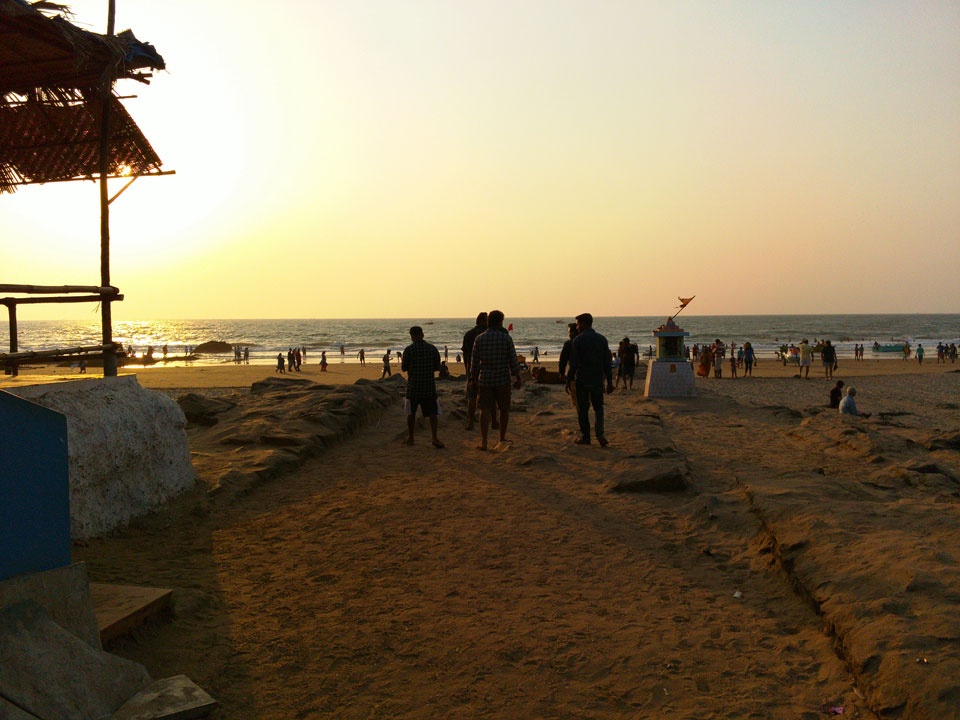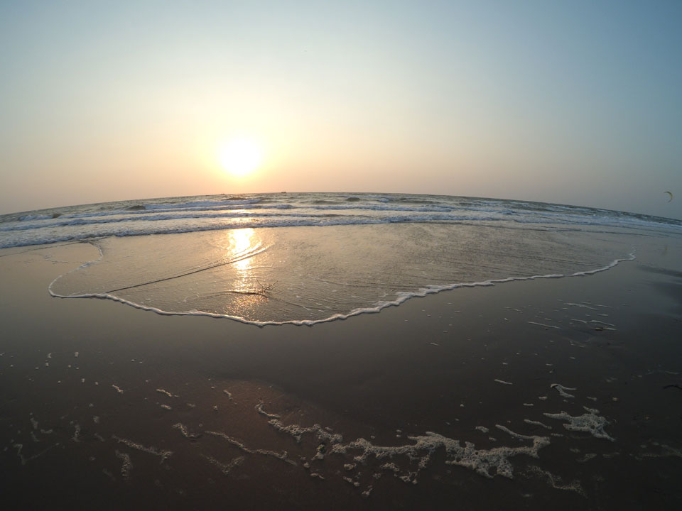 Vagator Beach war von mehr Indern besucht. Mir gefiel es hier nicht so, weil der Strand feucht und damit wenig zum Hinsetzen geeignet war. Kühe lagen herum, ein Hund bellte eine lethargische Kuh an. Ich kaufte eine Kokosnuss (50) unnd knipste den Sonnenuntergang. Durch den frischen Wind hatte ich keine Lust auf Baden. Auch hier wurde von den Rettungsschwimmern heute wieder viel getrillert.
