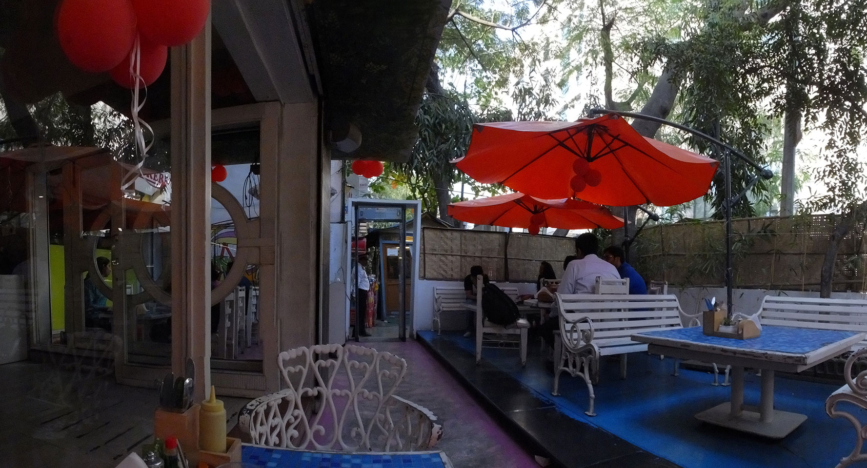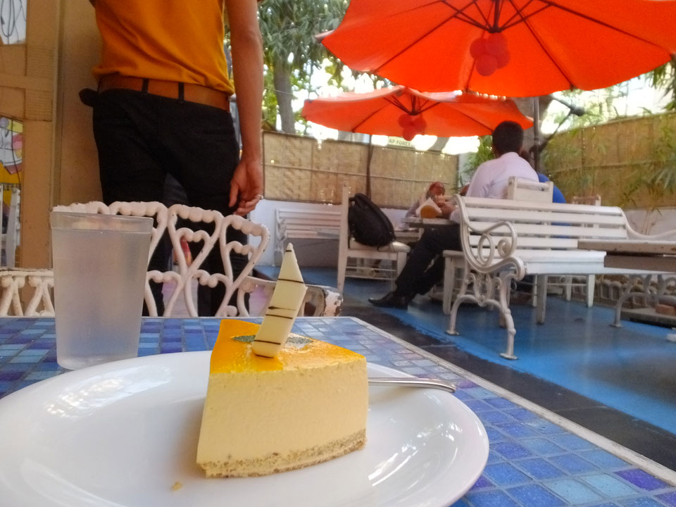 Ein kleines gemütlichen Café mit einigen Leuten. Ich sah den ersten Osh Jünger in weinrotem Gewand draußen, hatte einen Cappuccino und eine Mango-Torte für knapp 300 Rupees.