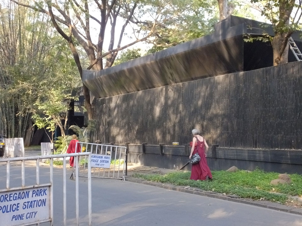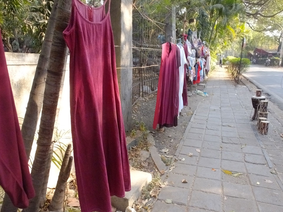 Danach ging ich die Straße runter zum Osho Ashram. Auf dem Weg verkaufte doch tatsächlich ein Straßenhändler die weinroten Umhänge. Ich knipste ein paar Bilder, fühlte mich da aber aufgrund der Sicherheitsleute nicht so wohl. Insgesamt war hier doch wneiger los, als ich erwartet hatte.