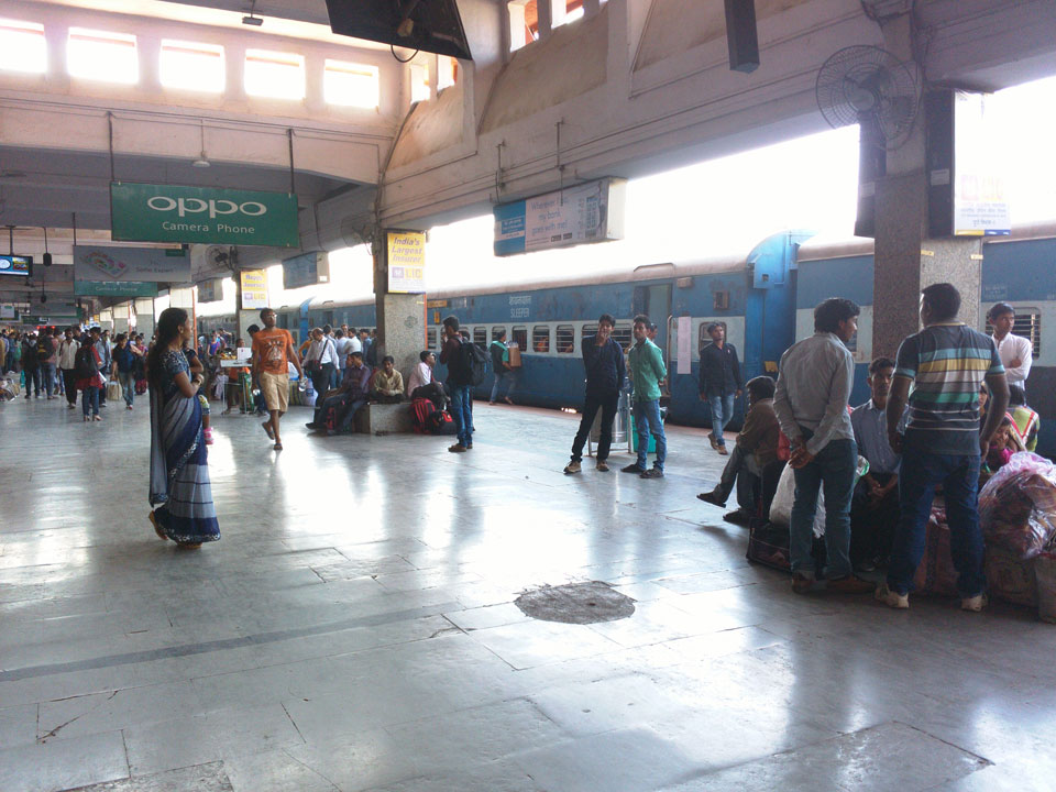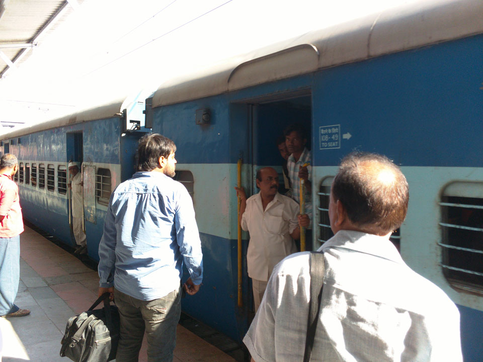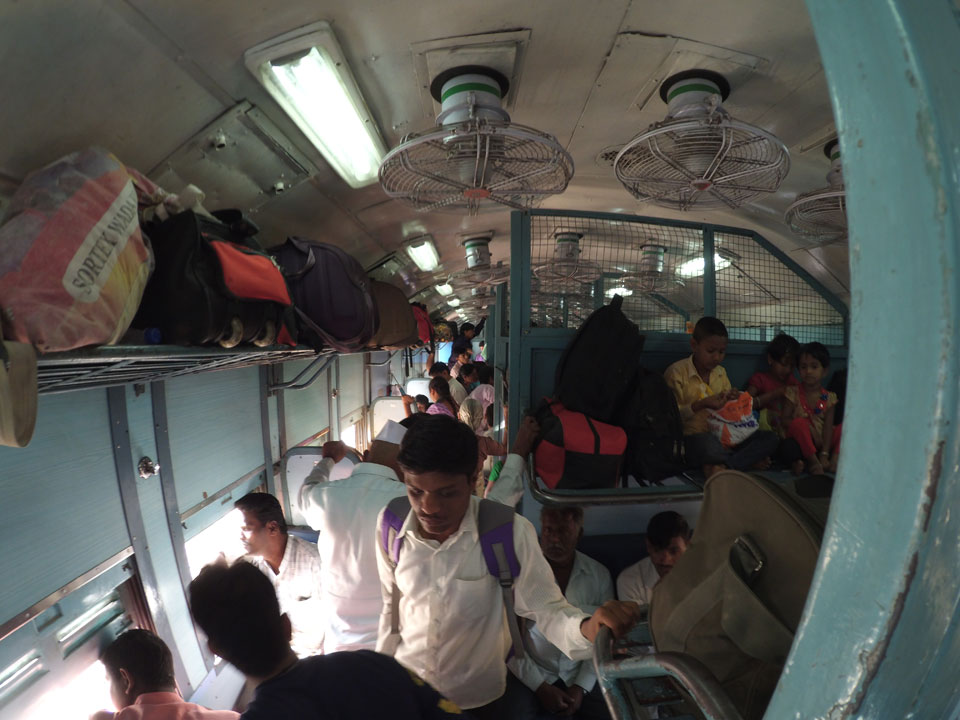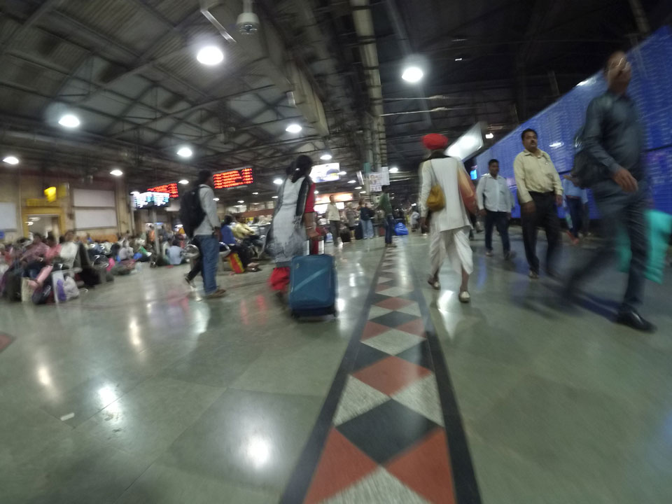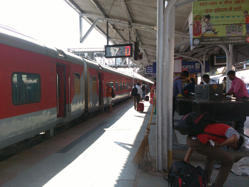 Mit einem Tuktuk (22->30 Rupees) ging’s zum Bahnhof. Dort saßen an den Fahrkarten-Automaten Leute, die einem das Ticket kauften. Die 5%, die man am Automaten spart, sind damit wohl deren Lohn. Nach Mumbai in der General Seating-Kategorie kostete das gerade 70 Rupees (€1).
