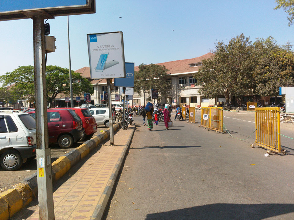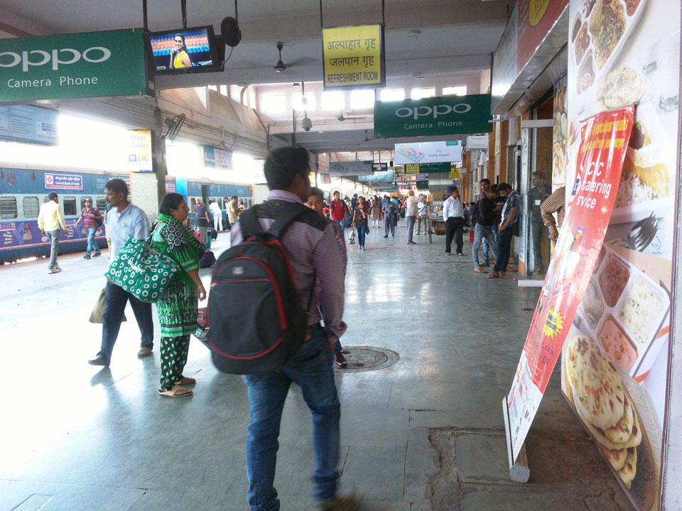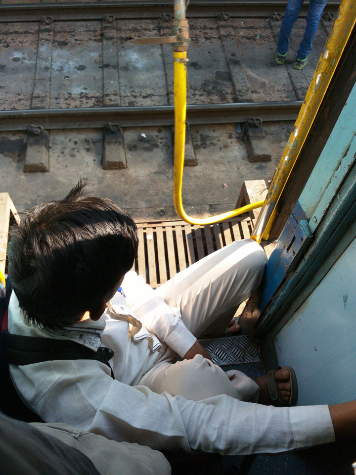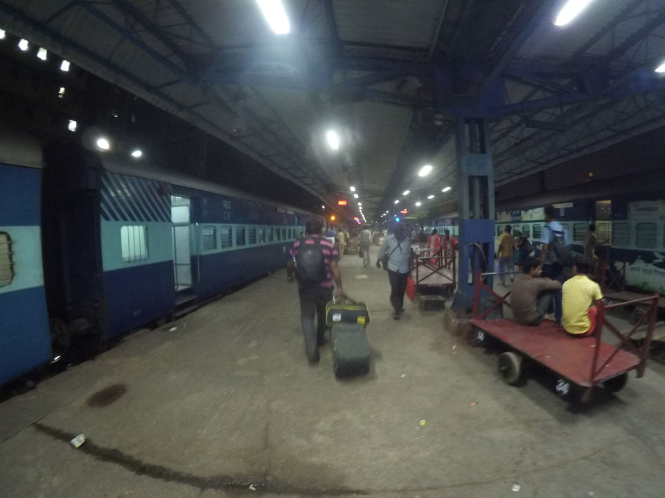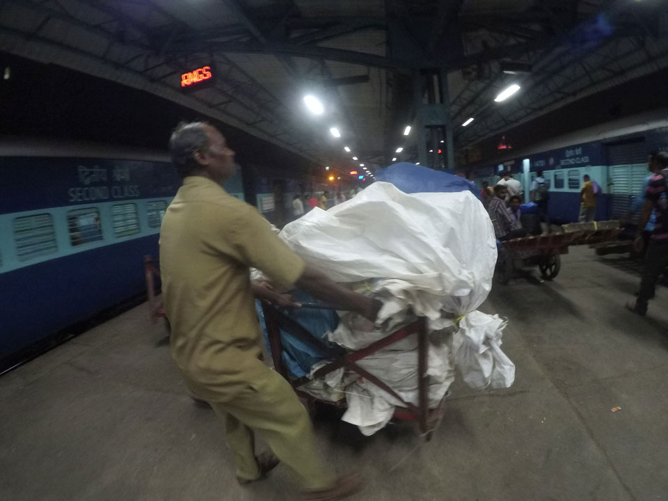 Mit einem Tuktuk (22->30 Rupees) ging’s zum Bahnhof. Dort saßen an den Fahrkarten-Automaten Leute, die einem das Ticket kauften. Die 5%, die man am Automaten spart, sind damit wohl deren Lohn. Nach Mumbai in der General Seating-Kategorie kostete das gerade 70 Rupees (€1).