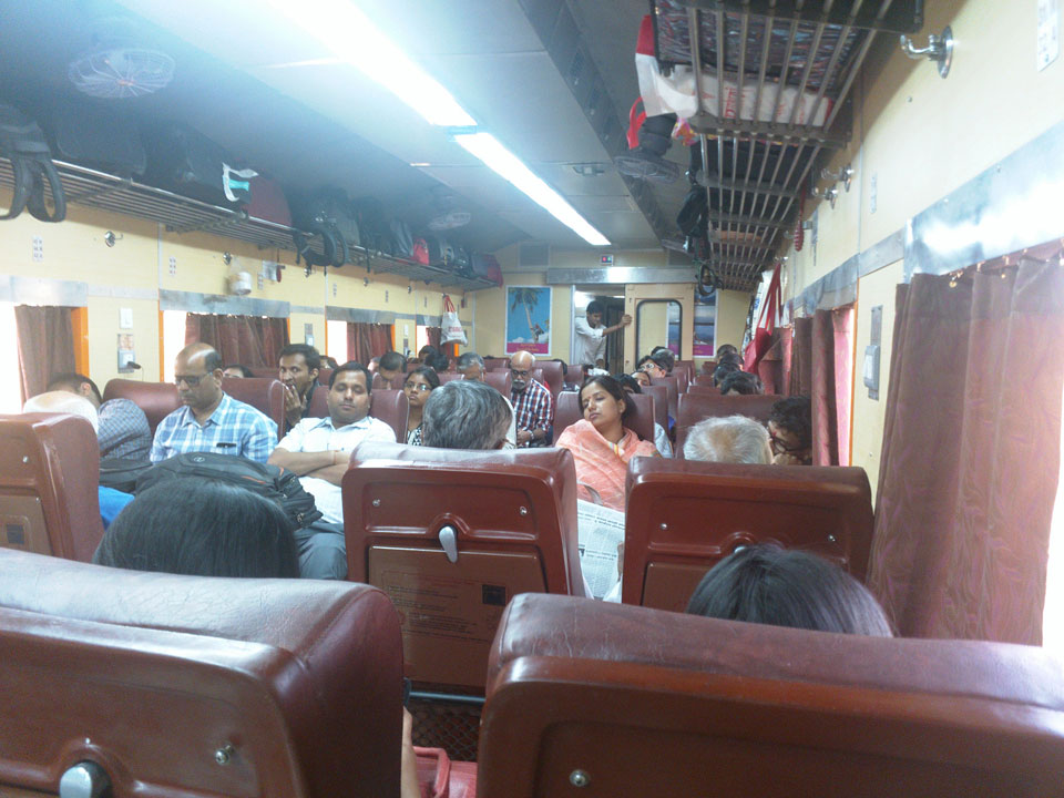 Von Cleartrip hatte ich zwar die Bestätigung meines Tickets, doch in der App sieht man nicht den Sitzplatz. Ich wurde von meinem auserkorenen Platz 6 erst mal weggescheucht. Eine weitere Website offenbahrte den Platz 26 für mich. Der AC-Chair Wagon wurde auch voll. Keine freien Plätze.