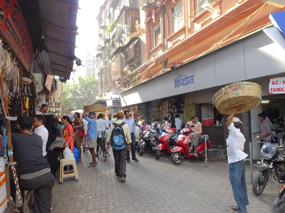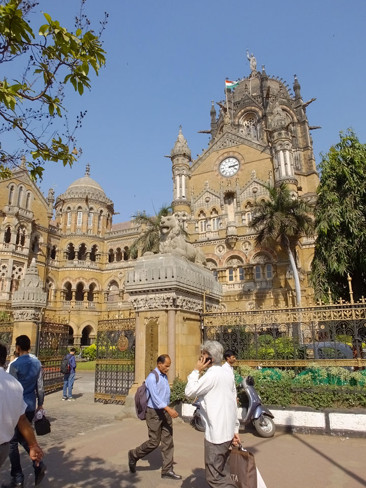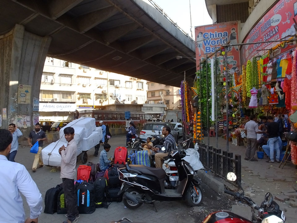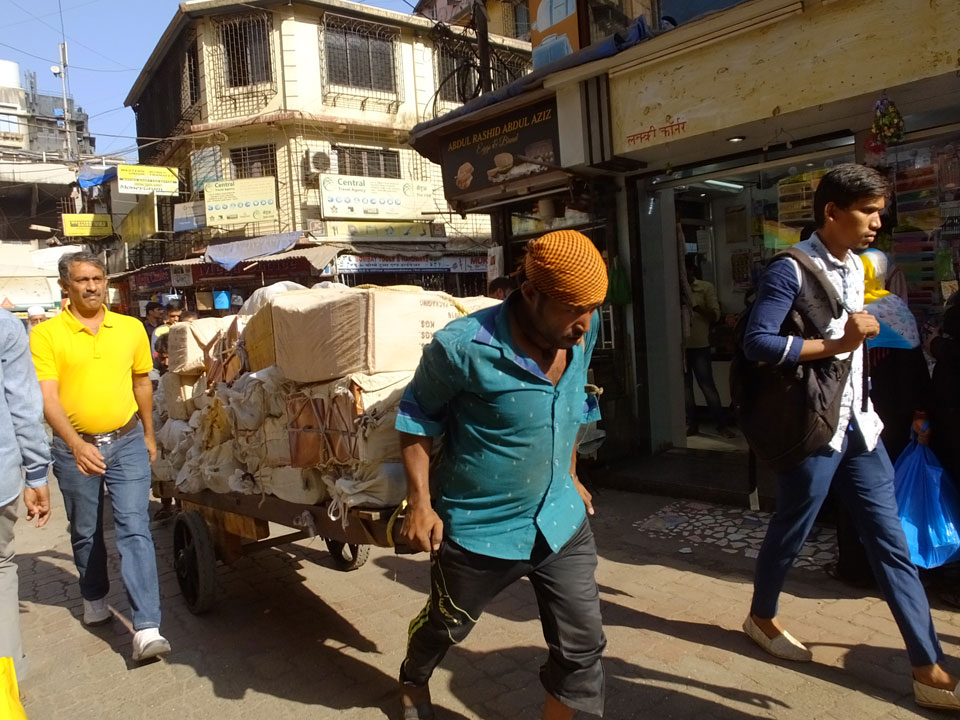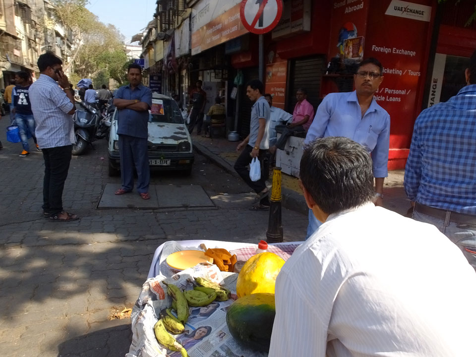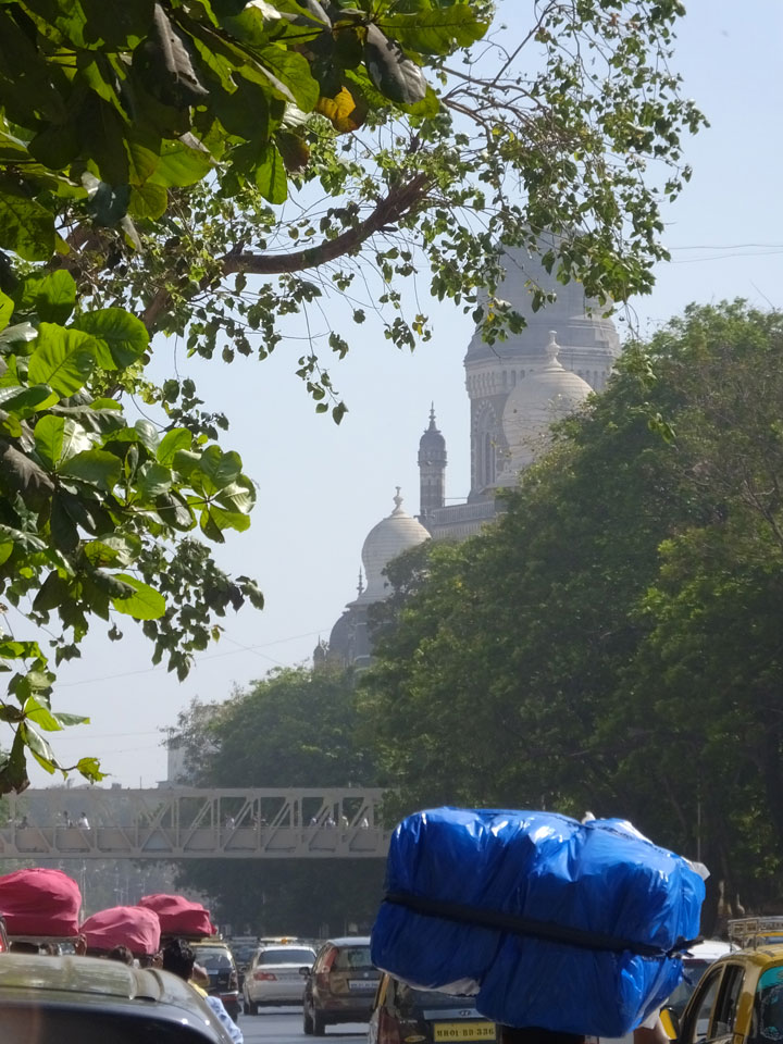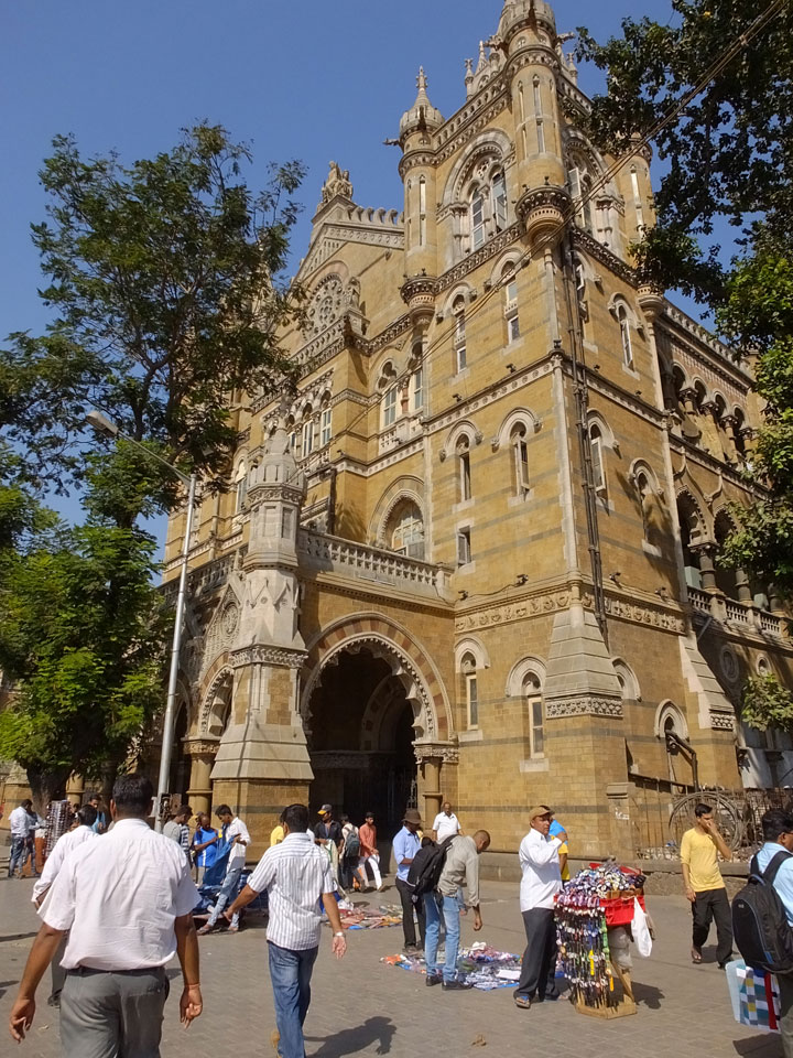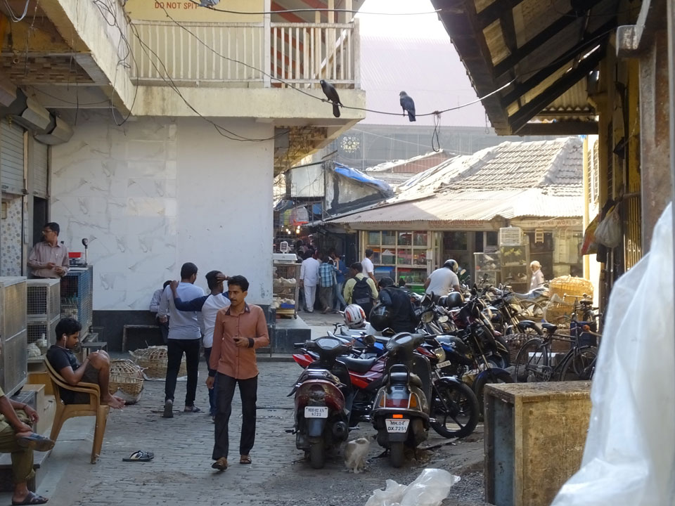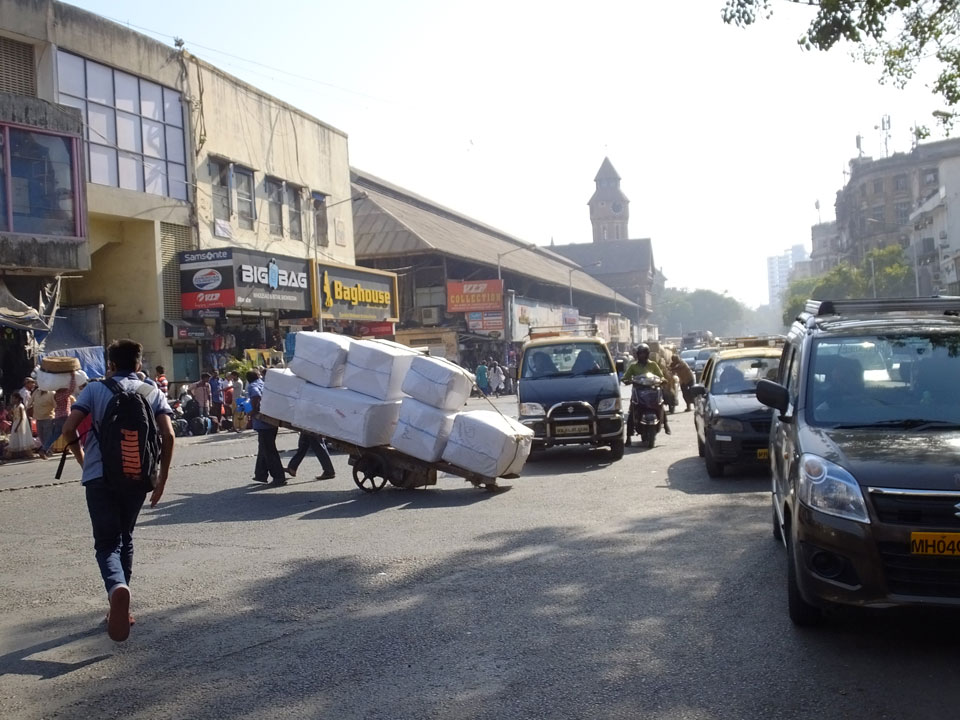 Ich landete also am „Mahatma Jyotiba Phule Mandai“ (Crawford Market) und schaute mich dort etwas um. Der Markt war damals verganenen Montag auch auf meiner Liste, schaffte ihn nicht mehr. Die Atmosphäre dort war chaotisch. Auf der Straße hupten überall Autos und Mopeds. Unzählige Leute schleppten und zogen irgendwelche Kartons umher. Dann im Markt wollten Anwerber mich für irgendwelche „Spices“ begeistern. Ich hatte Null Interesse an Gewürzen, was die Leute aber nicht akzeptierten. Jeder Tourist muss doch Gewürze wollen – ich aber nicht. Die Sache wurde ganz witzig, weil ein junger Typ sich an meine Fersen geheftet hatte und ich im Schlingelkurs um Leute und Stände herumeilte. Ich musste nach ein paar Kringeln in dieser Verfolgungsjagd lachen, er auch.