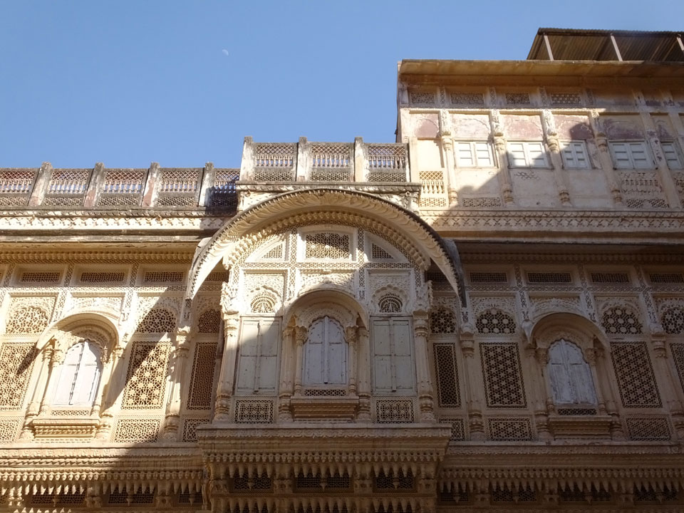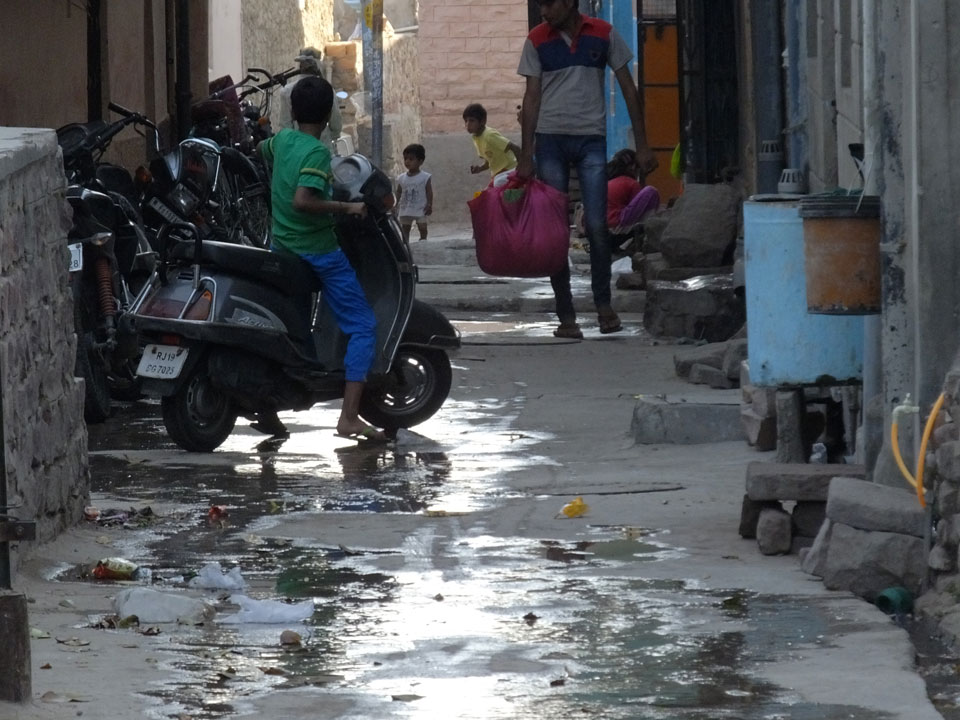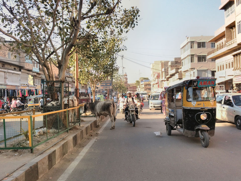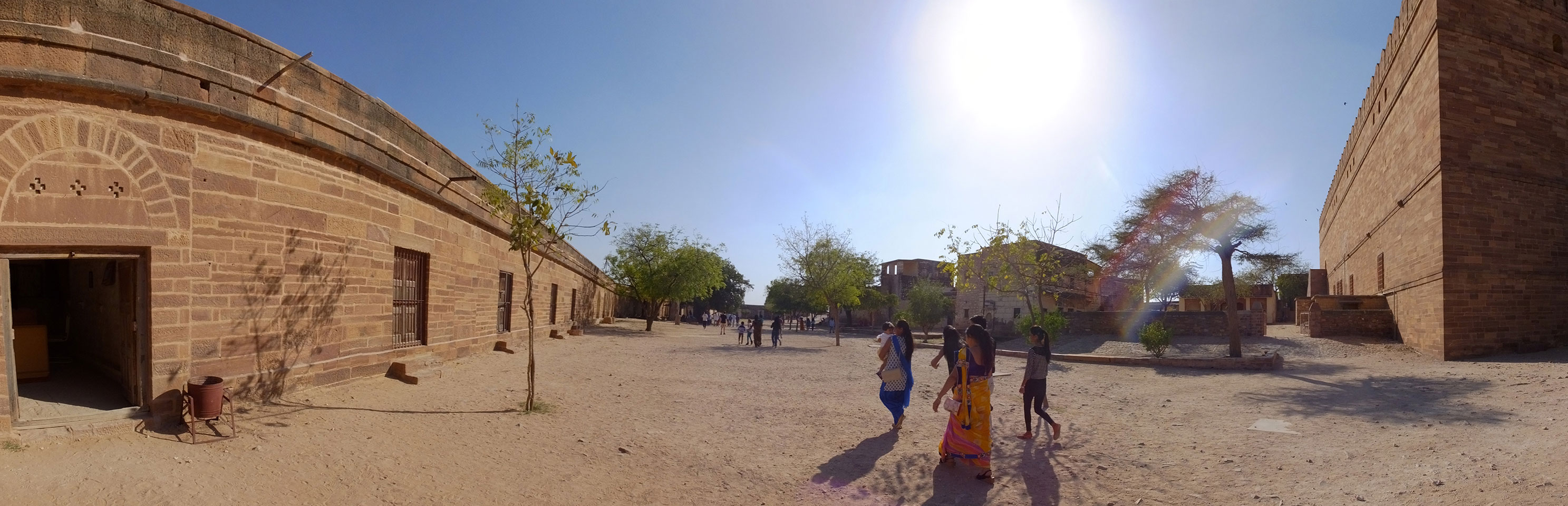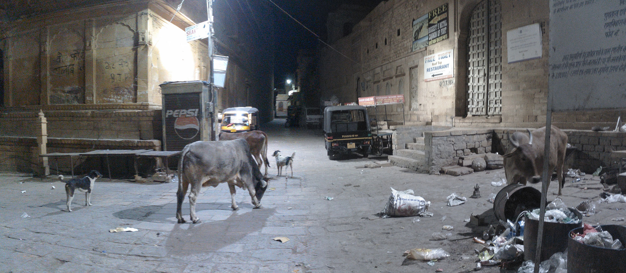 Auf booking.com war die GPS Position gleich am Eingang angezeigt. Nur da war kein Ganesh Gästehaus. Ein paar Jugendliche, die zu dieser Stunde noch herum standen, riefen mir den Weg. Nur Kühe und Hunde, die im Müll nach Fressbarem suchten, fand ich dann in den Gassen der Festung. Jaisalmer ist eine lebendige Festung. Hier leben also wirklich Leute, die nur zur Zeit alle schliefen. Als dann Hunde stark bellten kam einer an’s Fenster und wies mir den letzten Abschnitt, den ich ohne seine Hilfe nicht gefunden hätte. In der Gasse kam mir ein Mann mit etwas zerfleddertem Unterhemd entgegen. Es war der Gästehausbesitzer, der meinen Anruf erhalten hatte. Seinen Rückruf hatte ich nicht erhalten aber gut. Ich hatte mein Zimmer, er machte kurz seinen Laden für ein paar Getränke auf und brachte mir noch Chapati mit Pickles. Damit hatte ich was im Magen, war vollauf zufrieden und konnte um 3 Uhr endlich einschlafen.