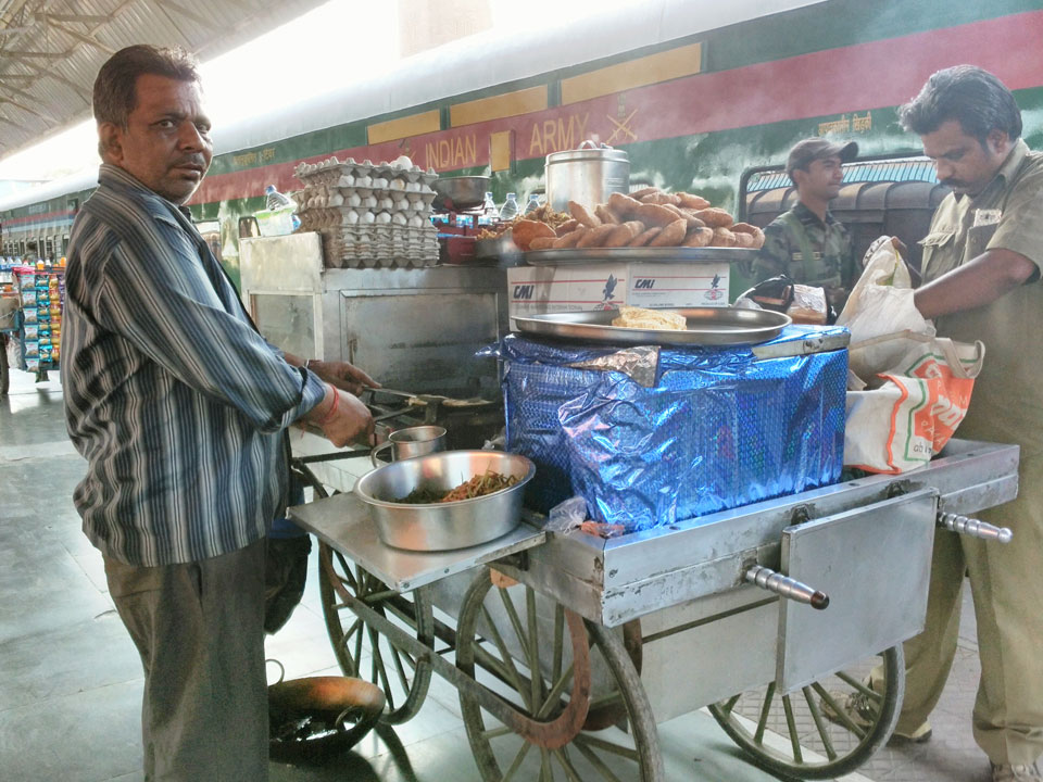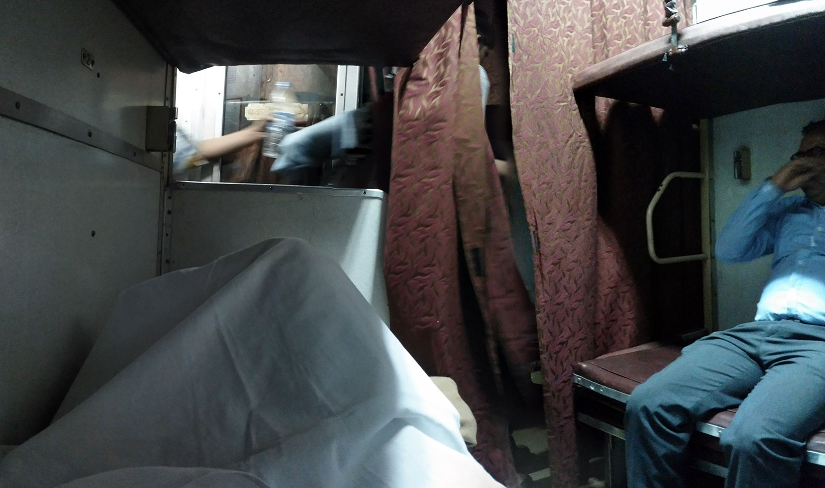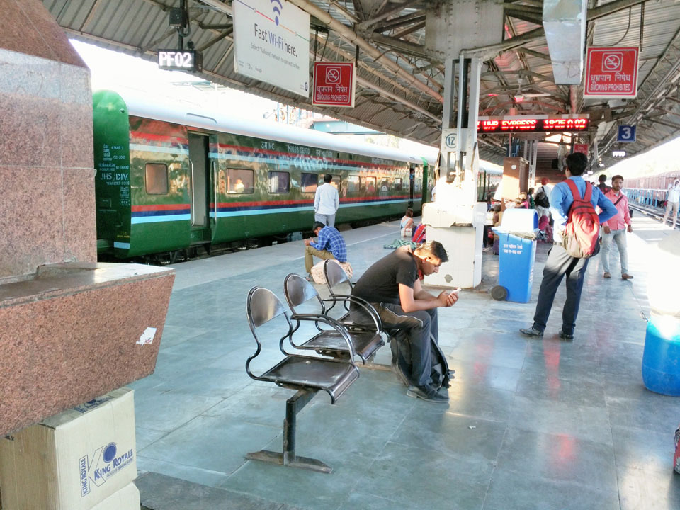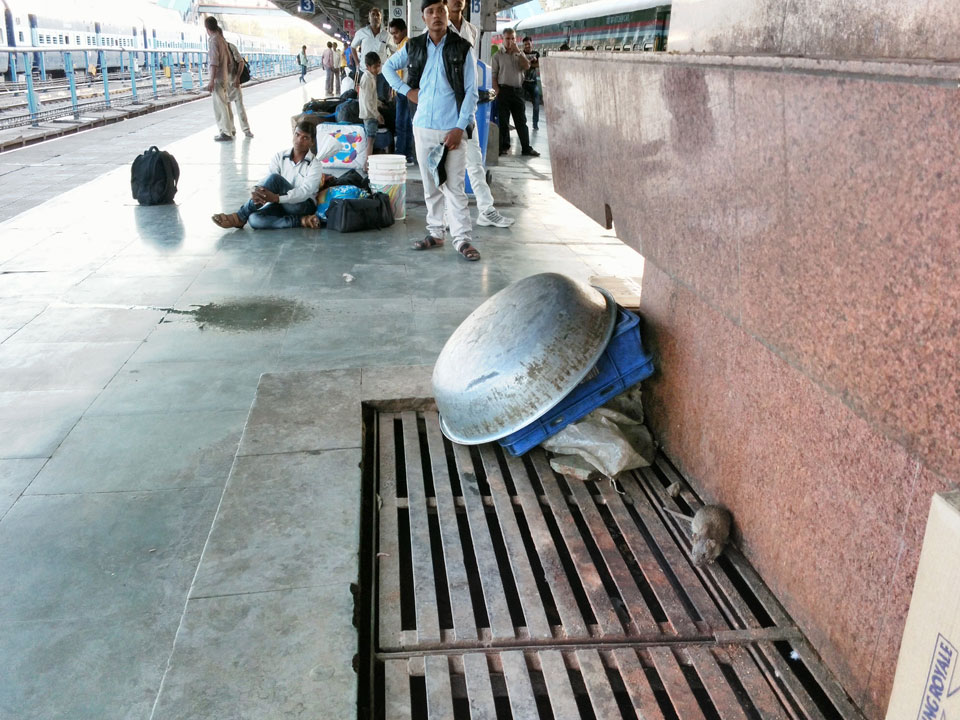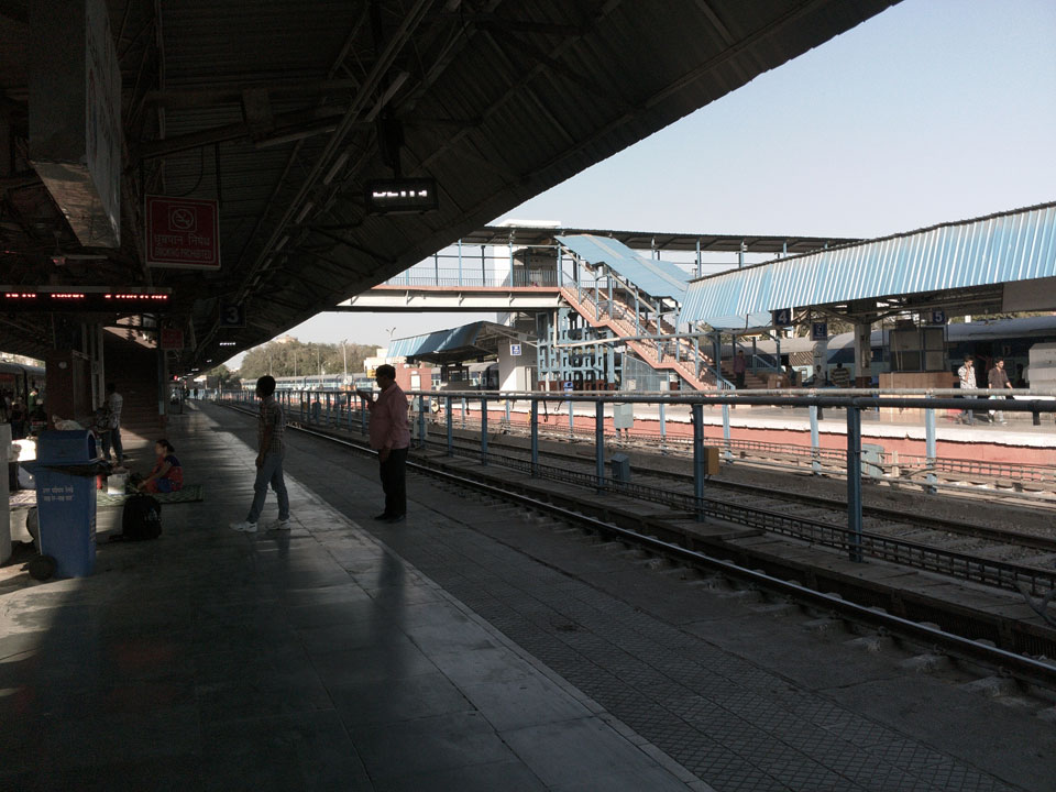 16:30 war ich wieder draußen, ging zum Gästehaus und fuhr mit dem Tuktuk zum Bahnhof. Der Preis von 150 war nicht so billig. Auf dem Bahnsteig verfolgte ich per cleatrip-App, wie sich die Verspätung des Zuges immer steigerte. Am Ende sollten es 2h sein. Ratten liefen am hellichten Tag herum, während ich etwas las und die ständigen Ketten-Verkäufer abwimmelte. Man muss sein Gepäck wohl sichern.