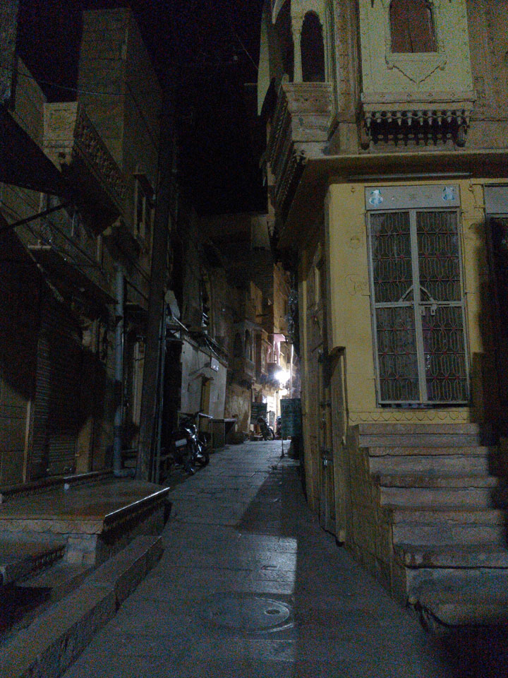 Dem Gästehaus in Jaisalmer schrieb ich wegen der veränderten Ankunftszeit. Statt 23:15 war es dann ein Uhr Nachts, als wir in Jaisalmer ankamen. Ich lief den Leuten hinterher, fand dann nur leere Straßen vor.