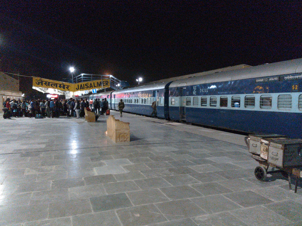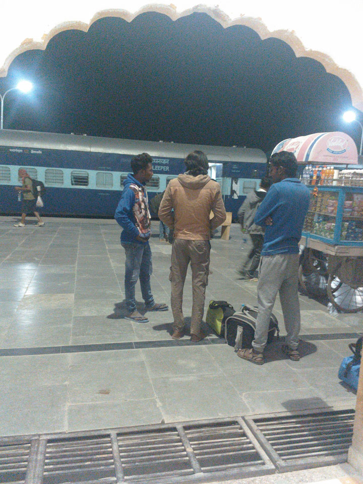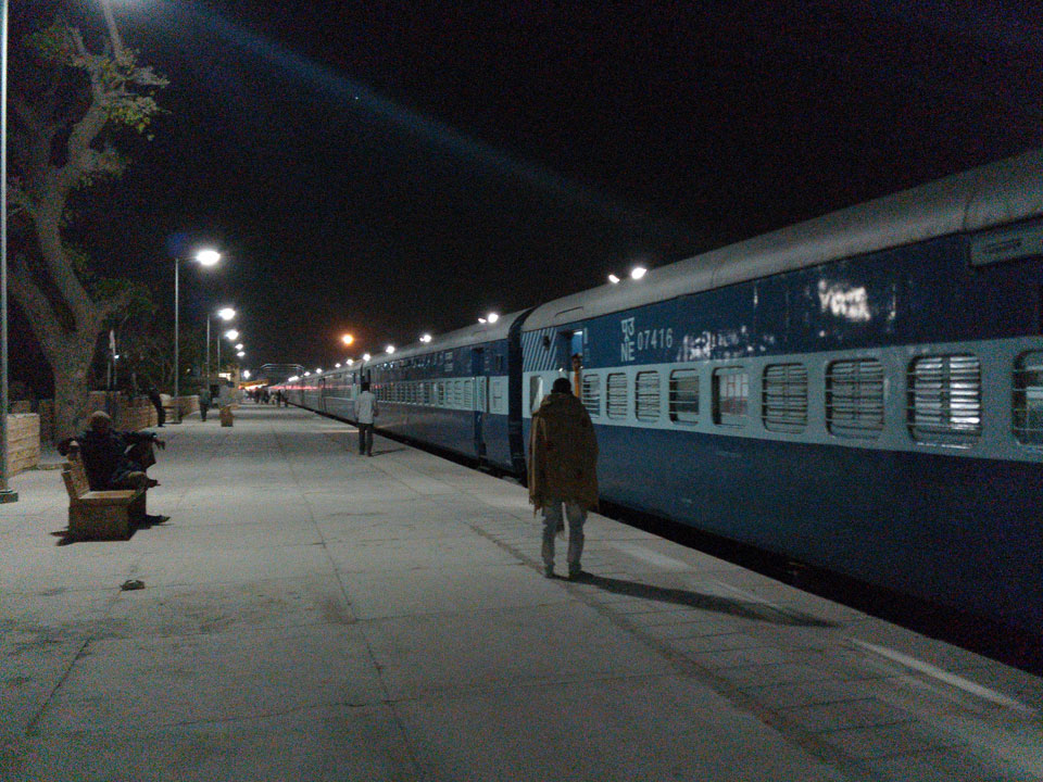 Zum Bahnhof ging’s dann zeitiger, als ich es für mich geplant hätte. Der Gästehaus-Besitzer hatte noch einen Inder, der mit dem gleichen Zug fahren wollte. Wir teilten uns das Tutuk (150 INR) um schon 23:00. Später wären die Fahrer rar (oder in der Heija). Viel zu zeitig auf dem Bahnhof holte ich mir einen Chai und hing halt rum. Ich lief schließlich den ganzen Zug ab, fand dann meinen AC-1 Wagon am anderen Ende. Die Website-Infos des PNR Systems waren down, doch ein Schaffner wies mir einen Platz zu. Luxus – breites Bett. Ein deutsches Paar aus München auch im Abteil, etwas Erfahrungsaustauch.