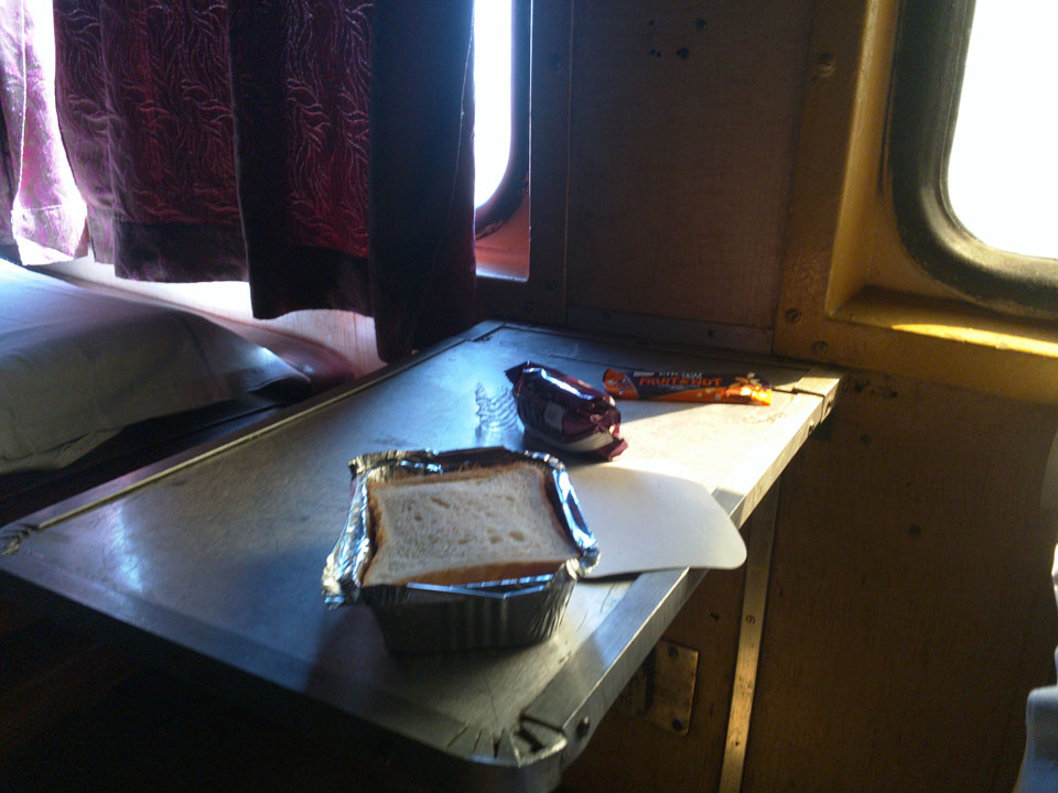 Irgendwann früh kam ein Verkäufer in mein Abteil und verkaufte ein Frühstück. Ich war danach wieder alleine, die Deutschen hatten schon 5:30 ausgecheckt, ohne dass ich das bemerkte. Ich schlief weiter, hatte meinen Handywecker auf kurz vor 12 gestellt.