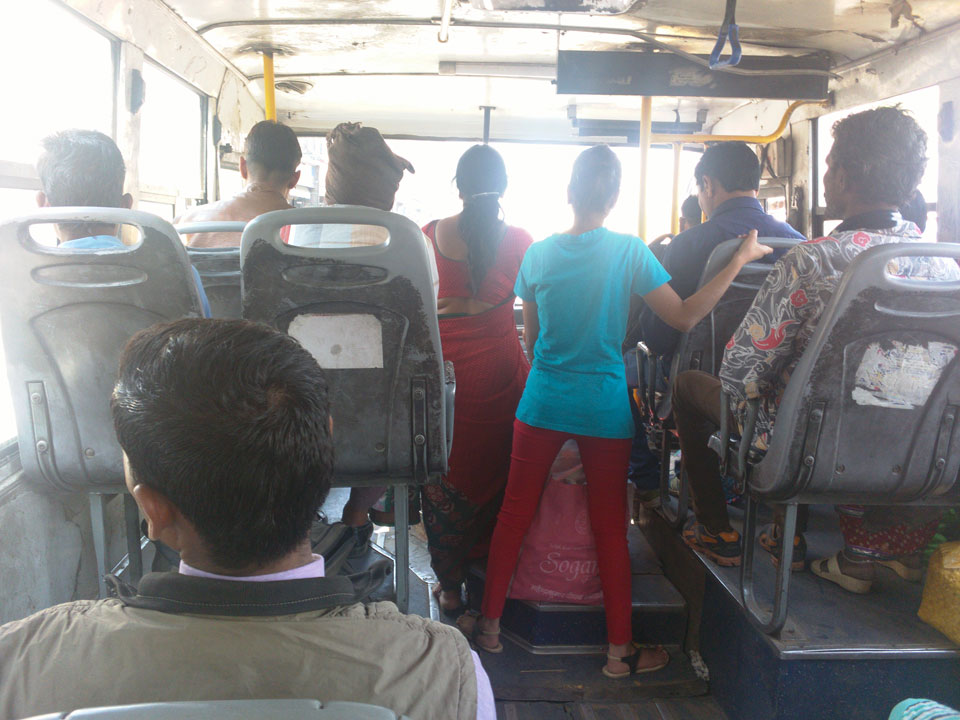 So hatte ich einen Chai und wartete. Die Busse waren nur allesamt in Hindi beschriftet. Dann jedoch, nach ca. einer halben Stunde rief der Tee-Mann „Bus!“ und neben mir sprangen noch 2-3 andere Leute auf. Der Bus hielt nicht richtig an, ich schafft es aber auch mit meinen Sachen in den Eingang.