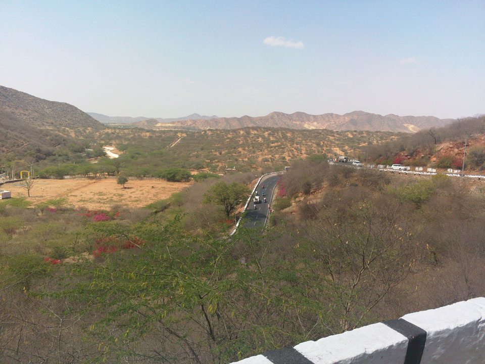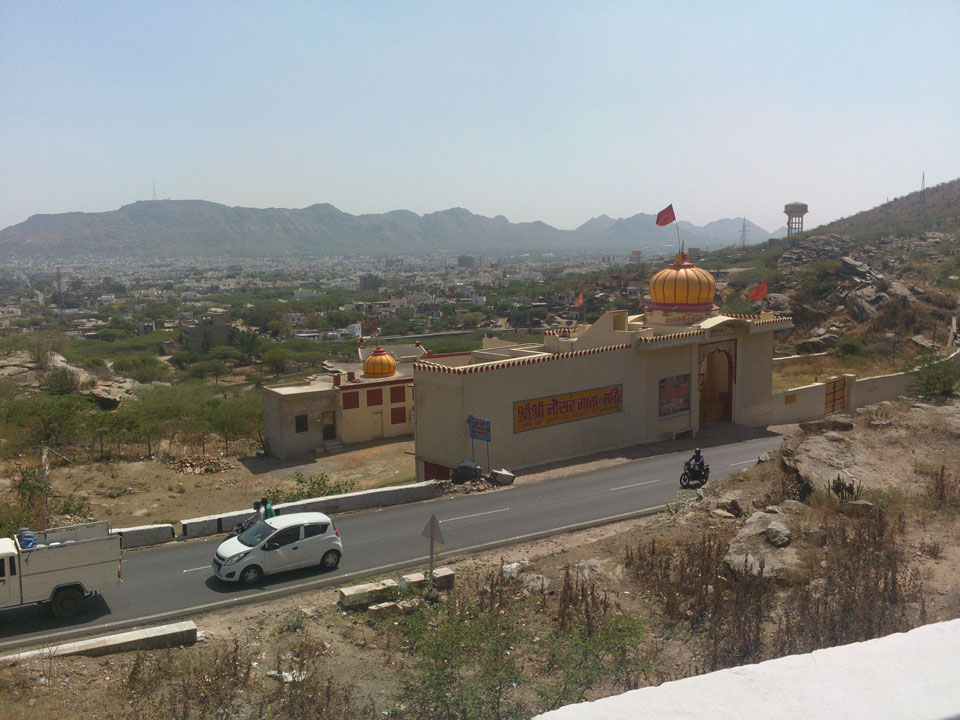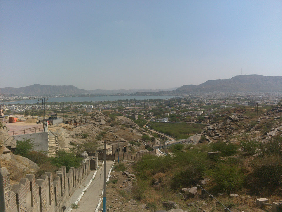 Da saß ich nun, die erste Station war der Busbahnhof. Ich solte mich umsetzen, denn der Bus wurde voll. Mein sperriges Gepäck steht halt sonst gern im Weg. Das Ticket kam wohl 15 INR, die Fahrt ging zuerst auf ’nen Hügel mit einer schönen Aussicht über Ajmer.