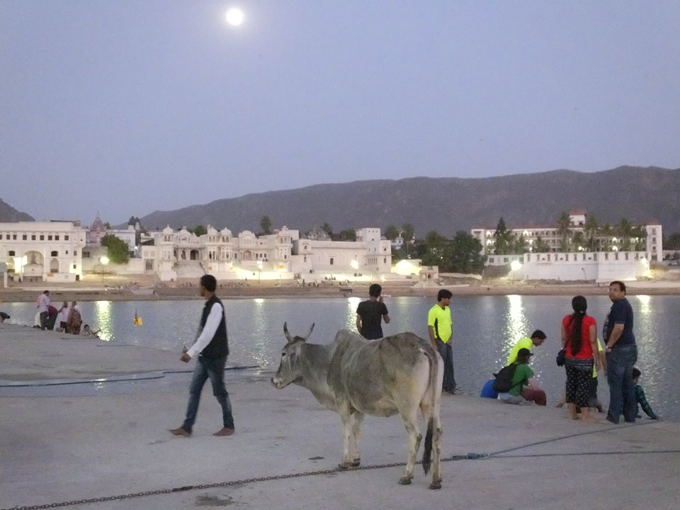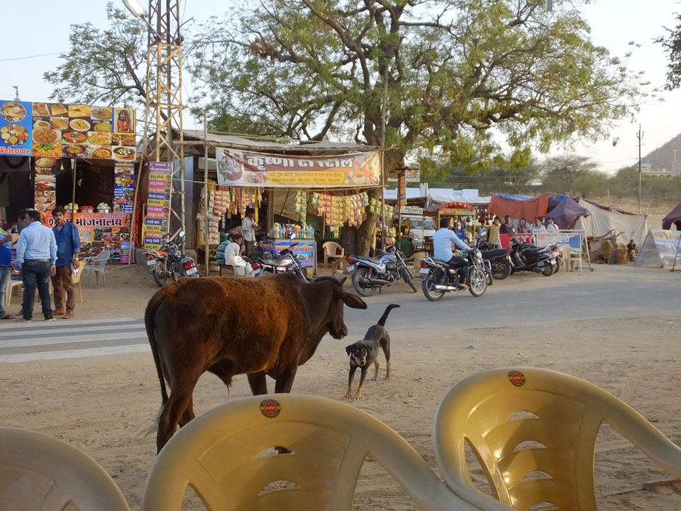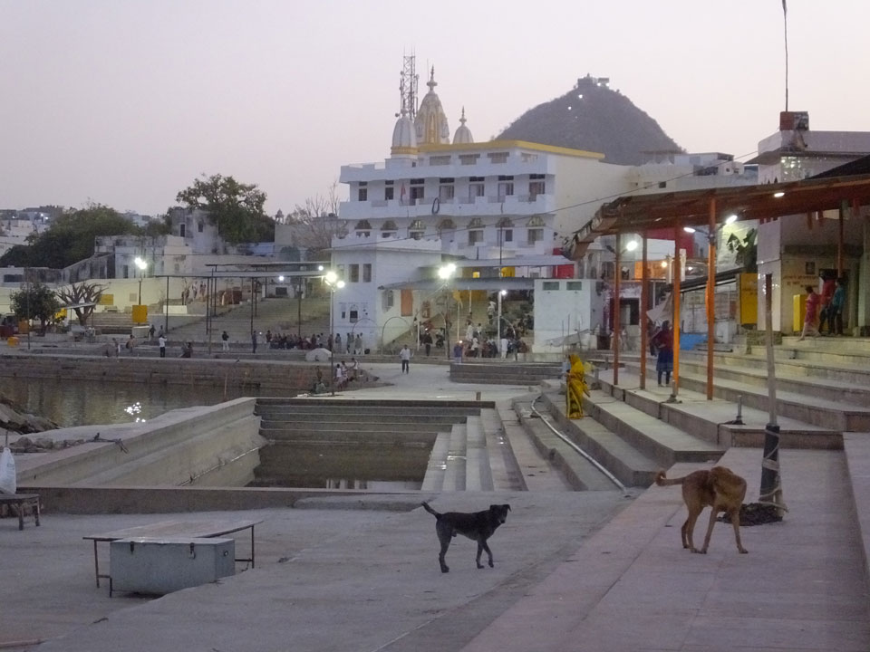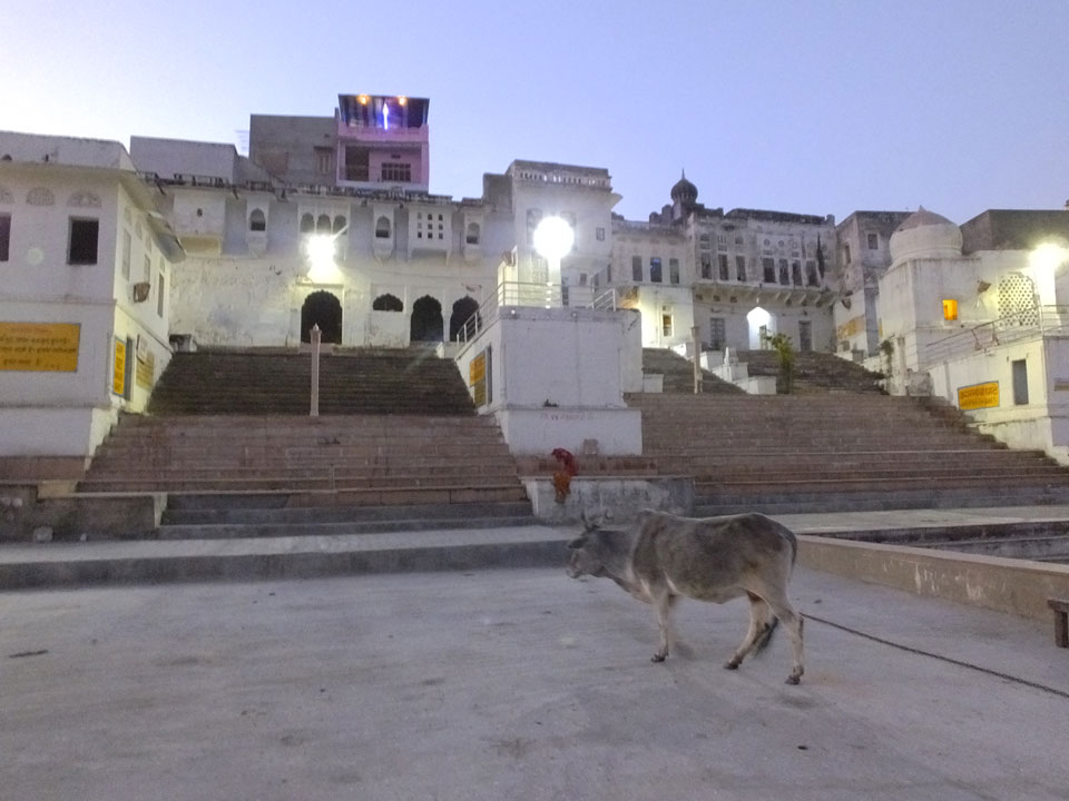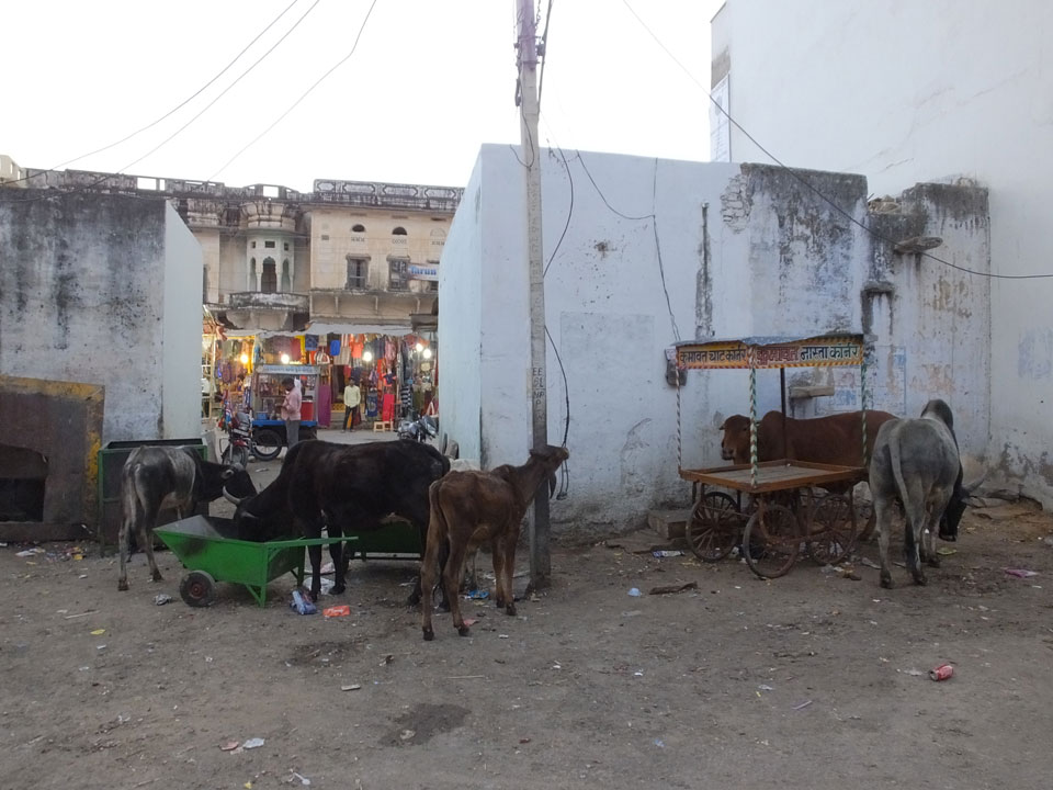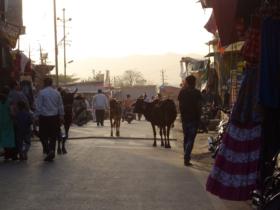 OK, spät mal eine Runde durch Pushkar. Eine heilige Stadt für Hindus mit einem Brahma Tempel. Hier sind die meisten Kühe, die ich bisher frei herumlaufen sah. Kamel-Touren gibt’s auch um die Ecke.