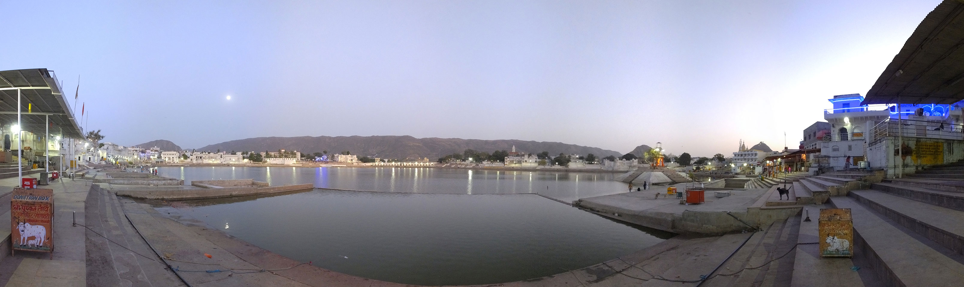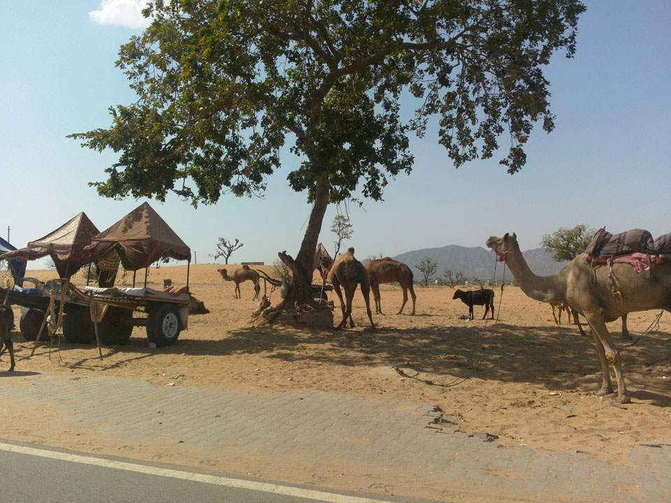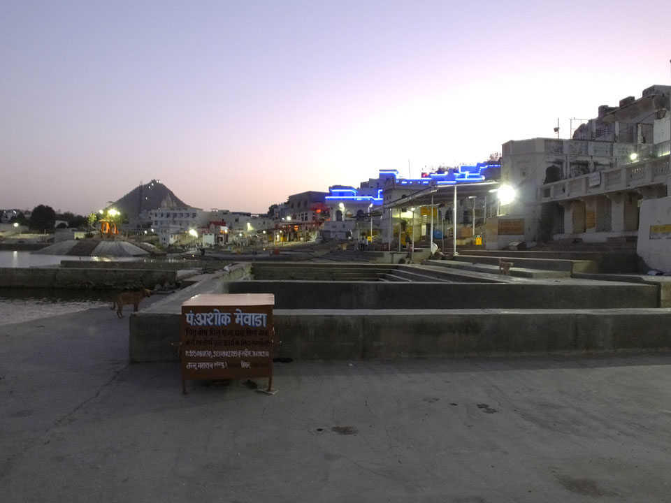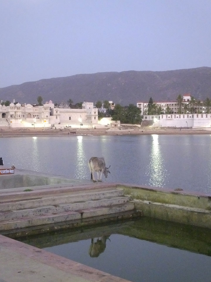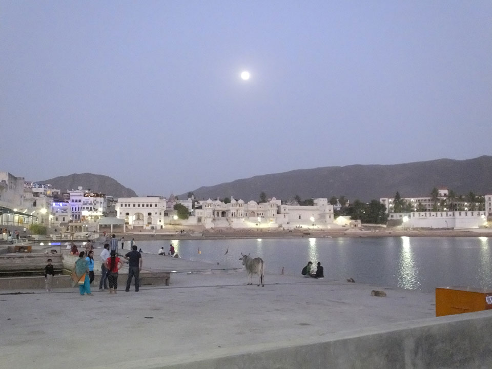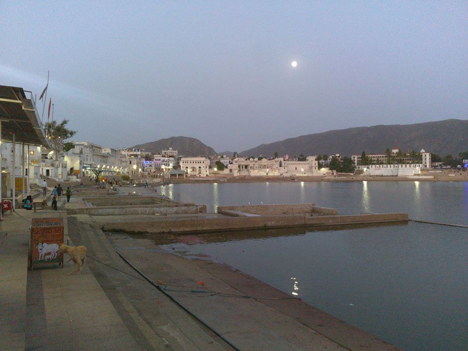 OK, spät mal eine Runde durch Pushkar. Eine heilige Stadt für Hindus mit einem Brahma Tempel. Hier sind die meisten Kühe, die ich bisher frei herumlaufen sah. Kamel-Touren gibt’s auch um die Ecke.