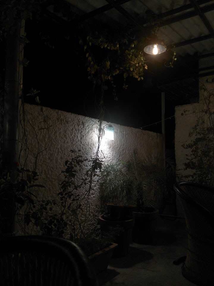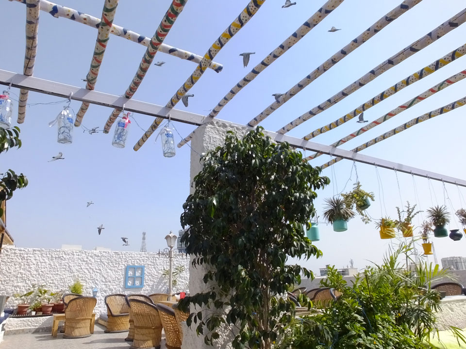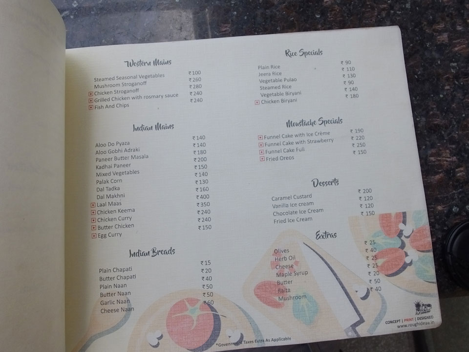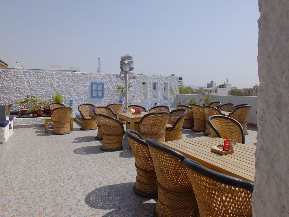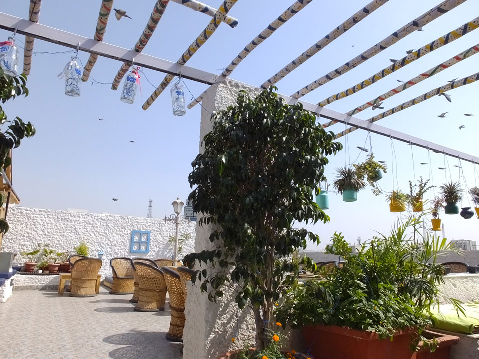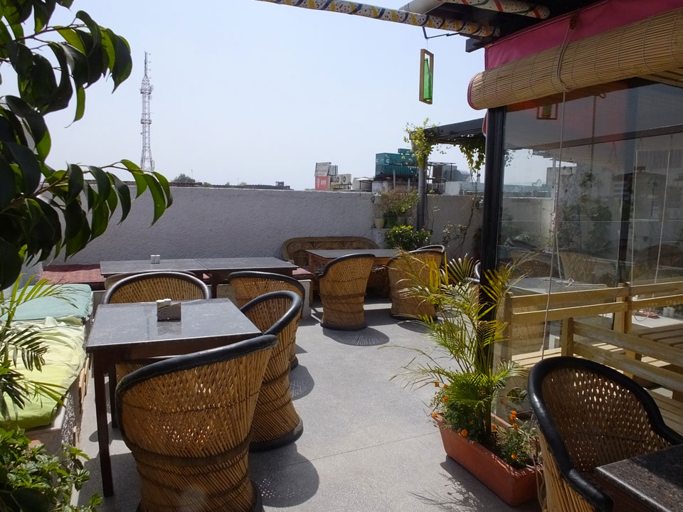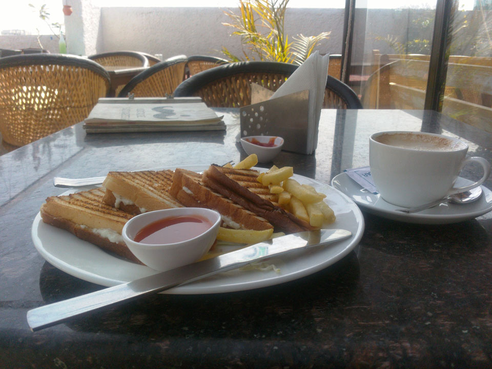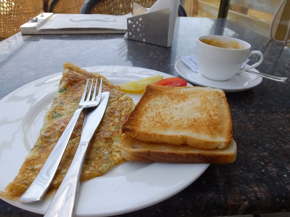 Das Frühstück auf im Dach-Restaurant war OK – zuerst Omelette mit Café, danach ein Sandwich mit Cappuccino. Ich las im Buch, verlängerte um eine Nacht – INR 449 sind OK.