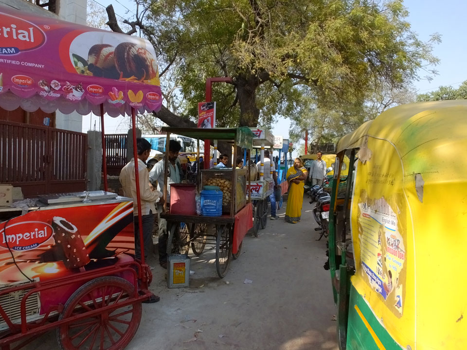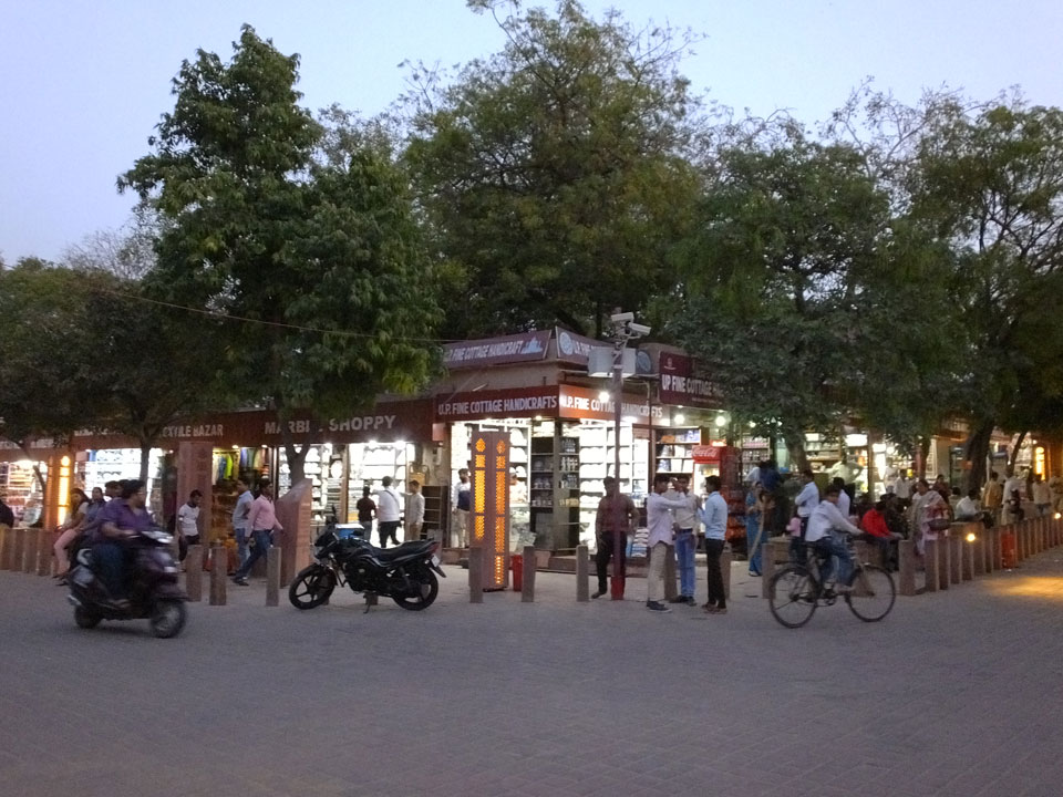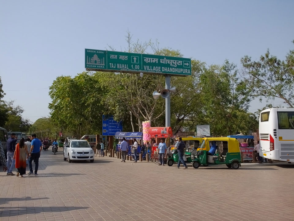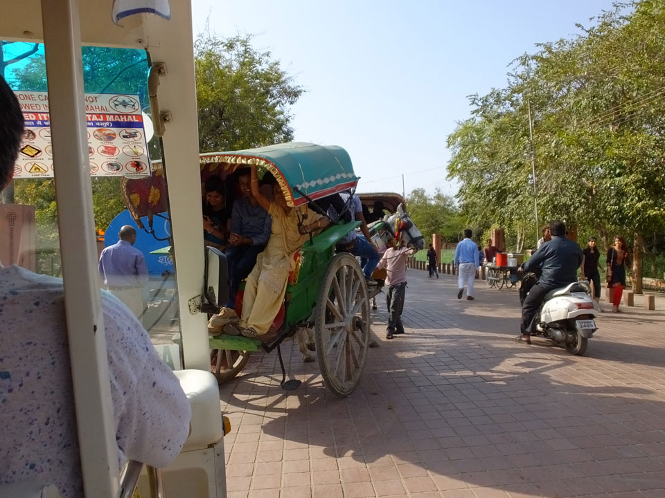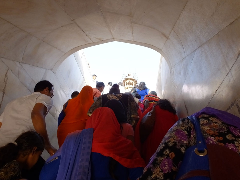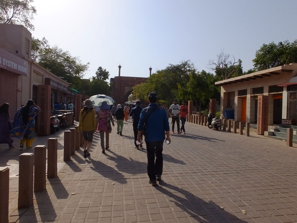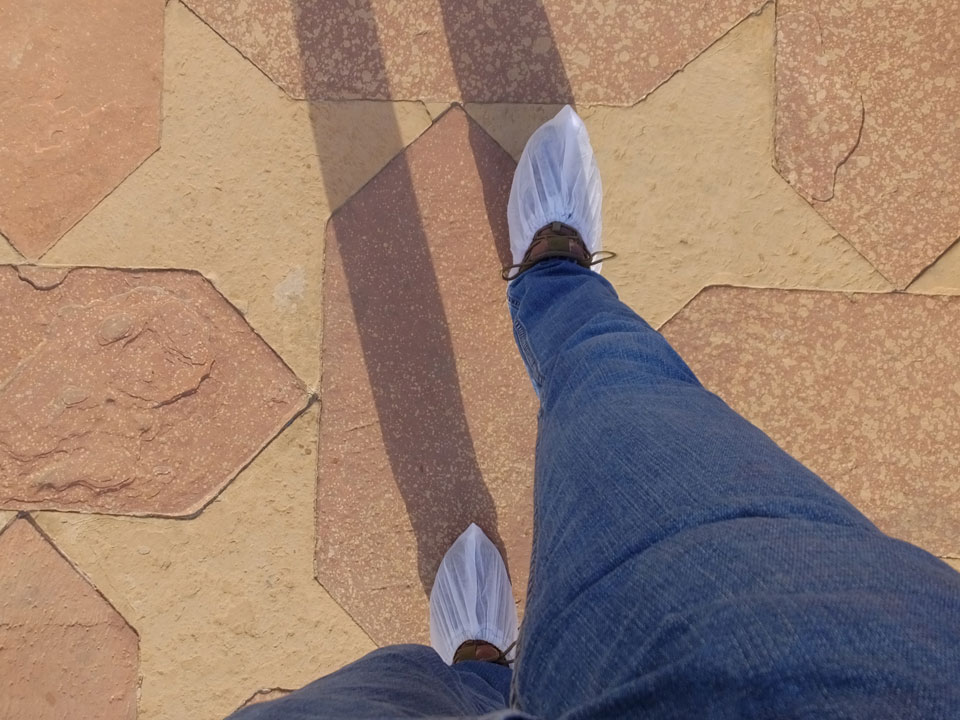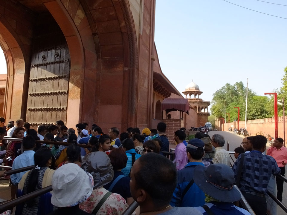 Das Bedweiser Hostel liegt gut. Gleich um die Ecke, ca. 2 min entfernt war der Ticketschalter für das Ost-Tor. Ein Reiseführer auf Jobsuche half mir. Es gab für die gepfefferten 1000 INR (€14,50) wenigstens noch eine Wasserflasche und Schuh-Überzieher. Die Inder zahlen 40 INR. Ein kostenloses Shuttle zum East Gate fuhr dann auch weg (ein weiterer Wert von 10 INR).