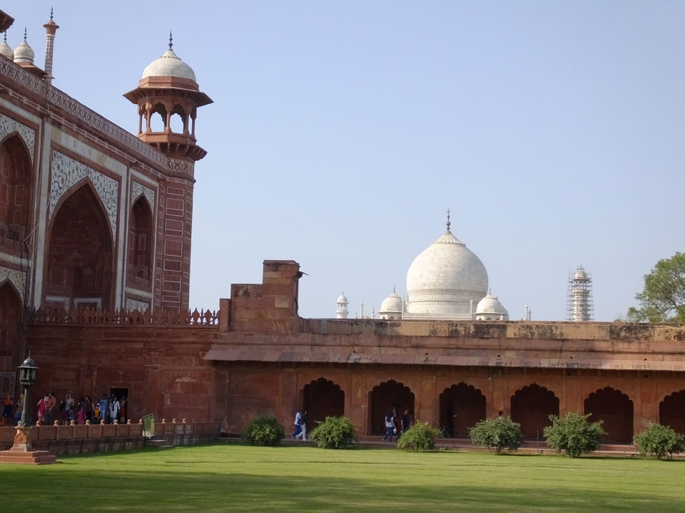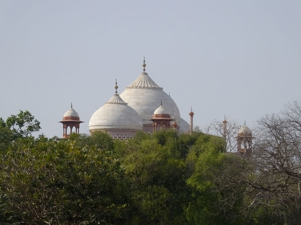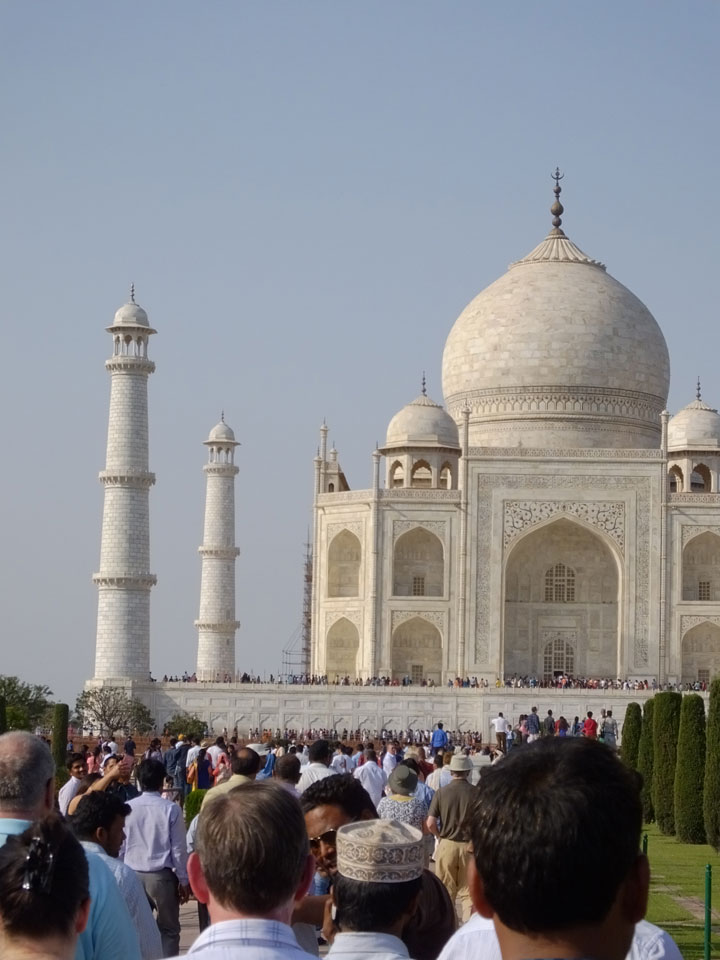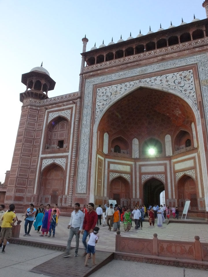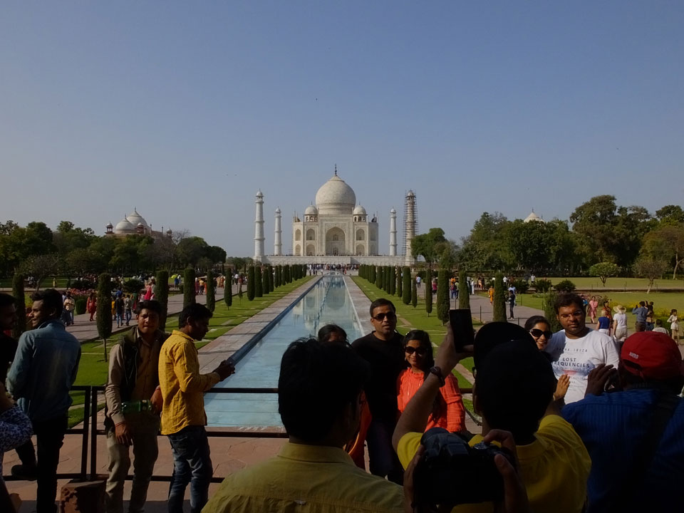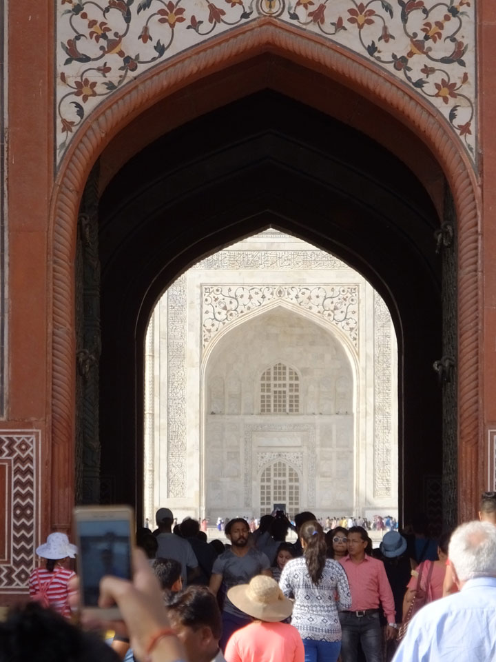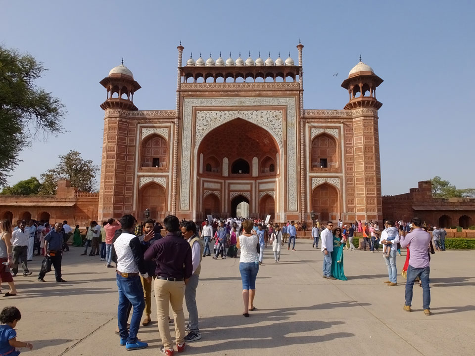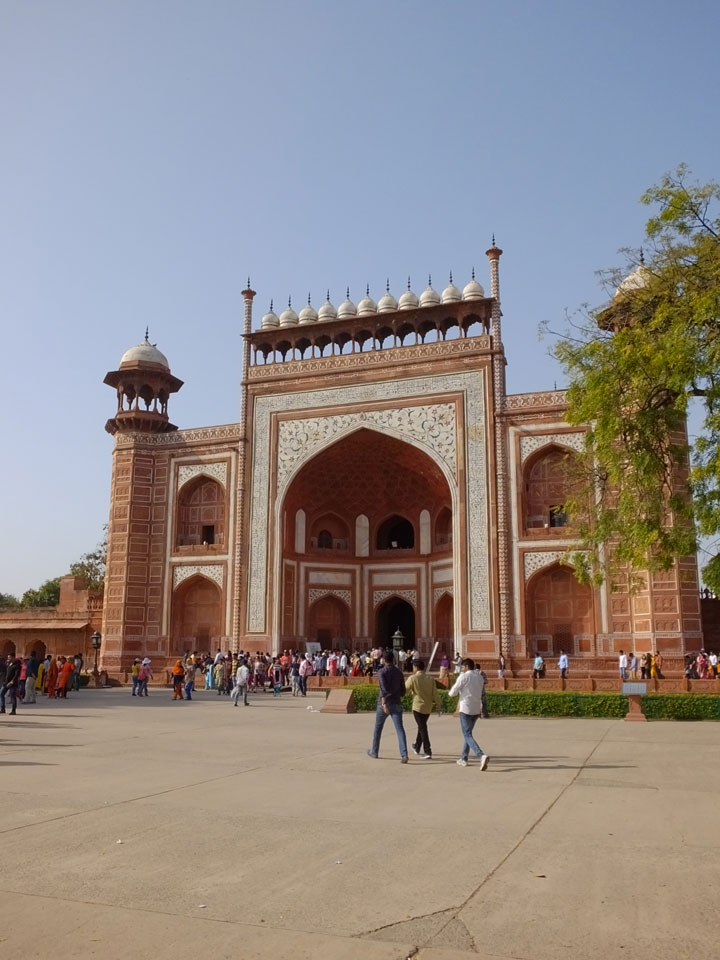 Rein ging’s recht fix, drinnen waren dann viele Leute. Dann sah ich schon hinter der Mauer die Kuppel eines der berühmtesten Bauwerke überhaupt – das Taj Mahal!