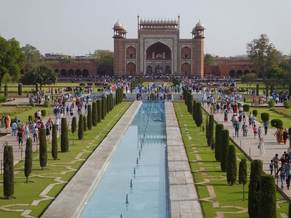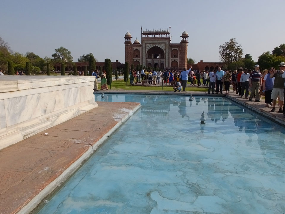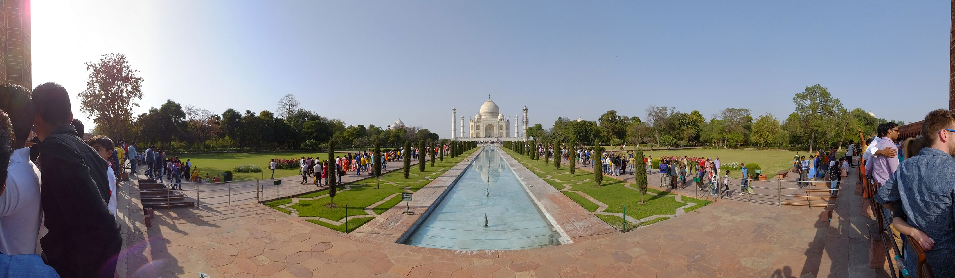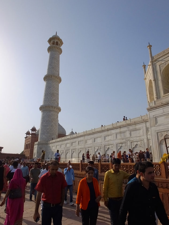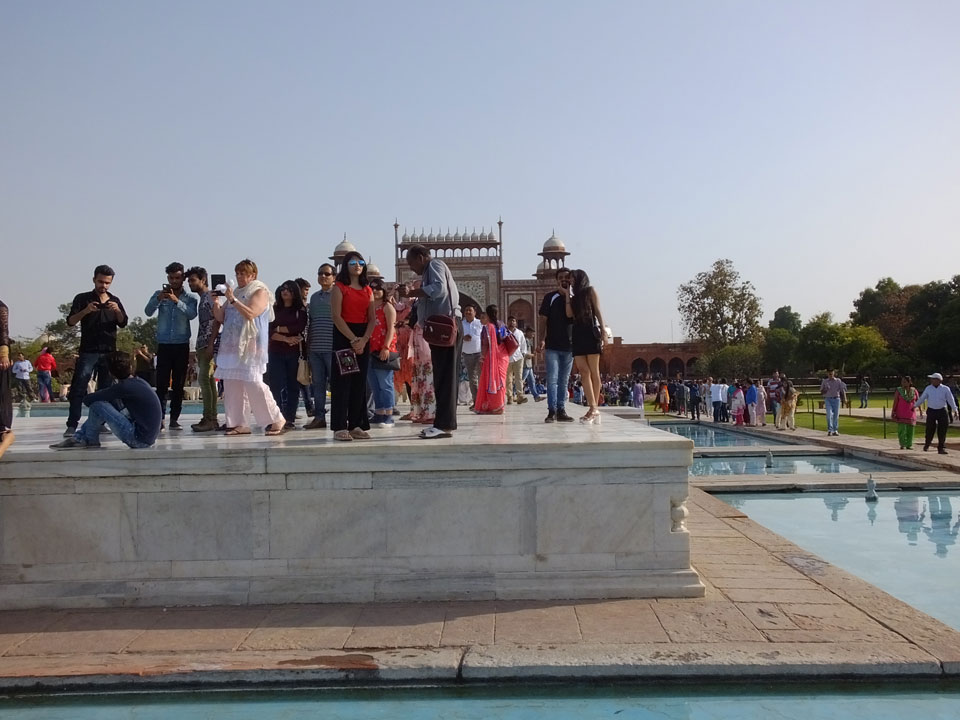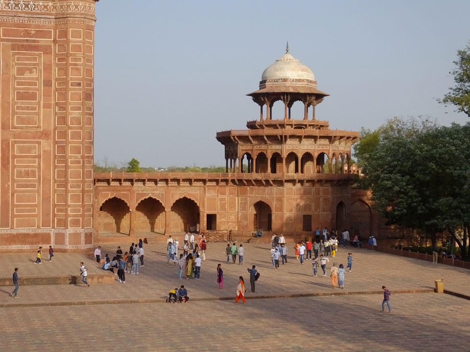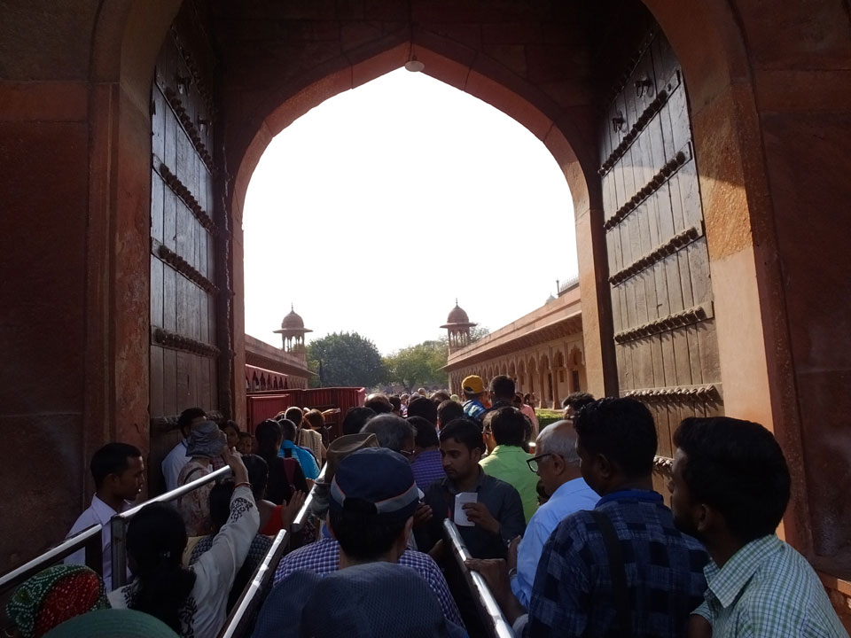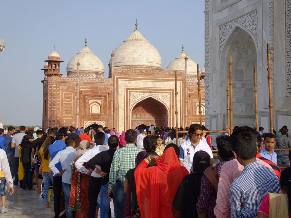 Rein ging’s recht fix, drinnen waren dann viele Leute. Dann sah ich schon hinter der Mauer die Kuppel eines der berühmtesten Bauwerke überhaupt – das Taj Mahal!
