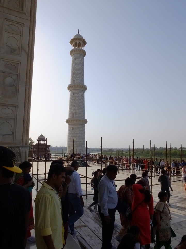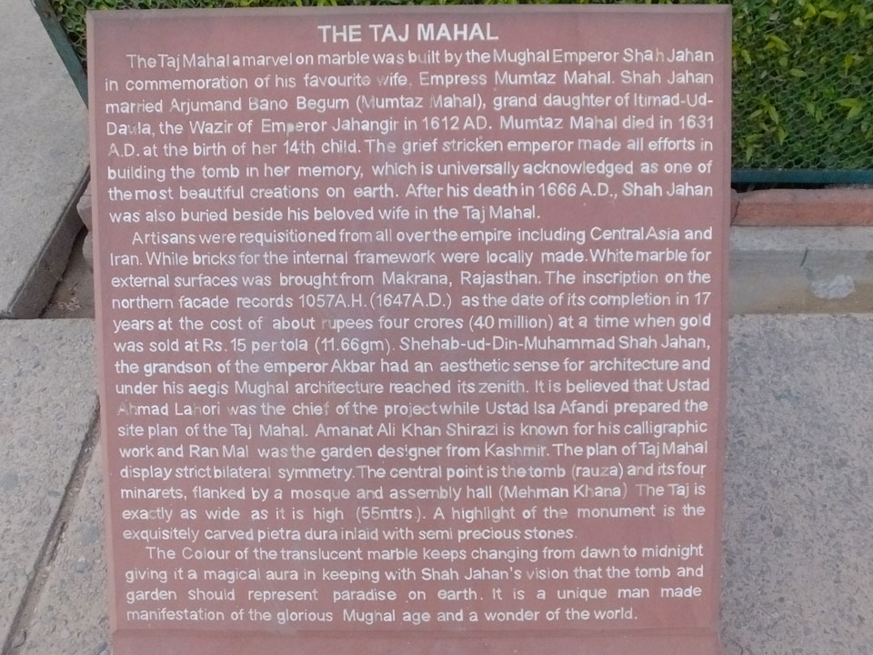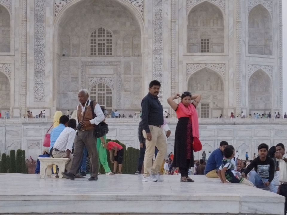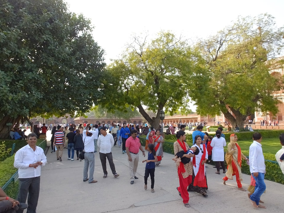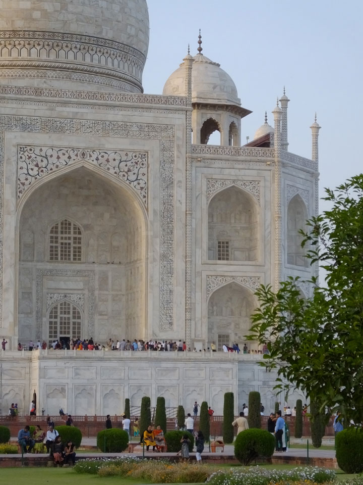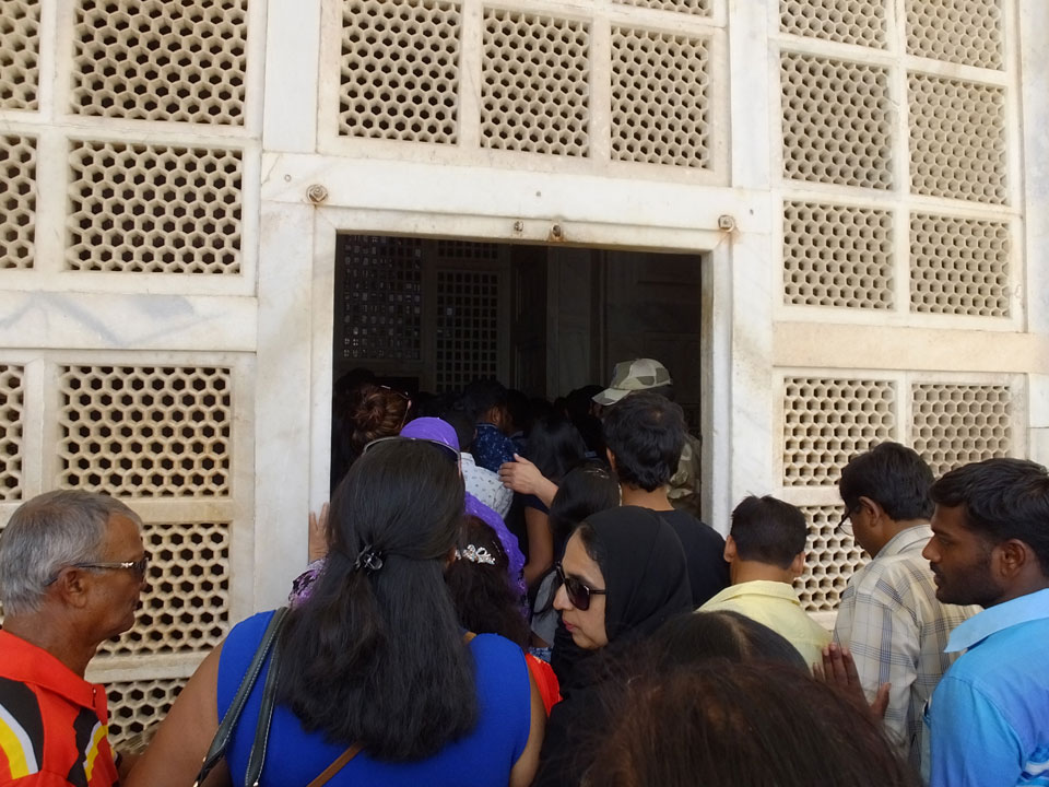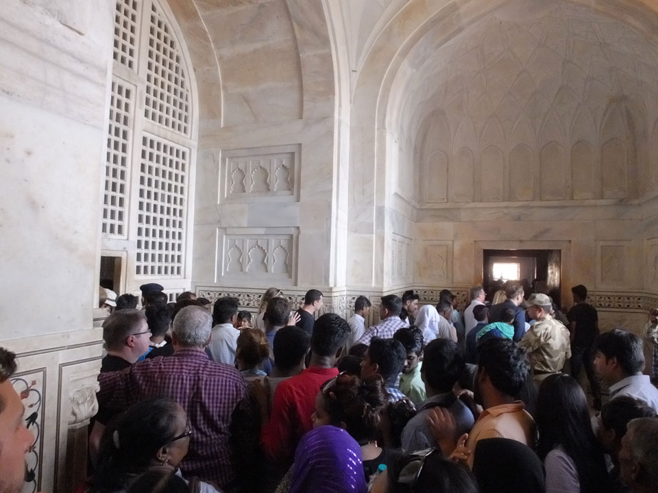 Das Wetter war schön, warm und alles OK. Es gab eine lange Schlange, um in das Mausoleum zu kommen. Mit den Schuh-Überziehern war dort der Mamor auch blank geputzt. Drinnen im Taj dann, wo die Sarkophage stehen knipsten viele Inder. Es gab Chaos, womit die Ordenr zu Trillerpfeifen greifen mussten. Selbst ich knipste, da ich erst spät sah, das Photos nicht erlaubt seien. Erst mal hier im Blog keine Bilder, besonders interessant sieht es drinnen ohnehin nicht aus. Im Zentrum steht der Sarkophag der Königin. Die perfekte Symmetrie wird durch den Sarkophag des Königs daneben gebrochen. Das hatte wohl der Sohn veranlasst, las ich mal.