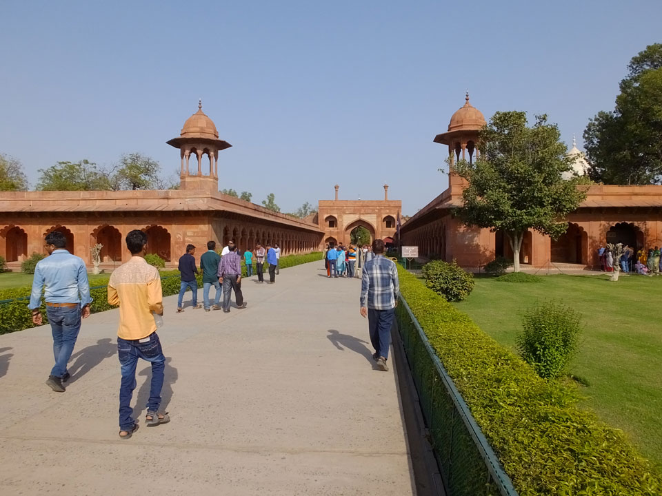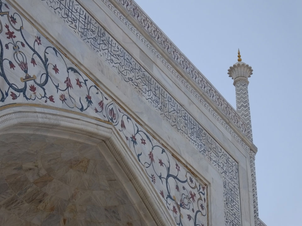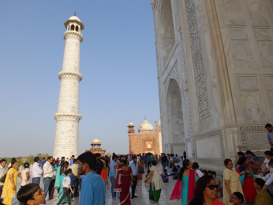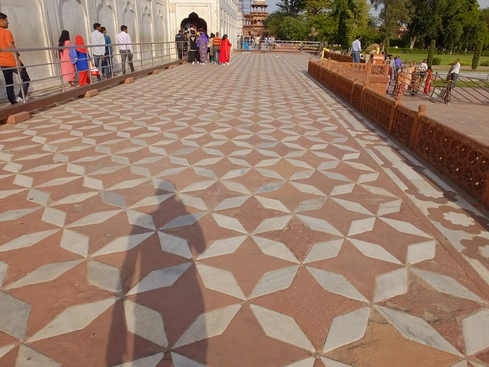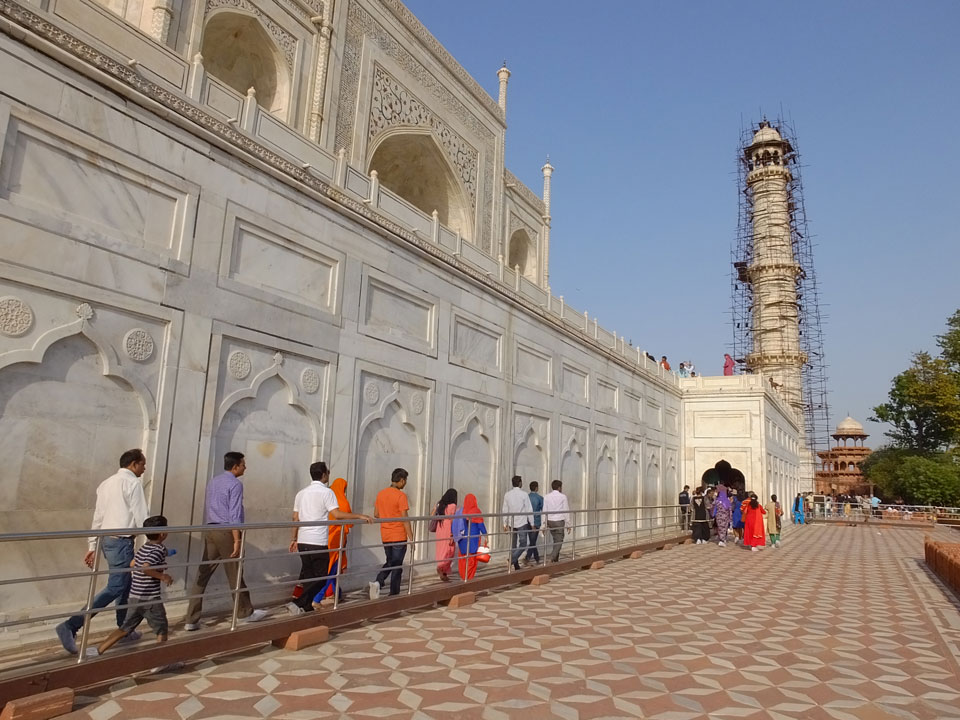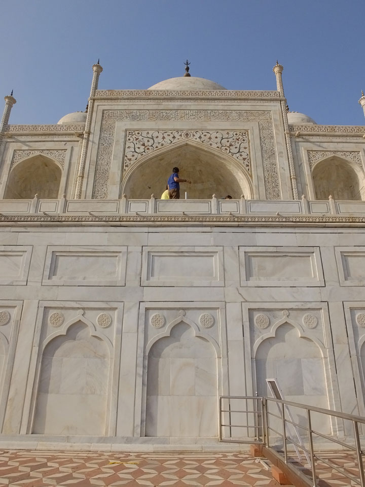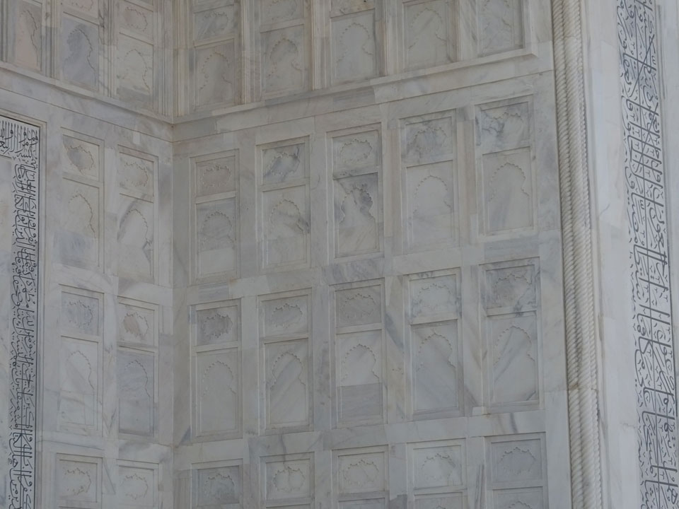 Das Wetter war schön, warm und alles OK. Es gab eine lange Schlange, um in das Mausoleum zu kommen. Mit den Schuh-Überziehern war dort der Mamor auch blank geputzt. Drinnen im Taj dann, wo die Sarkophage stehen knipsten viele Inder. Es gab Chaos, womit die Ordenr zu Trillerpfeifen greifen mussten. Selbst ich knipste, da ich erst spät sah, das Photos nicht erlaubt seien. Erst mal hier im Blog keine Bilder, besonders interessant sieht es drinnen ohnehin nicht aus. Im Zentrum steht der Sarkophag der Königin. Die perfekte Symmetrie wird durch den Sarkophag des Königs daneben gebrochen. Das hatte wohl der Sohn veranlasst, las ich mal.