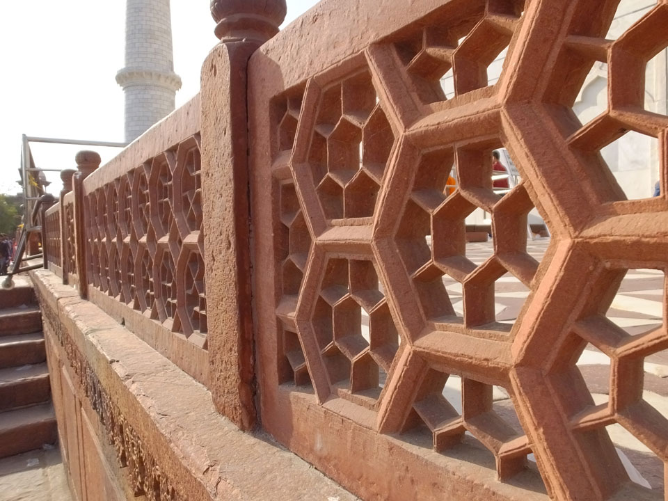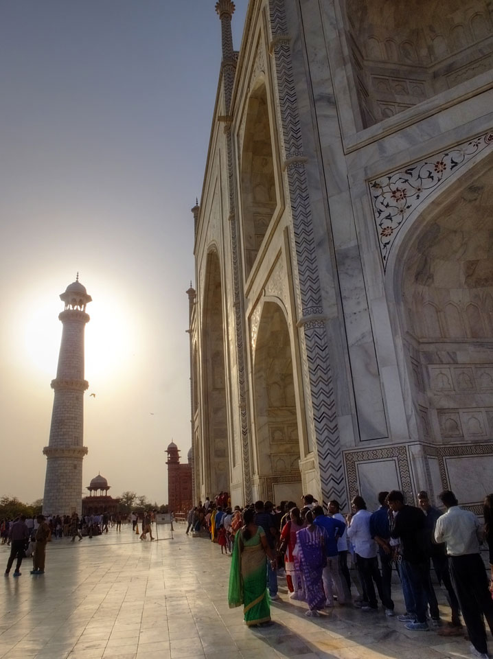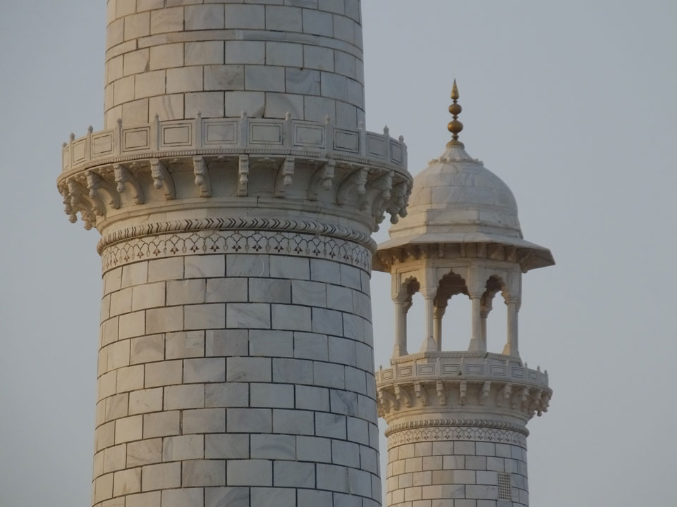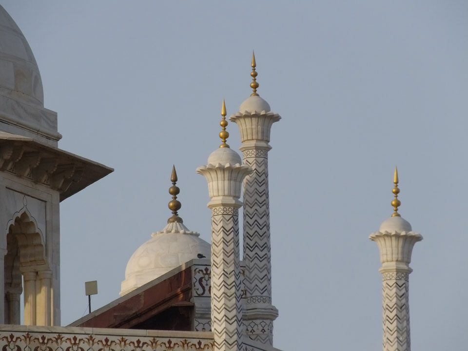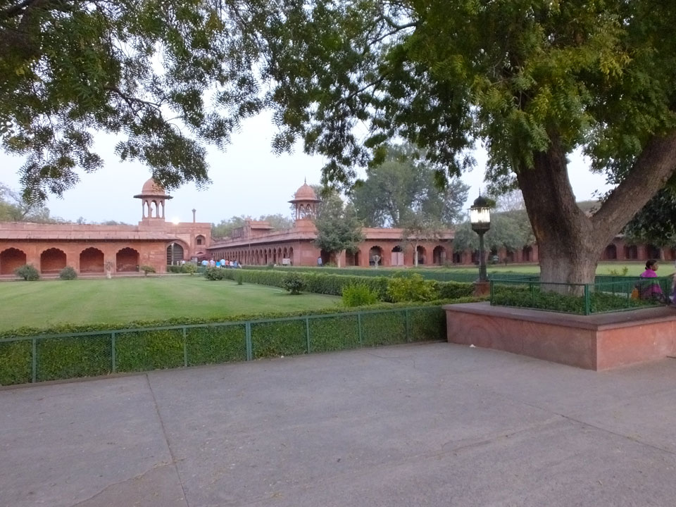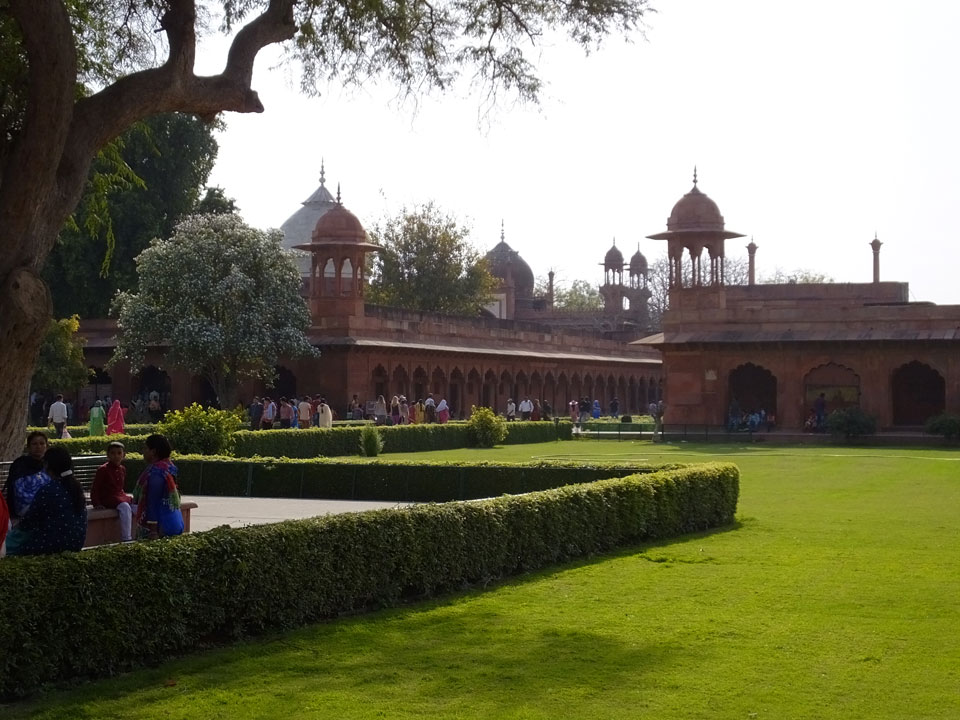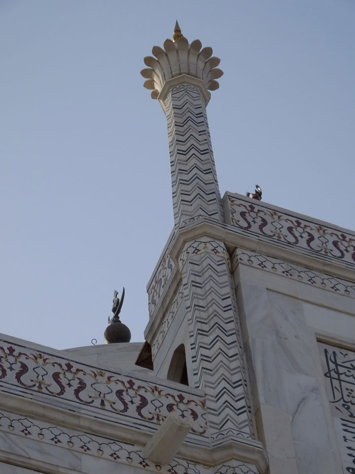 Das Wetter war schön, warm und alles OK. Es gab eine lange Schlange, um in das Mausoleum zu kommen. Mit den Schuh-Überziehern war dort der Mamor auch blank geputzt. Drinnen im Taj dann, wo die Sarkophage stehen knipsten viele Inder. Es gab Chaos, womit die Ordenr zu Trillerpfeifen greifen mussten. Selbst ich knipste, da ich erst spät sah, das Photos nicht erlaubt seien. Erst mal hier im Blog keine Bilder, besonders interessant sieht es drinnen ohnehin nicht aus. Im Zentrum steht der Sarkophag der Königin. Die perfekte Symmetrie wird durch den Sarkophag des Königs daneben gebrochen. Das hatte wohl der Sohn veranlasst, las ich mal.