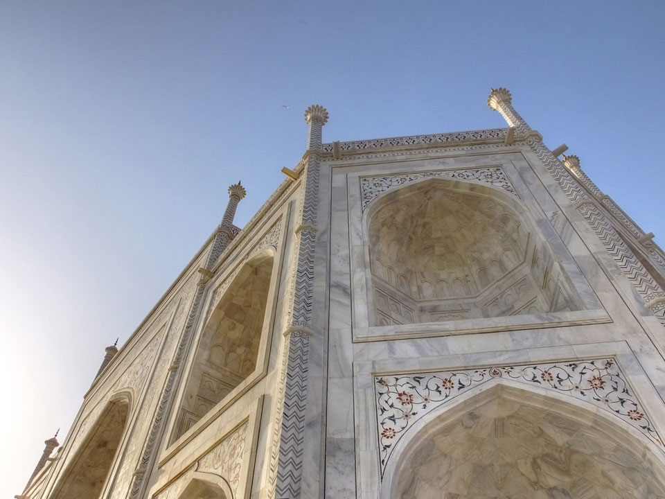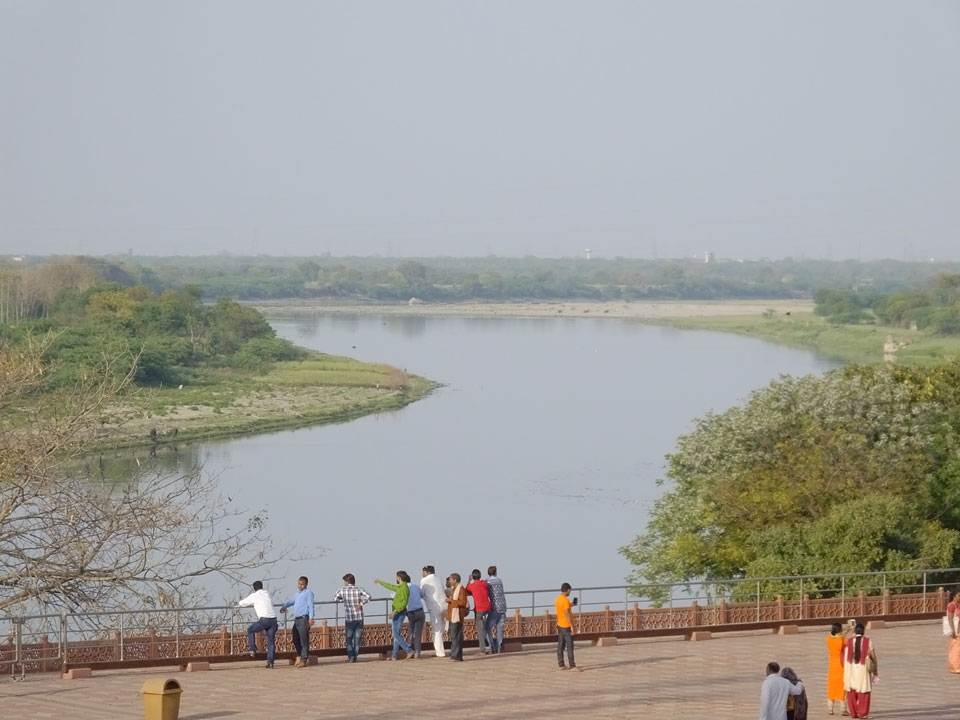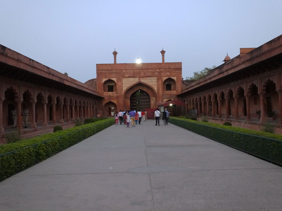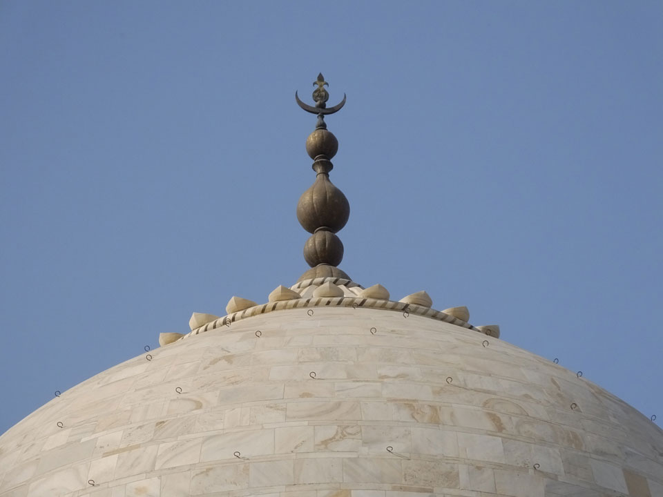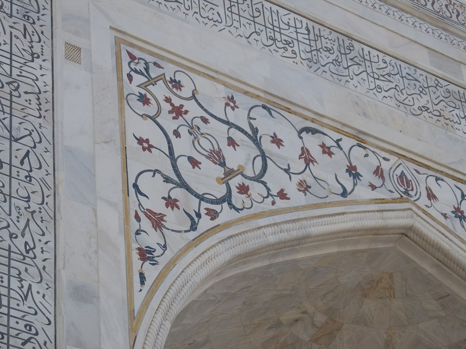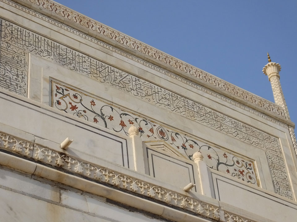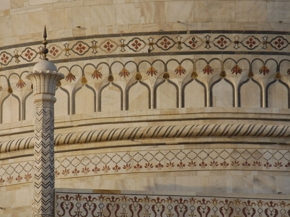 Das Wetter war schön, warm und alles OK. Es gab eine lange Schlange, um in das Mausoleum zu kommen. Mit den Schuh-Überziehern war dort der Mamor auch blank geputzt. Drinnen im Taj dann, wo die Sarkophage stehen knipsten viele Inder. Es gab Chaos, womit die Ordenr zu Trillerpfeifen greifen mussten. Selbst ich knipste, da ich erst spät sah, das Photos nicht erlaubt seien. Erst mal hier im Blog keine Bilder, besonders interessant sieht es drinnen ohnehin nicht aus. Im Zentrum steht der Sarkophag der Königin. Die perfekte Symmetrie wird durch den Sarkophag des Königs daneben gebrochen. Das hatte wohl der Sohn veranlasst, las ich mal.