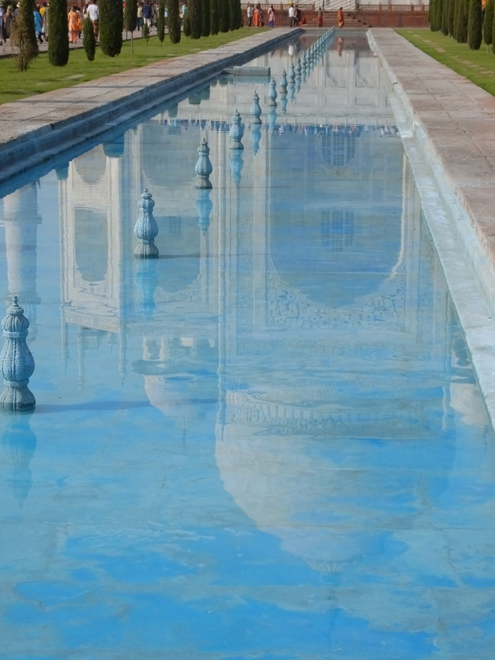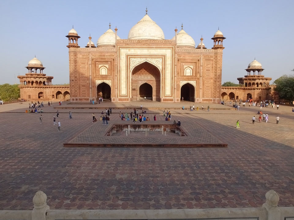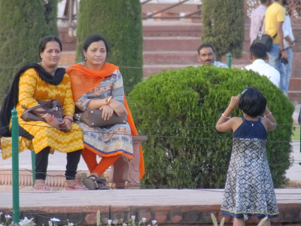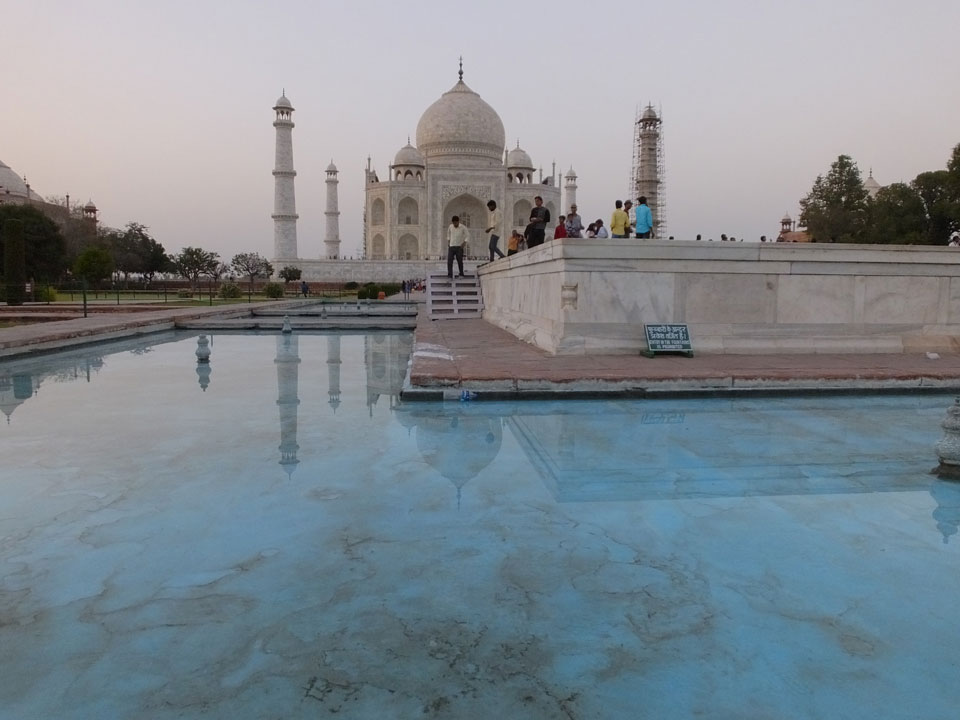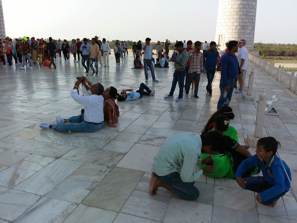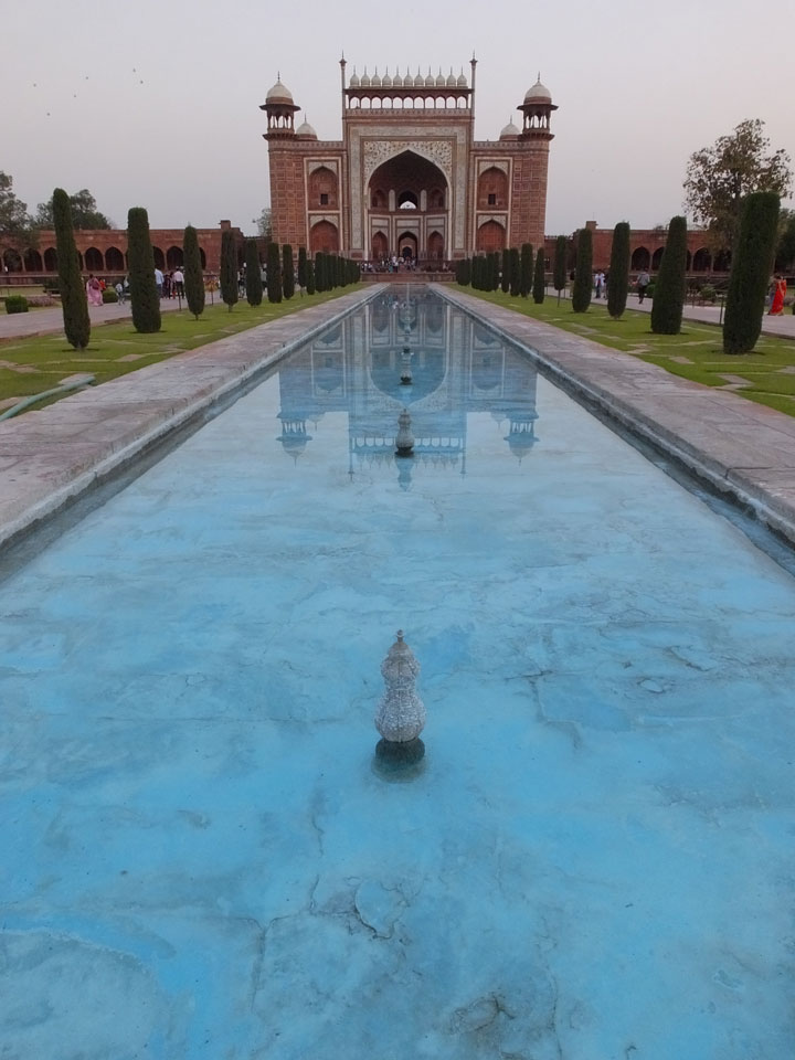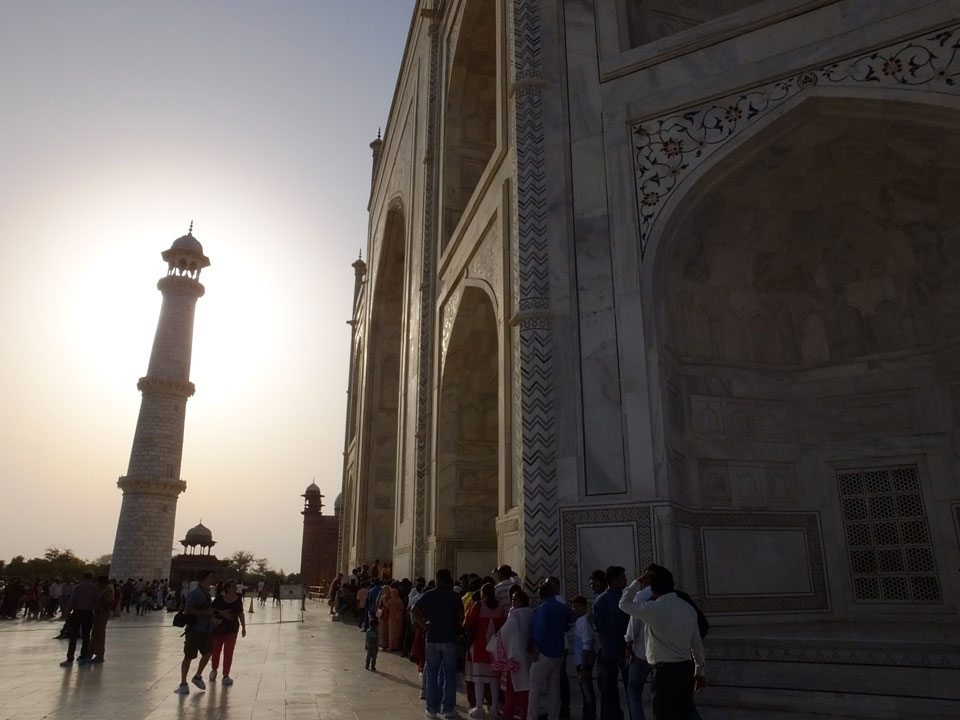 Draußen entspannte ich, hatte meine Überzieher schon abgegeben und ließ die Moscheen zu beiden Seiten damit gezwungenermaßen unbesucht. So saß ich etwas auf einer Parkbank, las im Buch. Immer wieder schaute ich vom Lesen auf, womit für mich ein interessanter Effekt entstand: aus der Buch-Welt von 1Q84 dann auf das Taj Mahal zu sehen, brachte etwas, wie wiederkehrende erste Eindrücke.