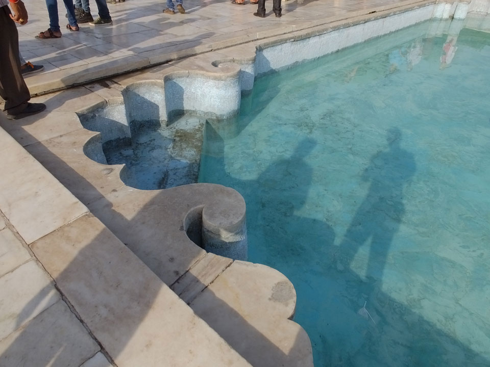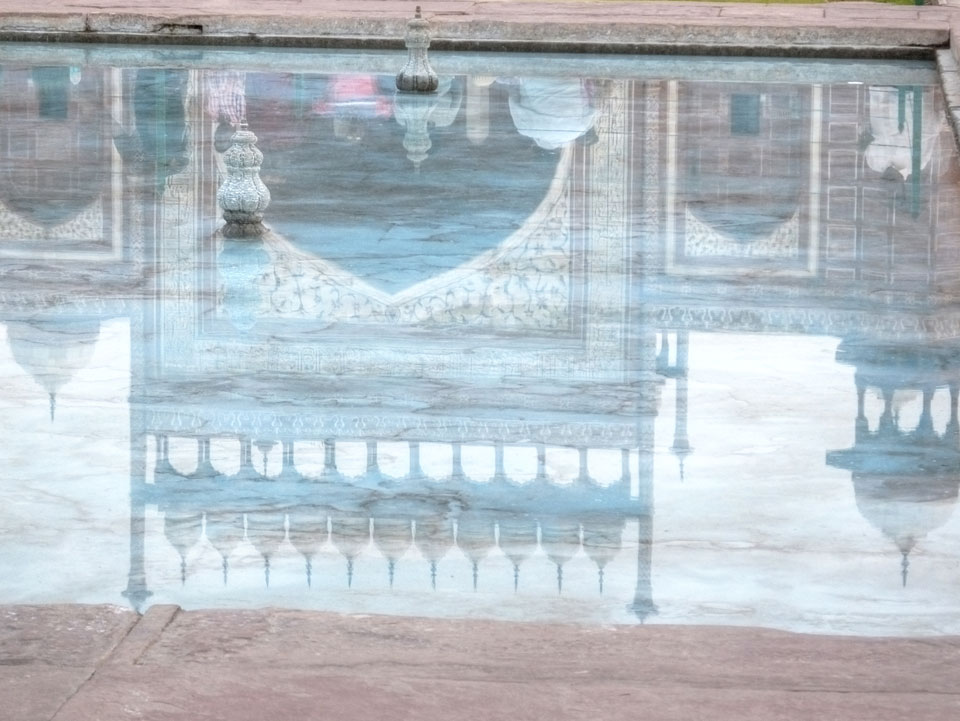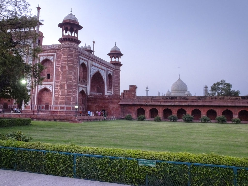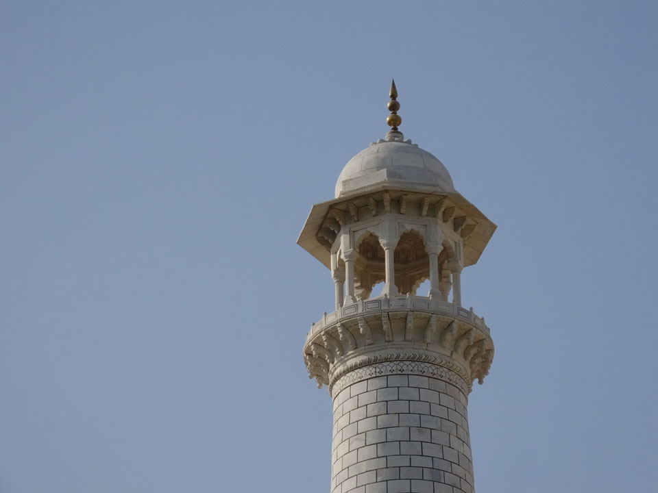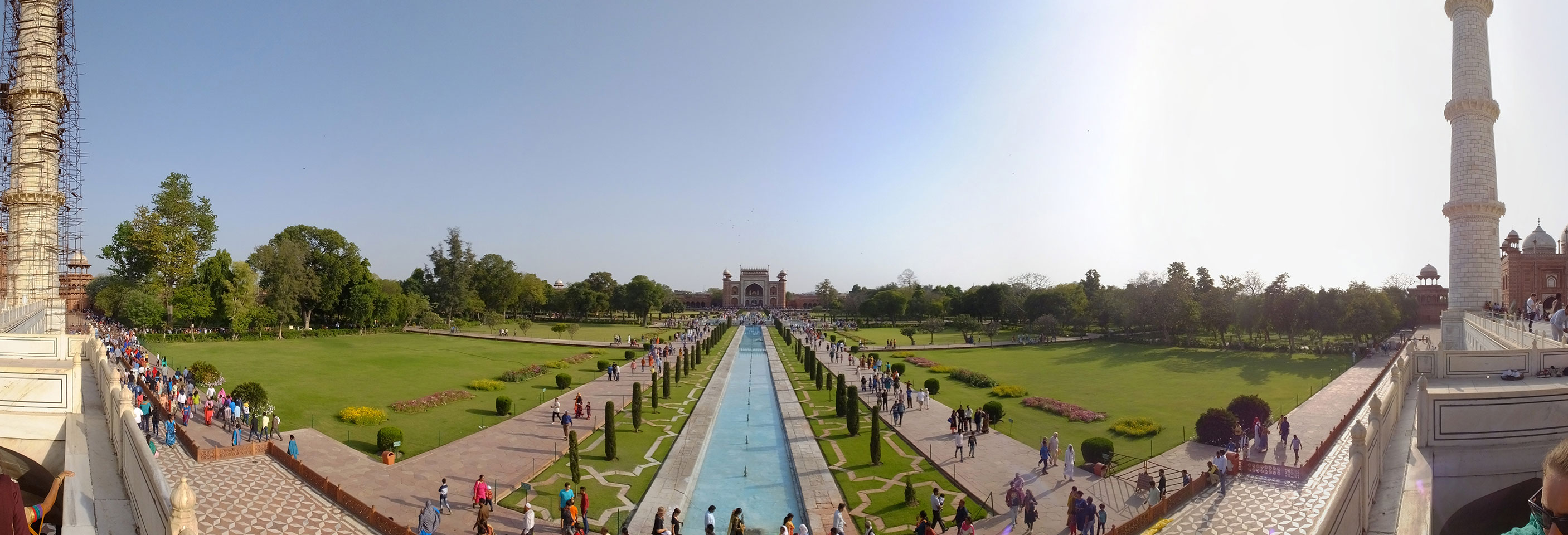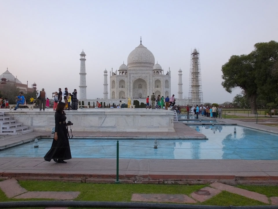 Draußen entspannte ich, hatte meine Überzieher schon abgegeben und ließ die Moscheen zu beiden Seiten damit gezwungenermaßen unbesucht. So saß ich etwas auf einer Parkbank, las im Buch. Immer wieder schaute ich vom Lesen auf, womit für mich ein interessanter Effekt entstand: aus der Buch-Welt von 1Q84 dann auf das Taj Mahal zu sehen, brachte etwas, wie wiederkehrende erste Eindrücke.