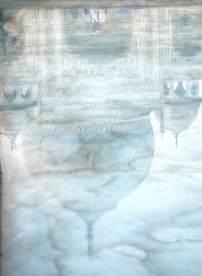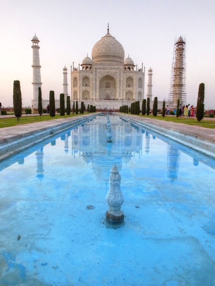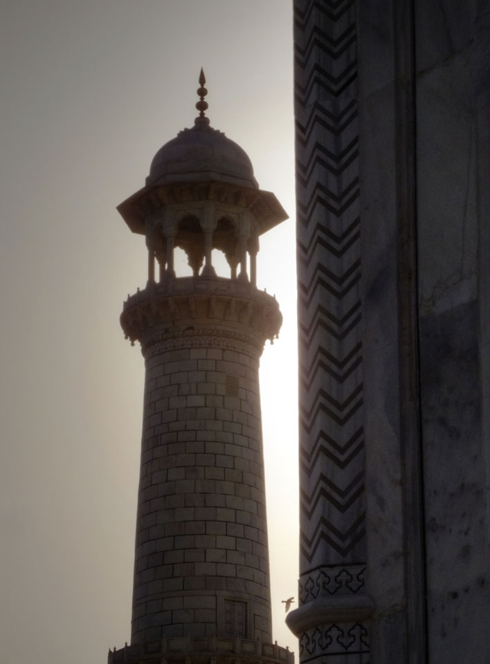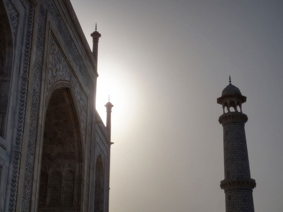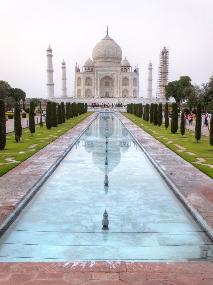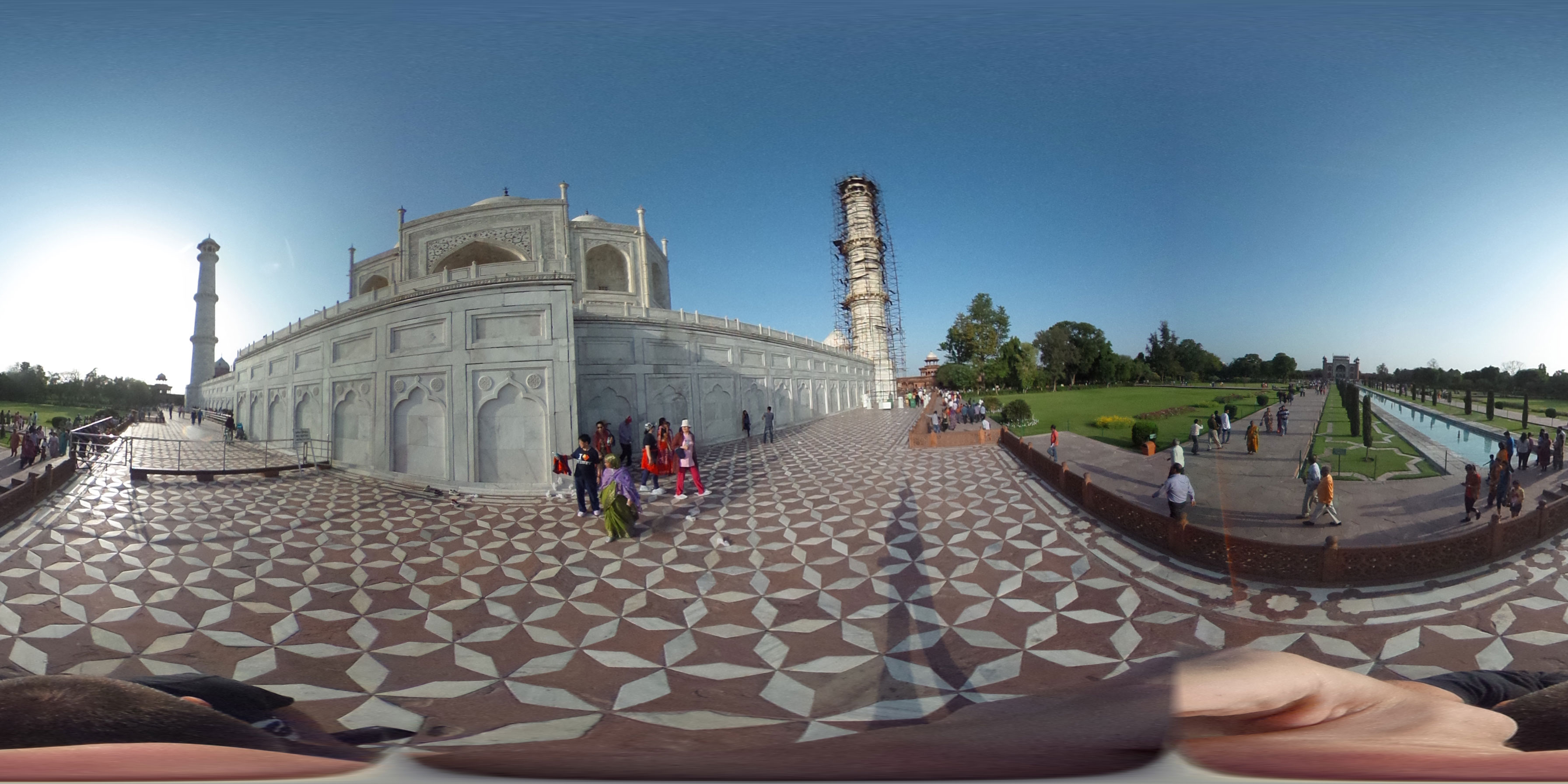 Draußen entspannte ich, hatte meine Überzieher schon abgegeben und ließ die Moscheen zu beiden Seiten damit gezwungenermaßen unbesucht. So saß ich etwas auf einer Parkbank, las im Buch. Immer wieder schaute ich vom Lesen auf, womit für mich ein interessanter Effekt entstand: aus der Buch-Welt von 1Q84 dann auf das Taj Mahal zu sehen, brachte etwas, wie wiederkehrende erste Eindrücke.